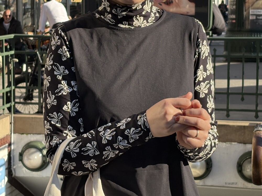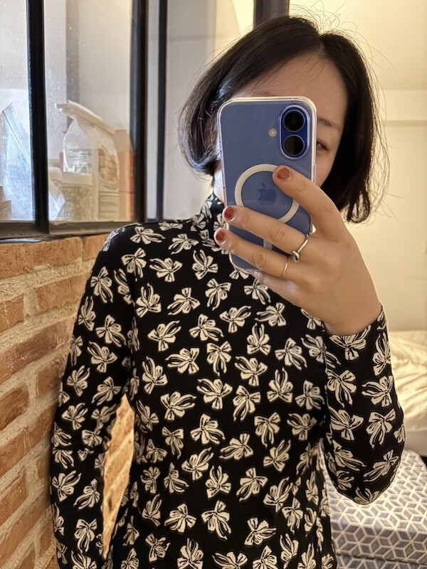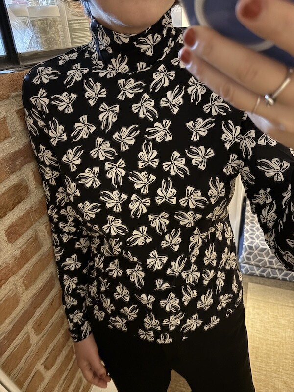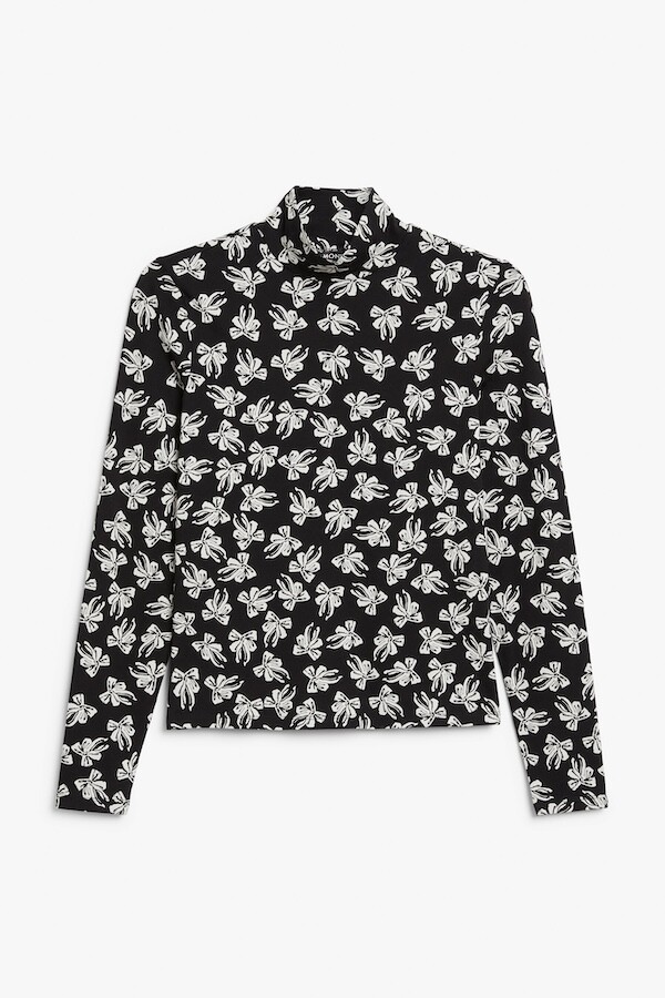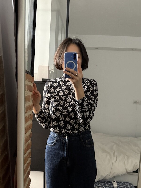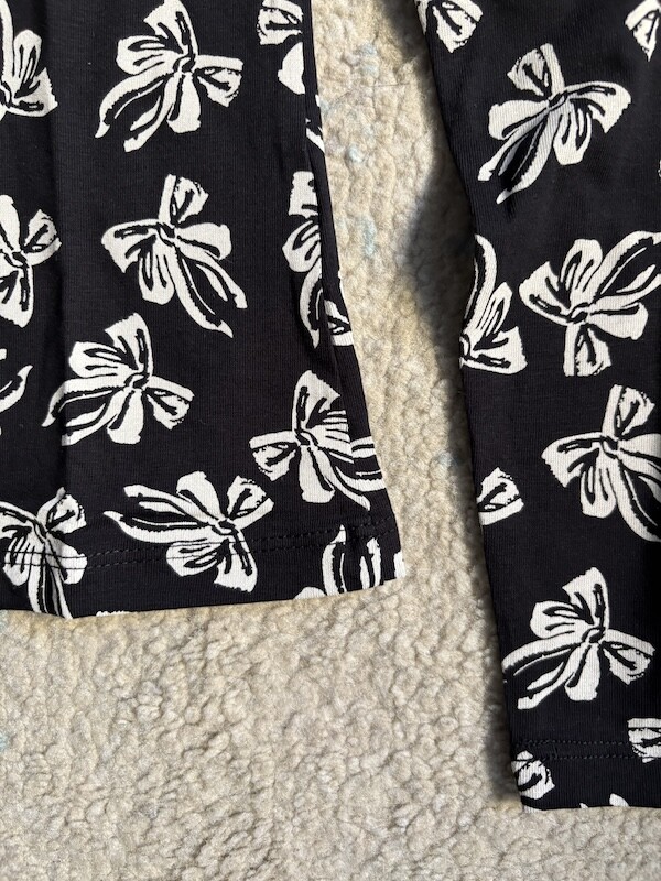 검정색 바탕에 흰색의 리본 모양이 프린트된 면 목폴라 티셔츠입니다. 쫀쫀한 목티로 단품으로 입어도 좋고 여기저기 받쳐 입으시기에도 좋을 거예요. 면과 엘라스탄 혼방 소재이지만 포근한 면의 느낌보다는 좀 더 매끈한 느낌이 들어서 캐주얼한 스타일에도, 좀 더 꾸민 듯한 스타일에도 잘 어울리더라고요.