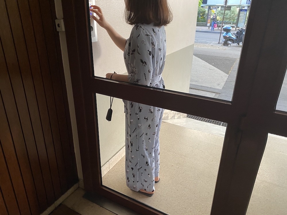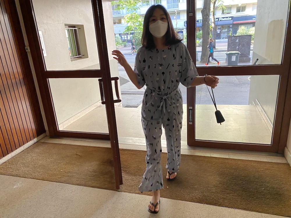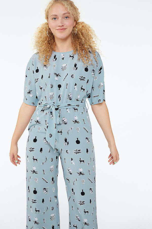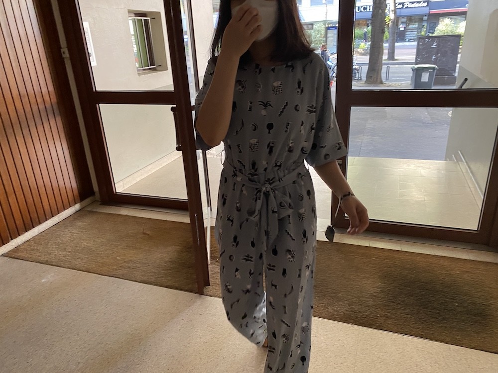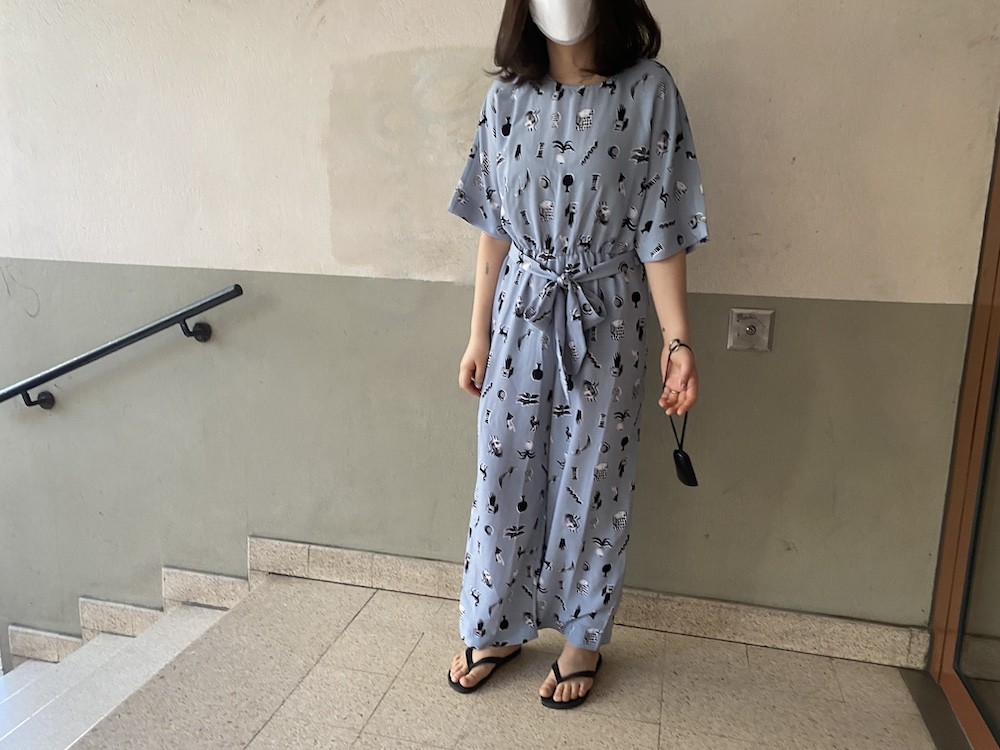 이 점프수트는 몽키 제품답게 우선 패턴이 예뻐요. 베이비 블루 바탕에 블랙 앤 화이트의 다양한 모양들이 프린트되어 있는데, 프린트된 모양들이 강한데도 색이 부드러워서 너무 튀지 않고 예쁘네요. 반팔이라 경쾌한 느낌도 나고요!