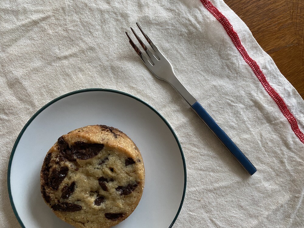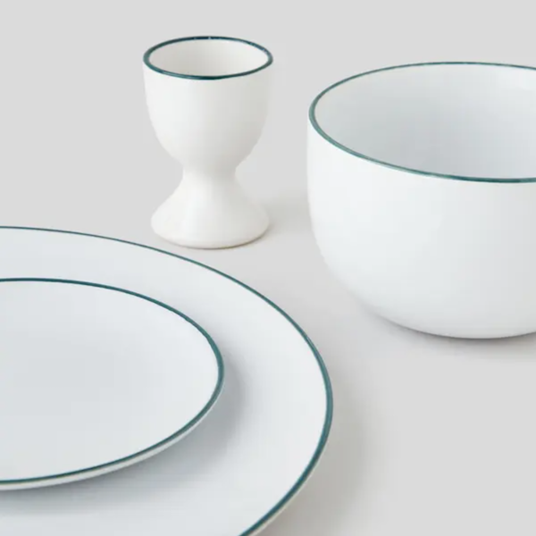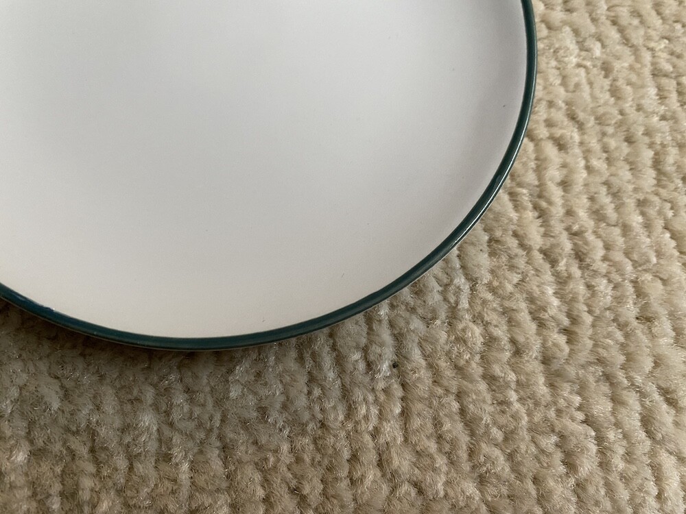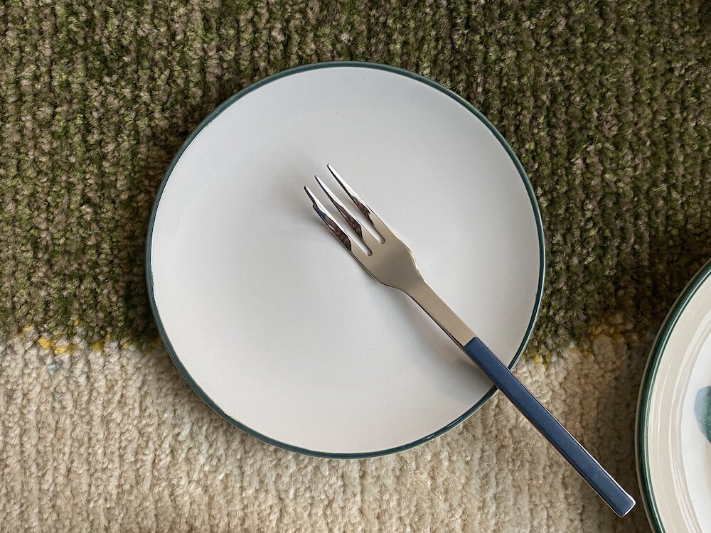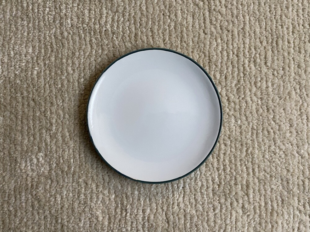초록 같기도 하고 파랑 같기도 한 라인이 테두리에 둘러진 접시로, 원래 사용 용도는 "빵을 올려놓는 접시" 예요. 모닝빵 하나 정도 올려놓기 딱 좋은 사이즈인데 사실 어떤 식재료를 올려 놓아도 좋아요. 이런 심플한 그릇은 어떤 음식에나 다 잘 어울려서 가지고 있으면 활용도가 진짜 높더라고요.