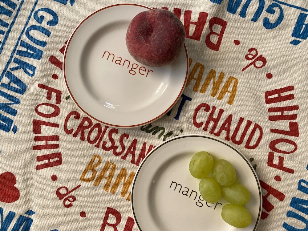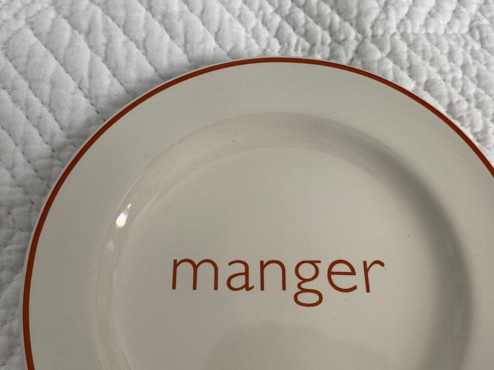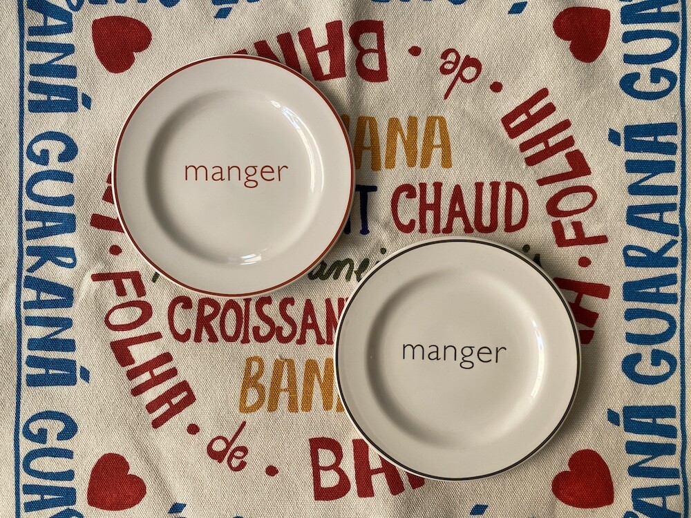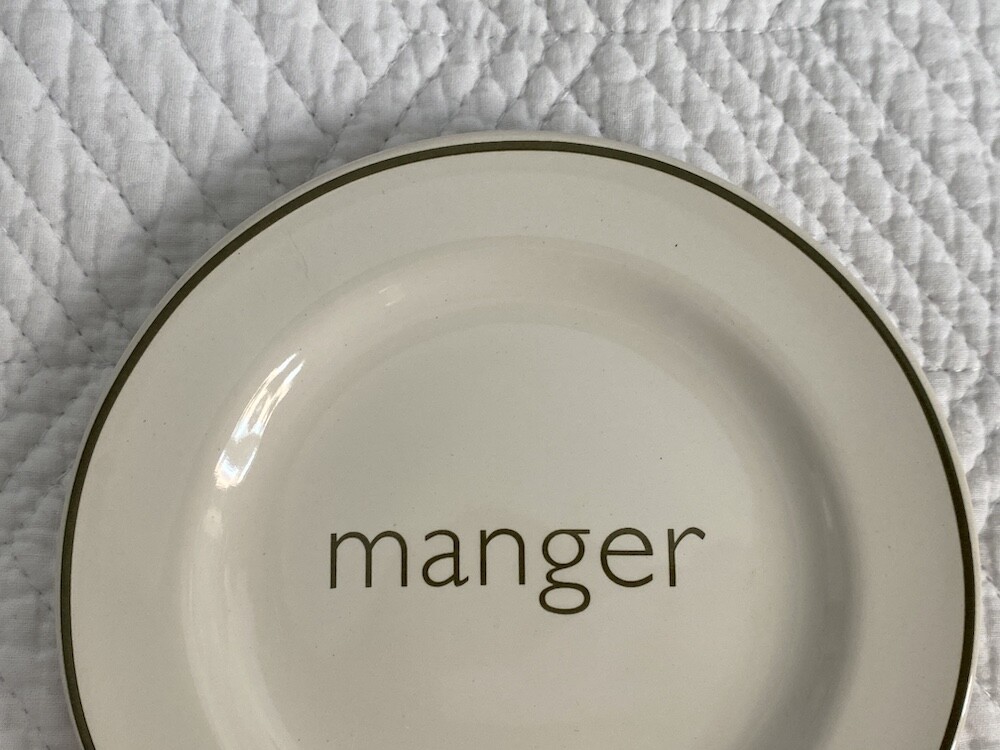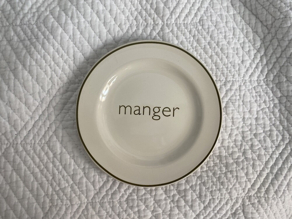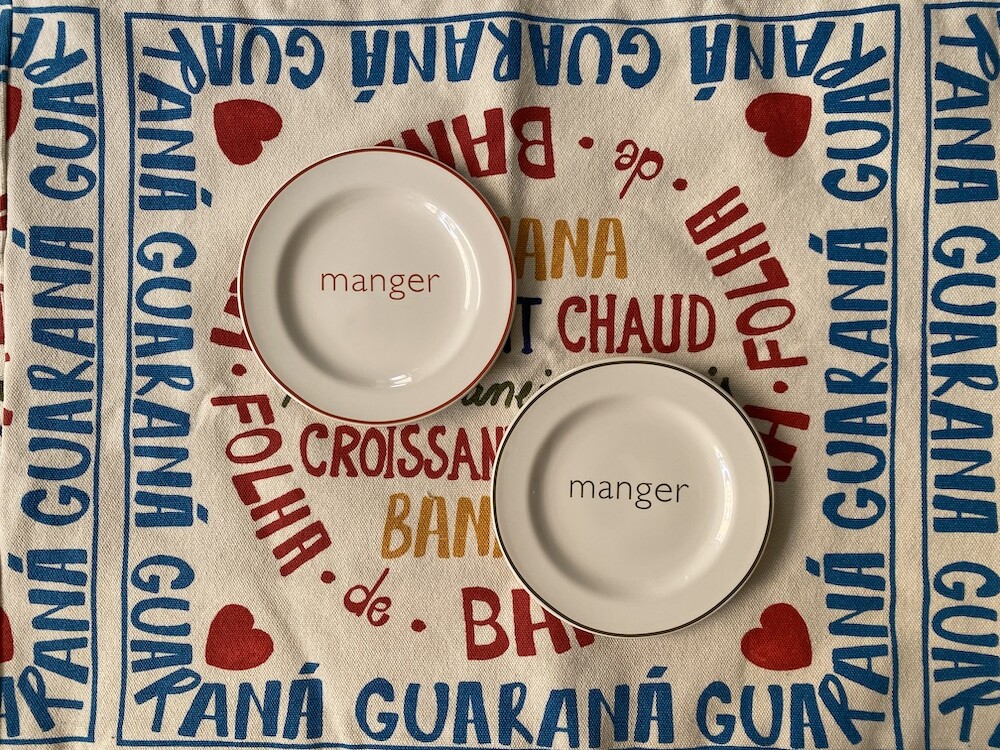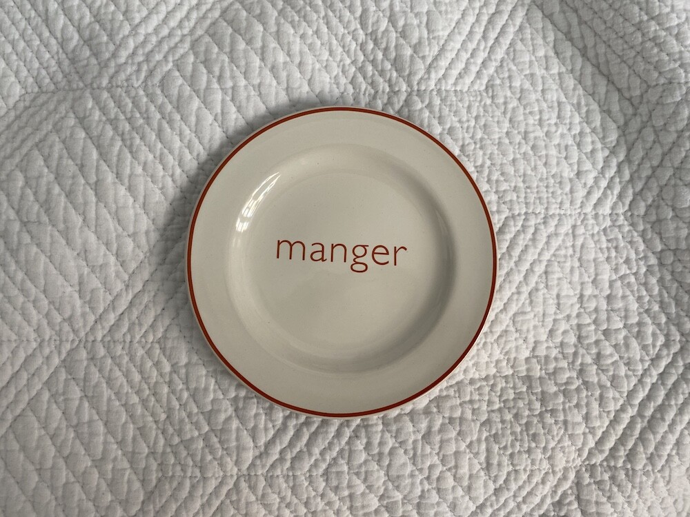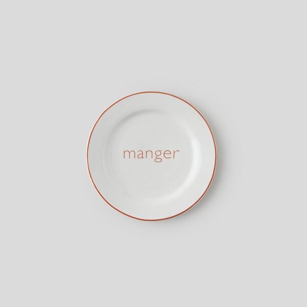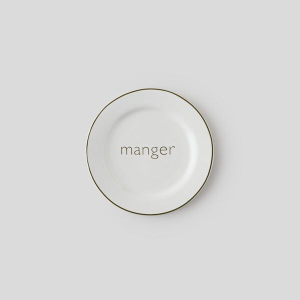모노프리와 테렌스 콘란(Terence Conran)의 콜라보로 만들어진 세라믹 소재의 접시로, 원래 사용 용도는 "빵을 올려놓는 접시" 예요. 모닝빵 하나 정도 올려놓기 딱 좋은 사이즈인데 사실 어떤 식재료를 올려 놓아도 좋아요. 그릇에 씌여진 'manger'라는 프랑스어는 '먹다'라는 뜻의 동사예요. 이 그릇 위에 올려진 어떤 음식이라도 맛있게 먹을 수 있을 것 같은 기분이 드네요. 완전 흰색이 아닌 크림색의 접시라 더 예쁜 것 같아요.