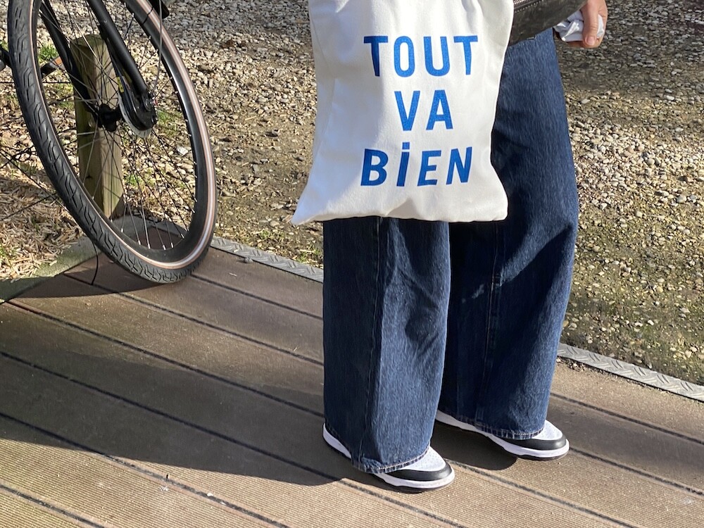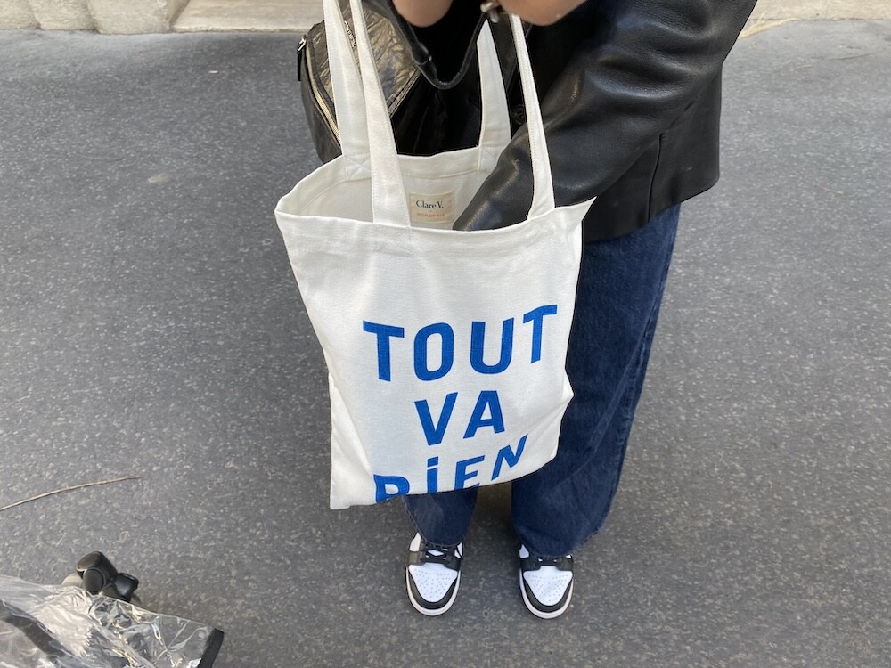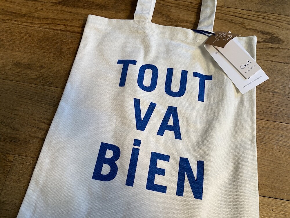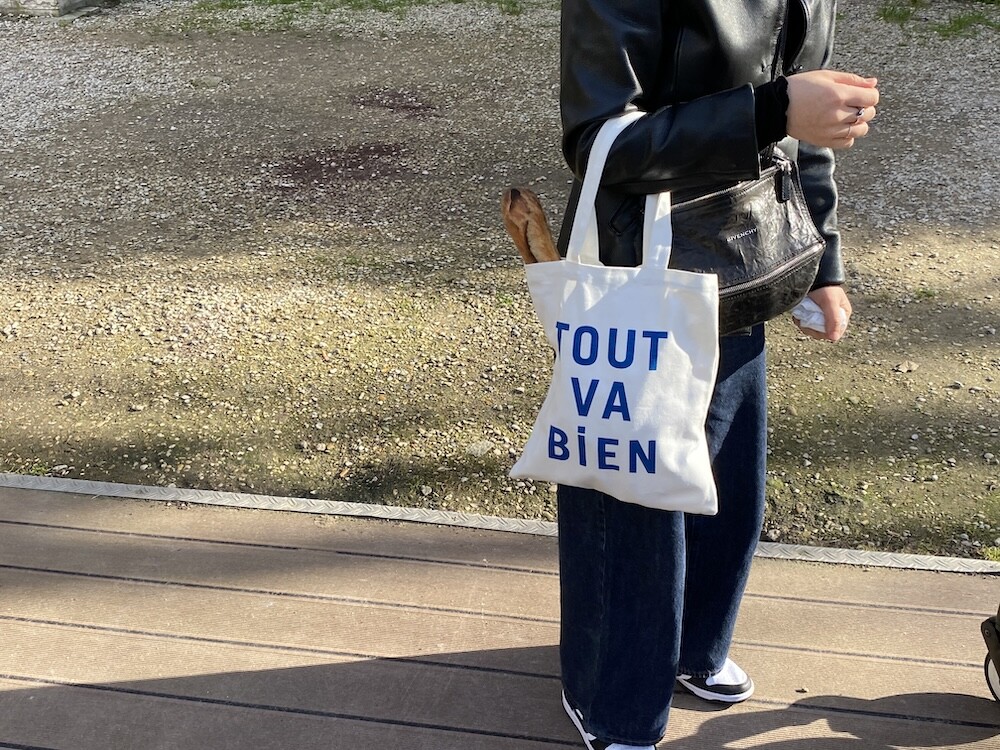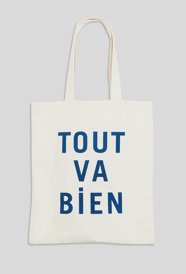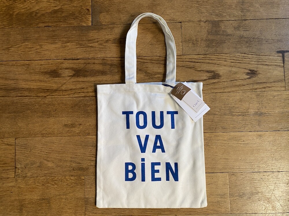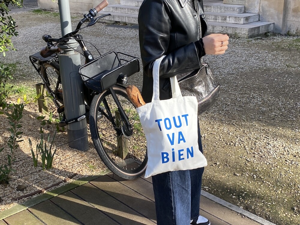 하얀색의 원단에 예쁜 파란색의 글씨가 프린트된 에코백이에요. 앞면에 써진 "뚜 바 비앙 TOUT VA BIEN"은 "괜찮아, 다 잘 될 거야."라는 뜻의 불어예요. 뒷면에는 깔끔하게 브랜드 이름이 써져 있어서 앞면으로 드나 뒷면으로 드나 예뻐요.