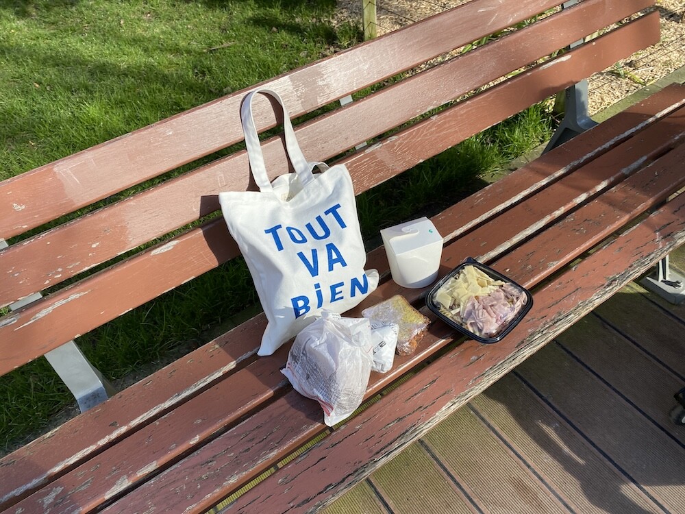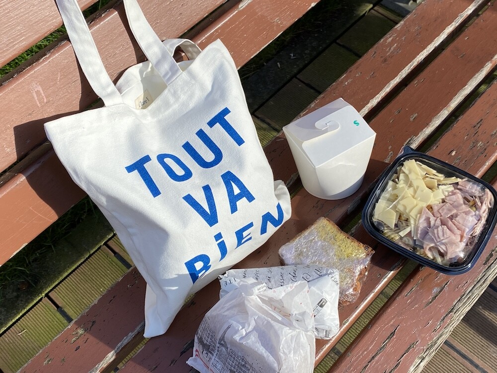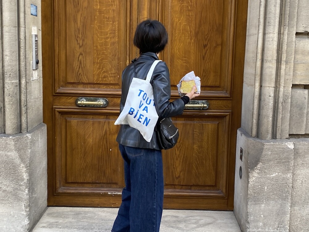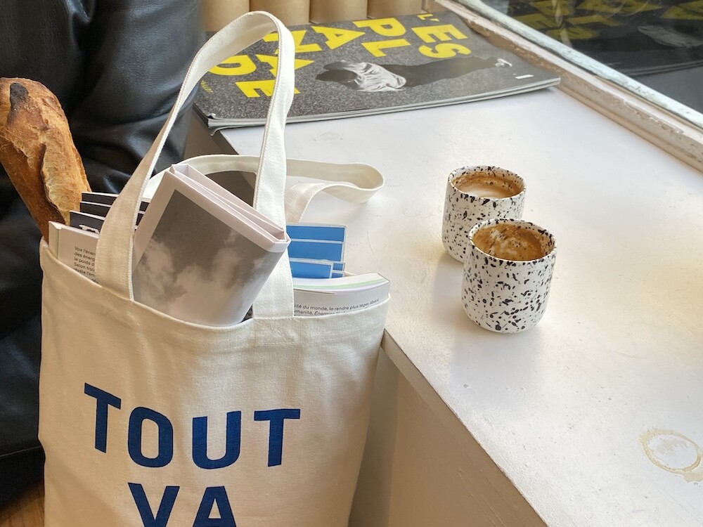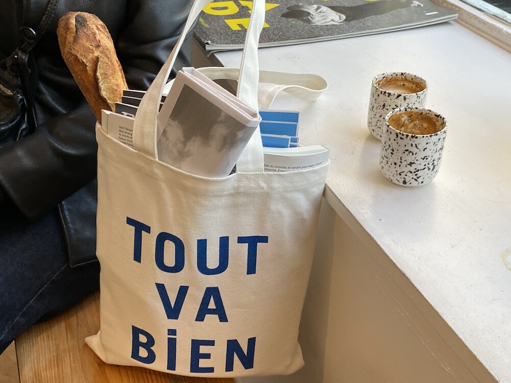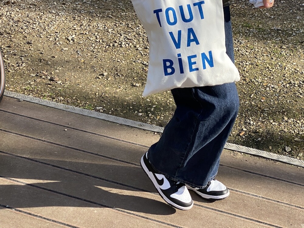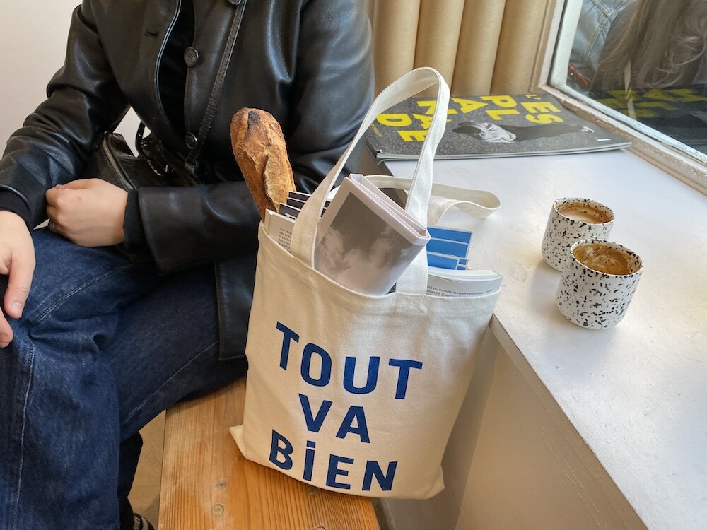 하얀색의 원단에 예쁜 파란색의 글씨가 프린트된 에코백이에요. 앞면에 써진 "뚜 바 비앙 TOUT VA BIEN"은 "괜찮아, 다 잘 될 거야."라는 뜻의 불어예요. 뒷면에는 깔끔하게 브랜드 이름이 써져 있어서 앞면으로 드나 뒷면으로 드나 예뻐요.