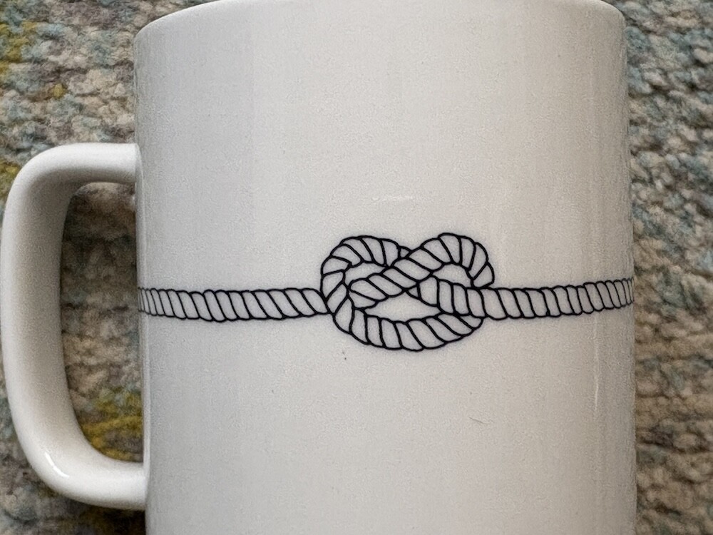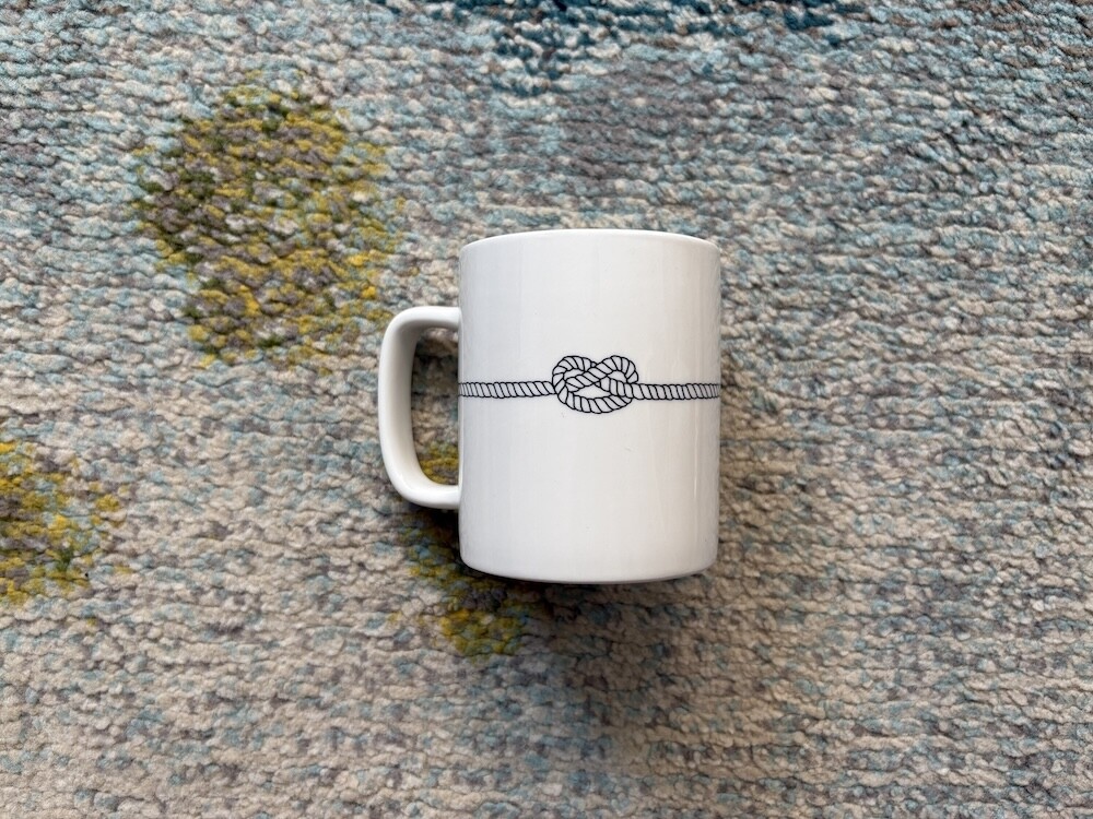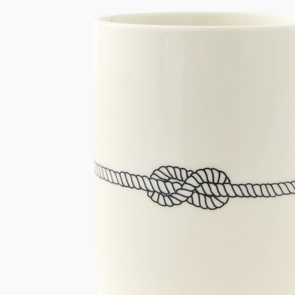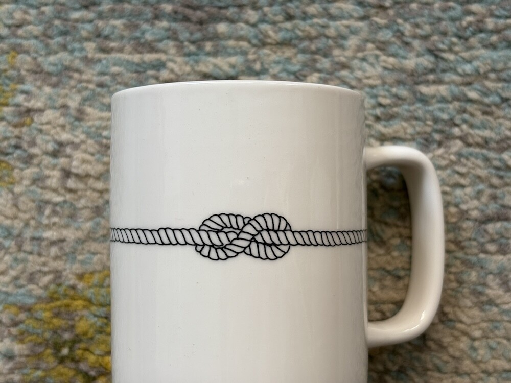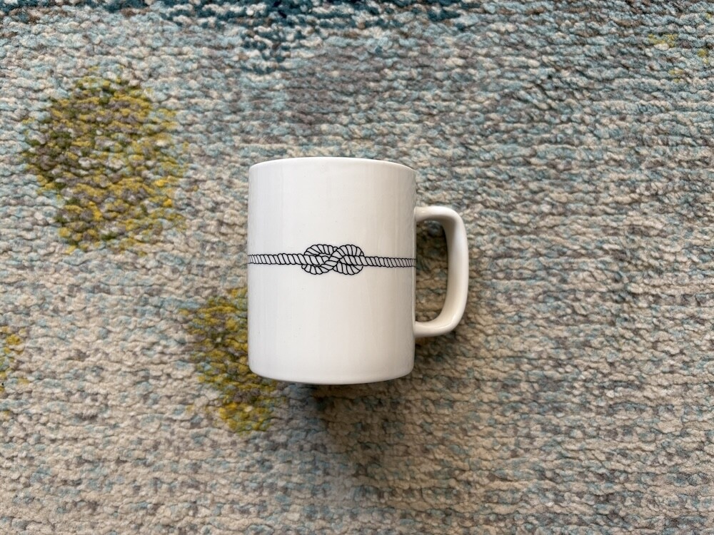 매듭 모양이 그려진 컵이에요. 컵의 중간에 매듭 모양이 심플하게 그려져 있는데 앞뒷면이 다르게 생겨서 재미있어요. 한쪽은 꽉 묶인 8자 모양 매듭이고 한쪽은 프레즐 같기도 하고 하트 모양 같기도 한 매듭이에요. 맑은 빛이 나는 본차이나 세라믹이라 청량한 느낌이 나서 더 예쁜 것 같아요. 참, 본차이나는 소의 뼛가루를 최소 30프로 사용한 도자기를 말한다고 합니다.