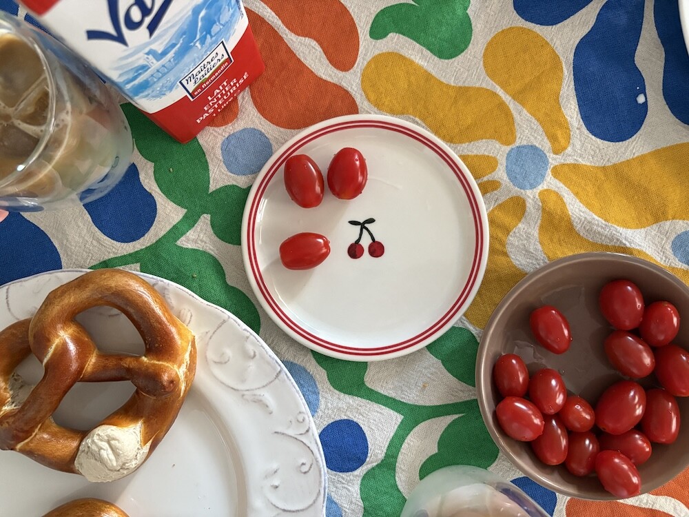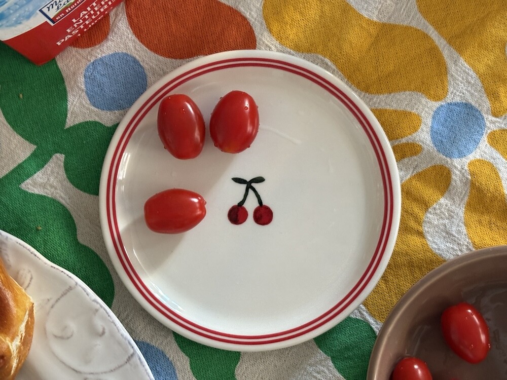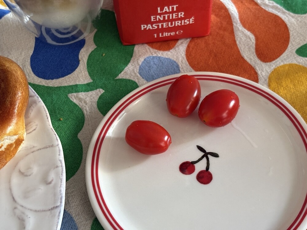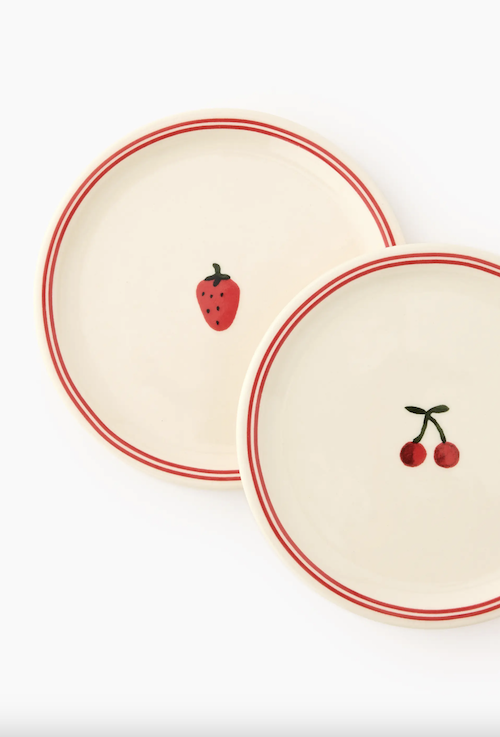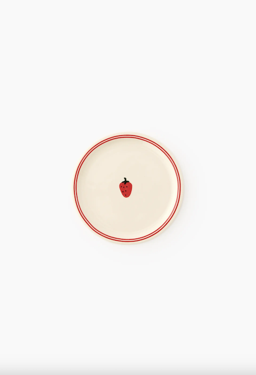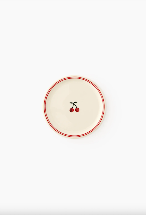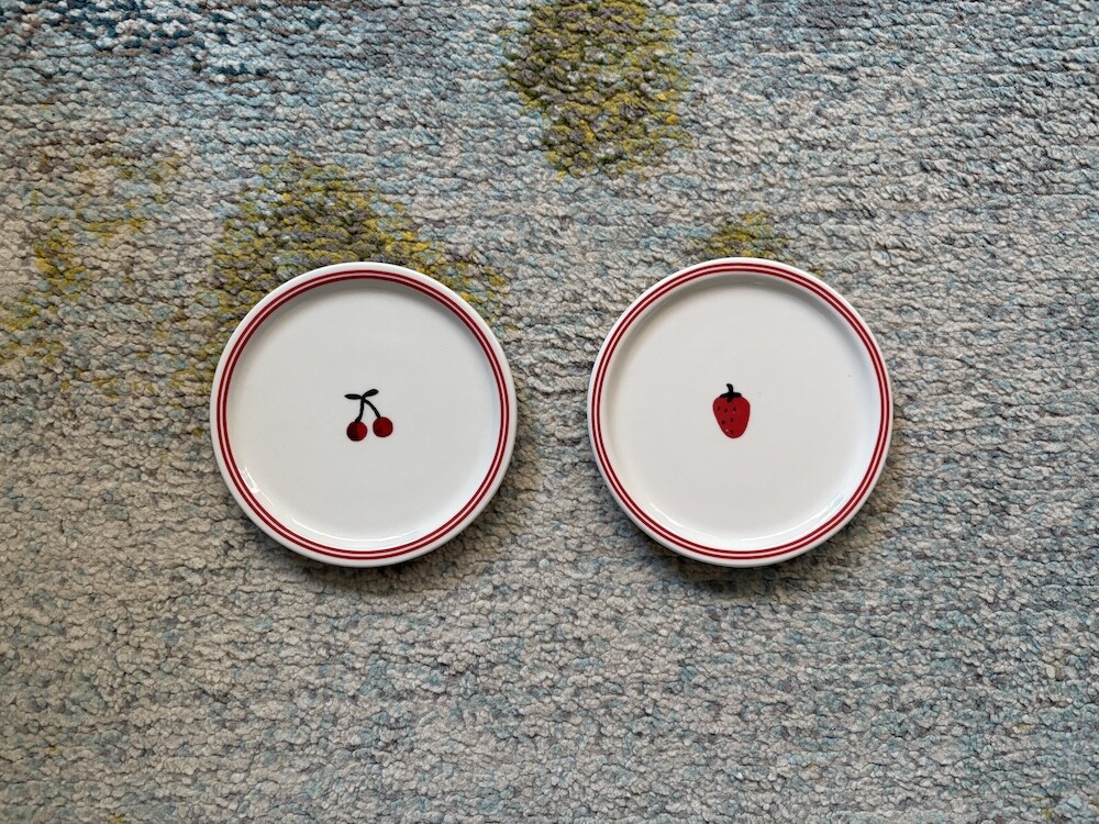 손으로 그린 것 같은 귀여운 과일 그림이 프린트된 접시로, 테두리에 둘러진 빨간 선이 프랑스 스타일을 잘 보여 주는 것 같아요. 원래 사용 용도는 "빵을 올려놓는 접시" 예요. 모닝빵 하나 정도 올려놓기 딱 좋은 사이즈인데 사실 어떤 식재료를 올려 놓아도 좋아요. 음식을 다 먹고 나면 뿅하고 등장하는 귀여운 딸기와 체리 그림 덕분에 식탁에 그릇을 올려놓는 것만으로도 기분이 좋아질 거예요.