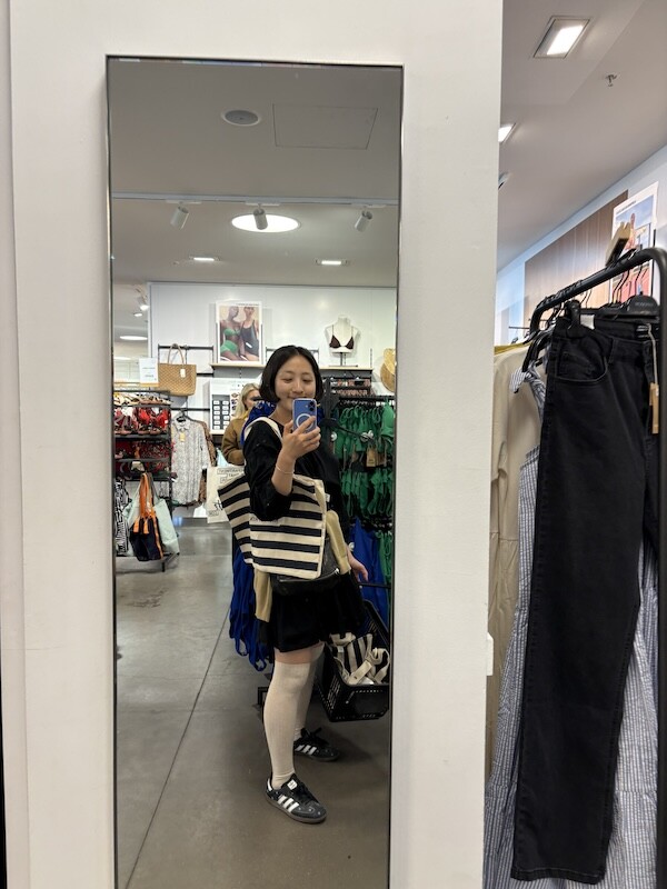 네이비 가로 스트라이프 패턴의 에코백입니다. 박스형 가방이라 장 본 물건들을 넣을 때 뿐만 아니라 책, 노트북 같은 물건들을 넣어 들고 다닐 때에도 좋아요. 특히 세로보다 가로가 긴 형태의 직사각형 에코백이라 물건들을 안정적으로 담을 수 있어서 좋더라고요. 또 심플한 스트라이프 패턴이라 어떤 옷에나 다 잘 어울려요.