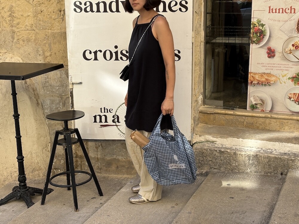장볼 때 가볍게 들 수 있는 장바구니입니다. 아마 프랑스 사람들이 가장 많이 드는 가방을 꼽으라면 모노프리 가방을 꼽을 수 있을 거예요. 그만큼 대중적이고, 길거리에서 쉽게 볼 수 있는 가방입니다. 계속해서 새로운 패턴의 장바구니가 나오는데, 지나간 모양은 다시 나오지 않기 때문에 마음에 드는 게 있을 때 사야 해요. 작게 접어 가방에 넣어 가지고 다니다가 필요할 때 꺼내 쓰기 아주 좋을 거예요.