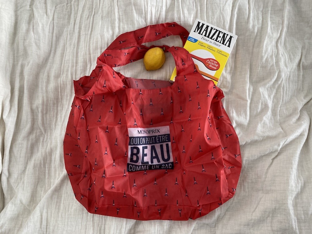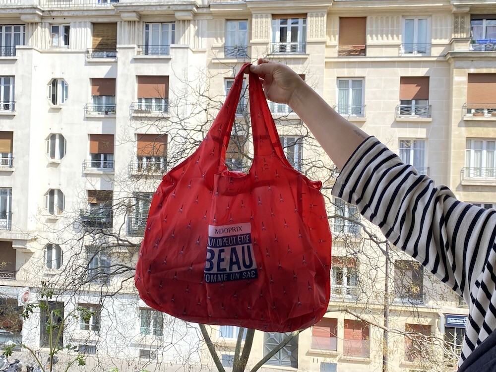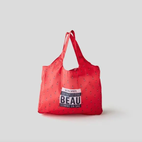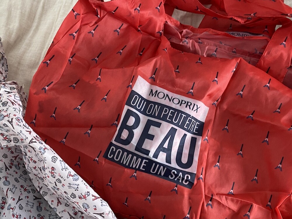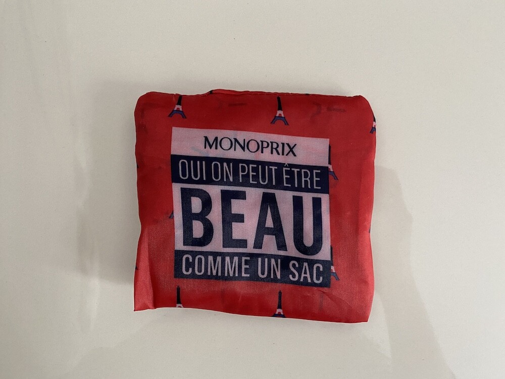 가방에는 마트의 이름인 MONOPRIX와 함께 "OUI ON PEUT ÊTRE BEAU COMME UN SAC"이라고 씌여져 있어요. 이건 "맞아요. 우린 가방처럼 멋있어질 수 있어요."라는 뜻인데, 이 가방이 멋있다는 걸 이렇게 표현한 것 같아요.