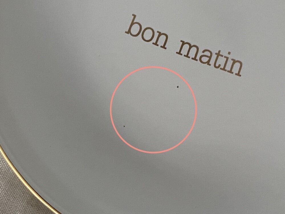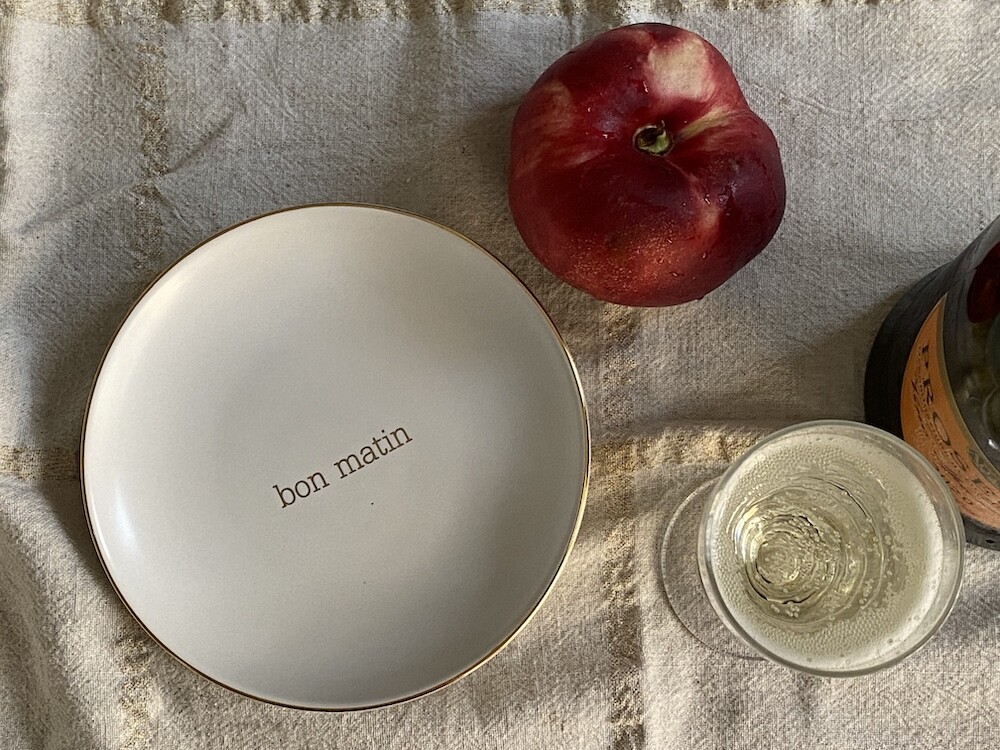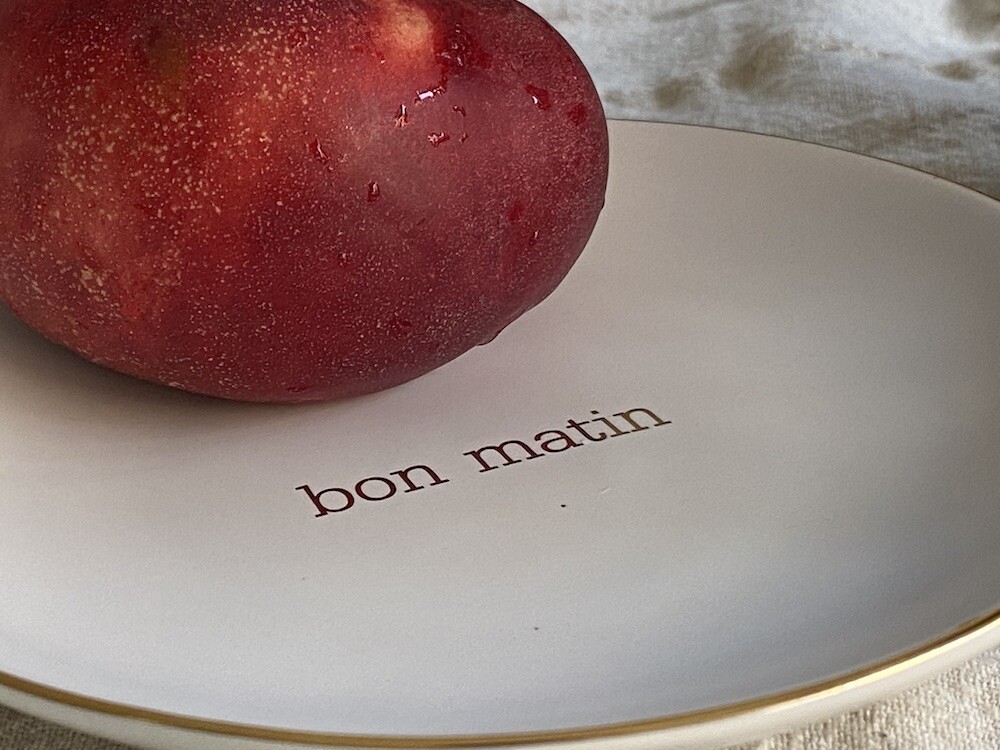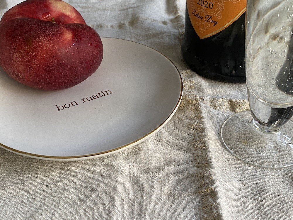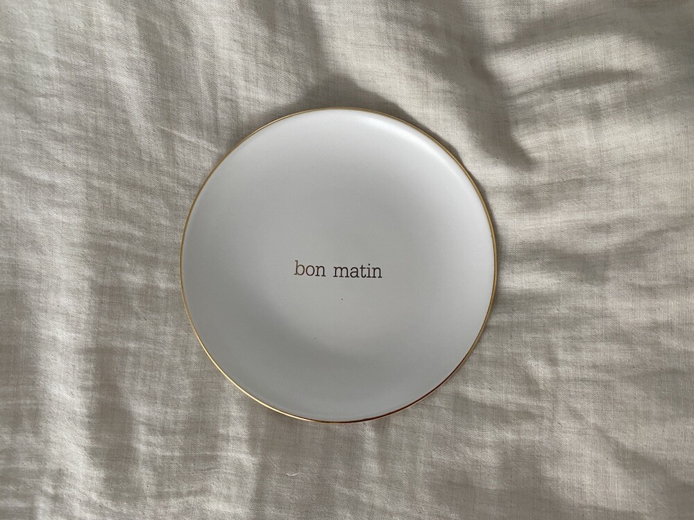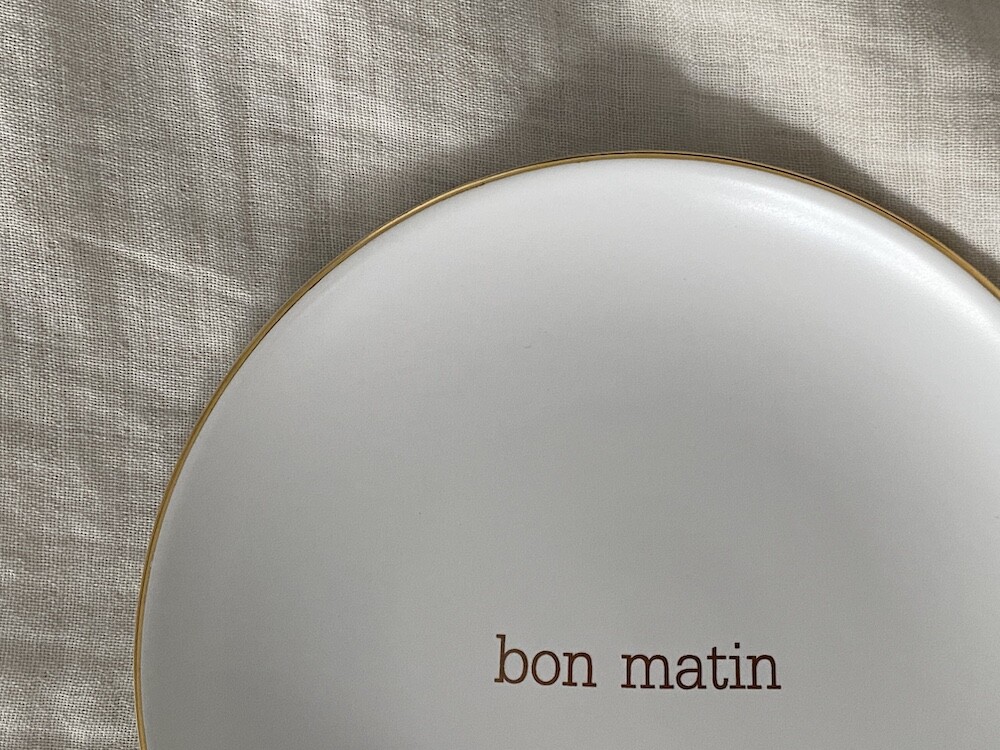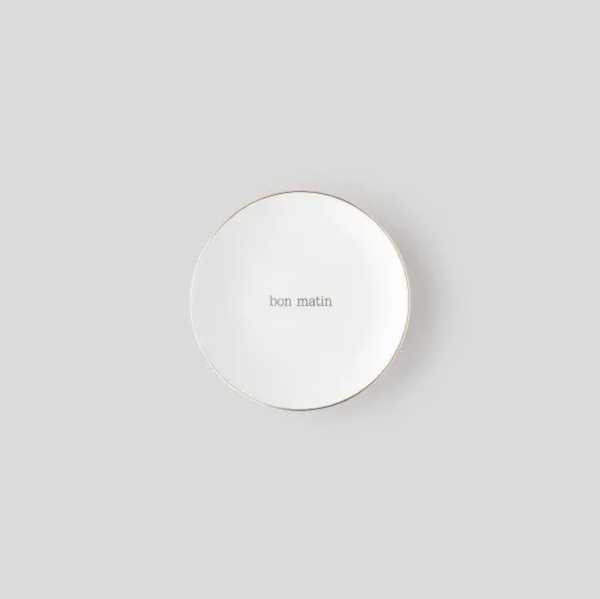 이 접시는 도기재의 접시로, 원래 사용 용도는 "빵을 올려놓는 접시" 예요. 모닝빵 하나 정도 올려놓기 딱 좋은 사이즈인데 사실 어떤 식재료를 올려 놓아도 좋아요. 접시 둘레의 금색 테두리와 bon matin(좋은 아침)이라고 써진 금색 글씨도 너무 예뻐요. 이 접시와 함께라면 즐거운 아침을 시작할 수 있을 것 같아요.