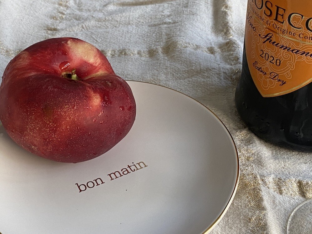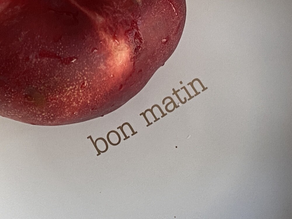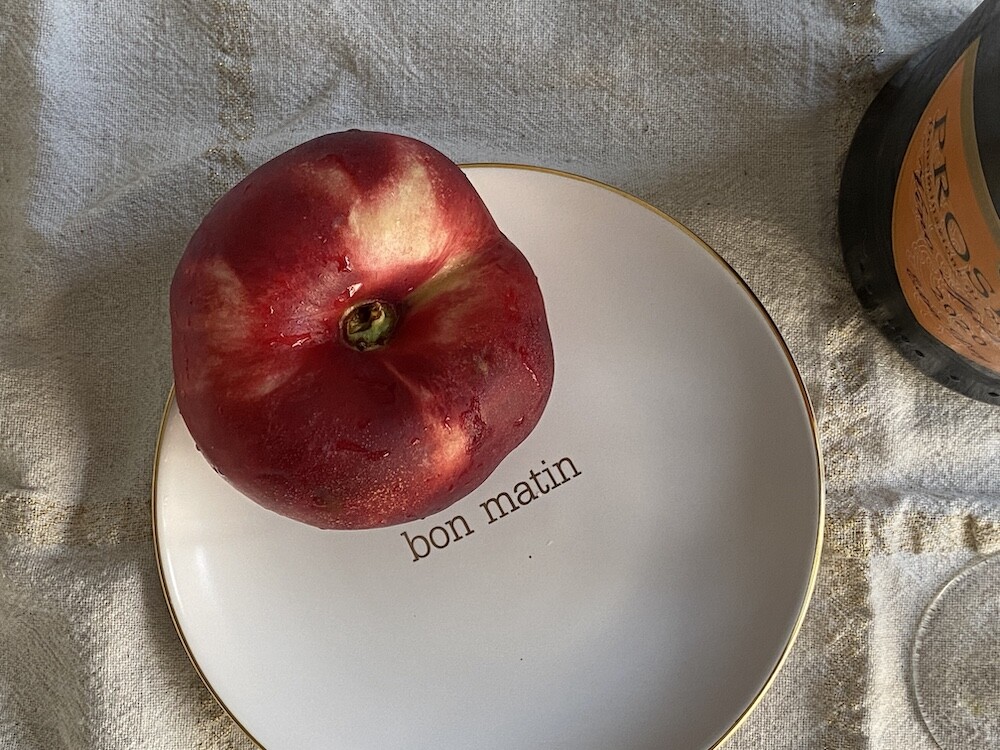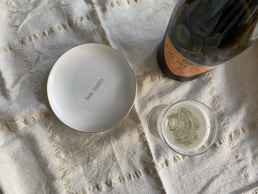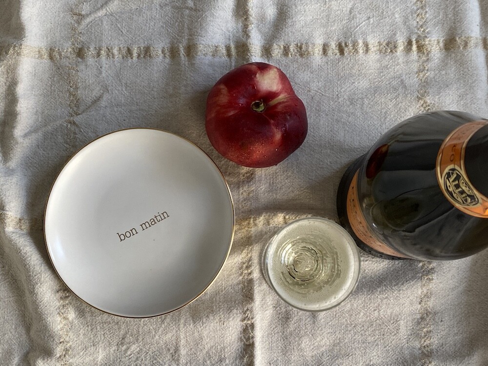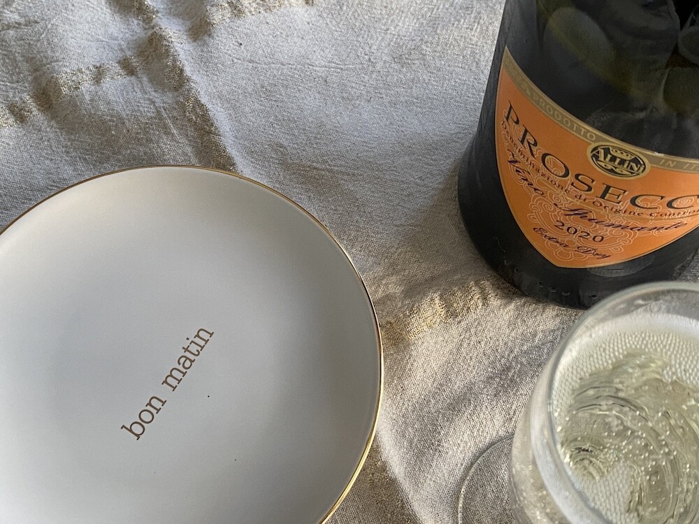 이 접시는 도기재의 접시로, 원래 사용 용도는 "빵을 올려놓는 접시" 예요. 모닝빵 하나 정도 올려놓기 딱 좋은 사이즈인데 사실 어떤 식재료를 올려 놓아도 좋아요. 접시 둘레의 금색 테두리와 bon matin(좋은 아침)이라고 써진 금색 글씨도 너무 예뻐요. 이 접시와 함께라면 즐거운 아침을 시작할 수 있을 것 같아요.