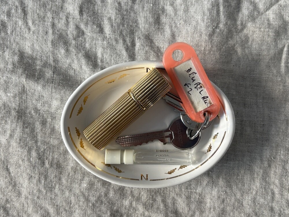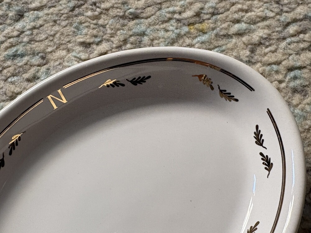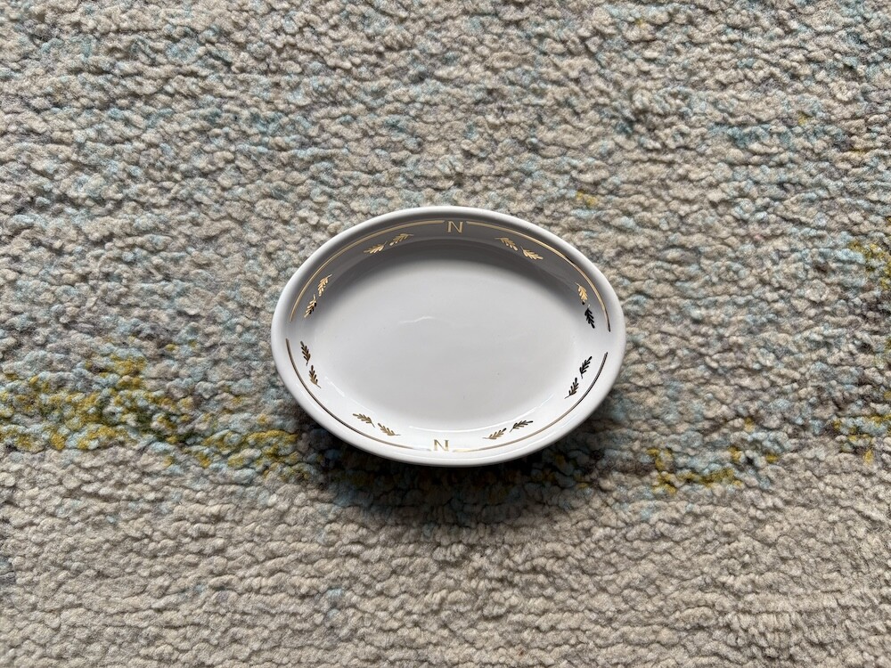 나폴레옹 서거 200주년을 기념하는 전시회를 위해 만들어진 비누 받침이에요. 이 비누 받침에는 나폴레옹을 상징하는 엠블렘 두 가지가 사용되었는데요. 하나는 팔메트 palmettes라고 불리는 식물 모양 장식이고 하나는 나폴레옹의 N입니다. 이 두 가지 장식이 금색으로 예쁘게 띠를 그리며 둘러져 있어요.