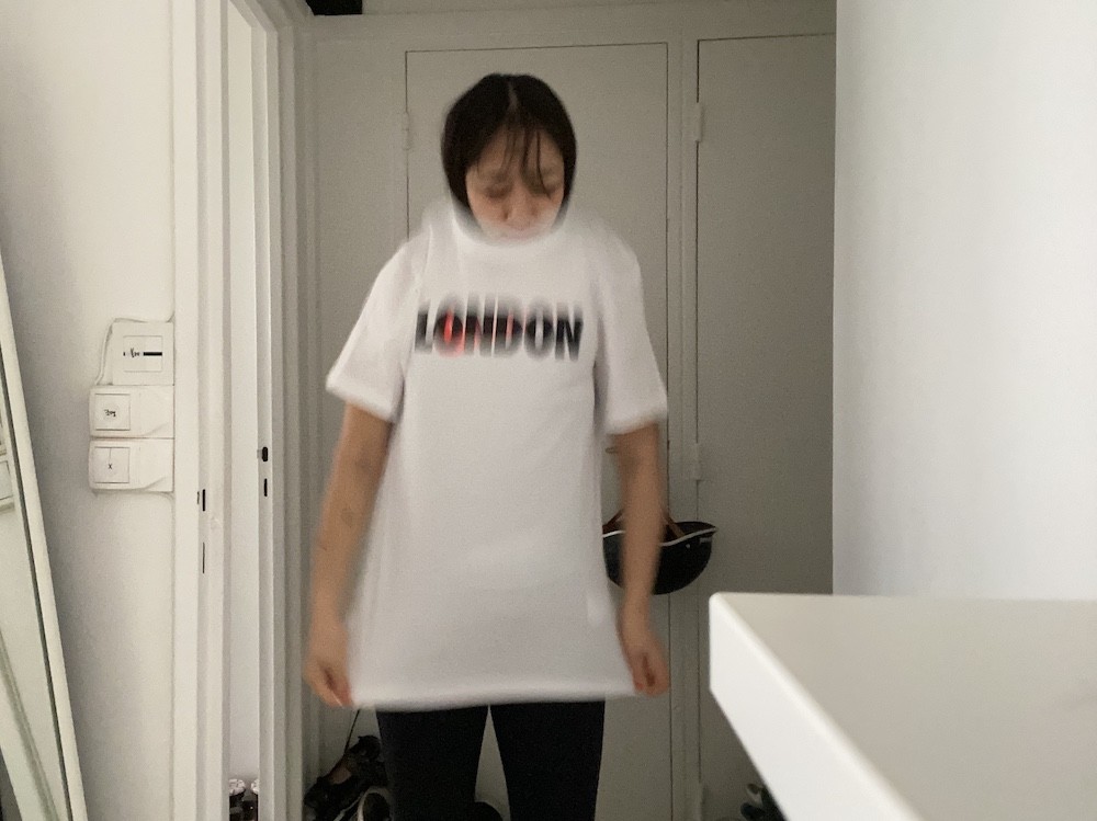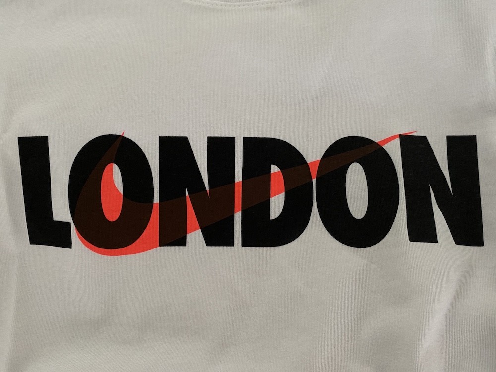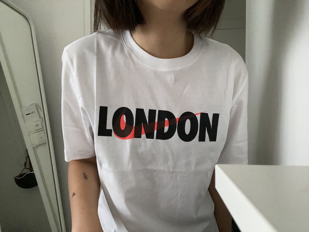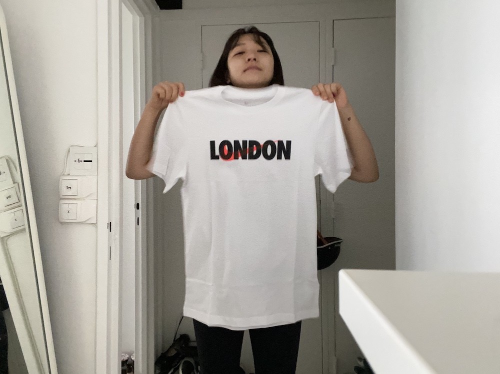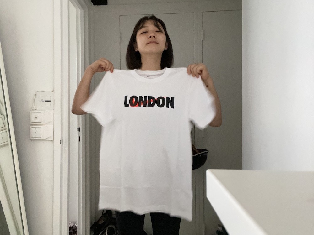 형광 분홍색 나이키 표시와 런던LONDON 이라는 글씨가 잘 어우러진 티셔츠로, 단독으로 입어도 가디건과 함께 입어도 너무 예뻐요. 남성용 S 사이즈라 마른 남성분들 뿐 아니라 여성분들이 입으시기에도 좋습니다. 길이가 좀 긴편이라 개인적으로는 안으로 넣어입는 게 더 예쁜 것 같아요.