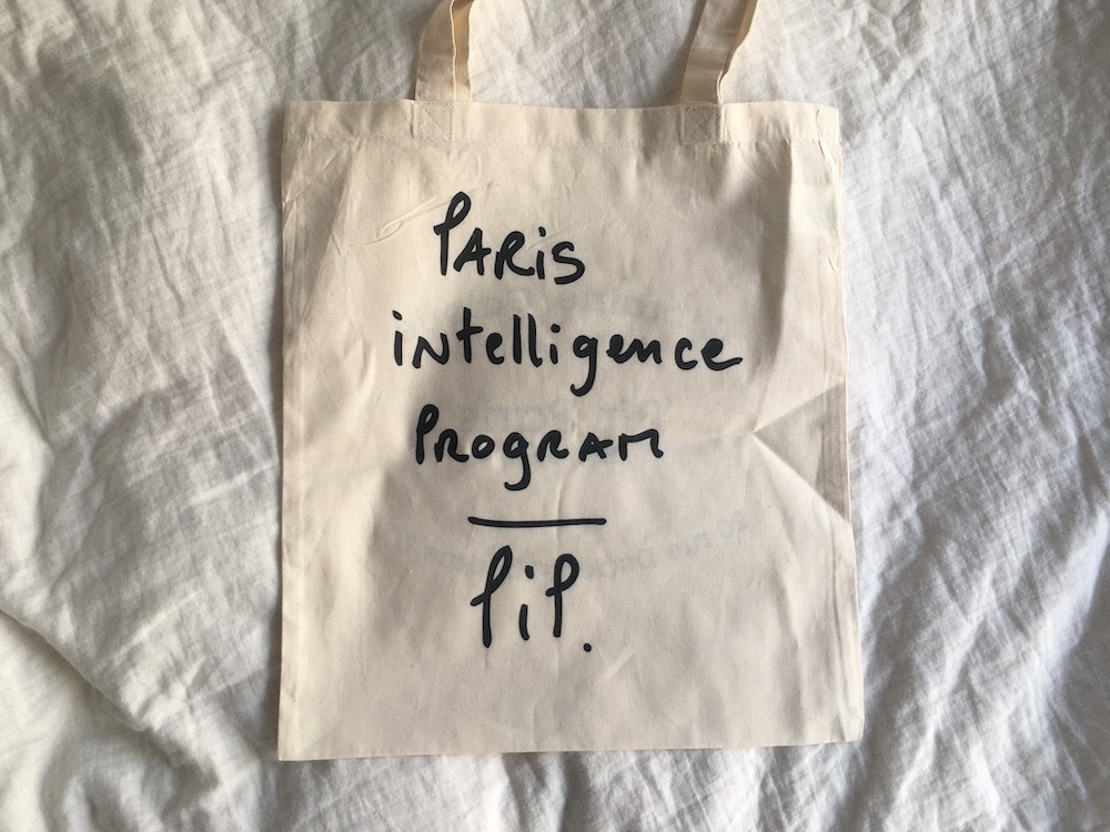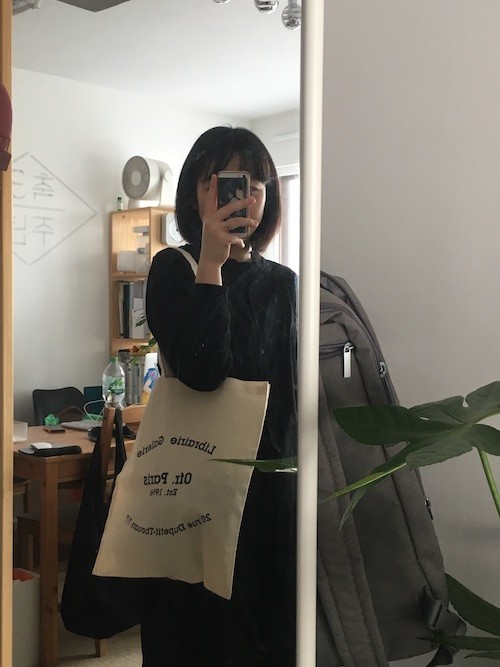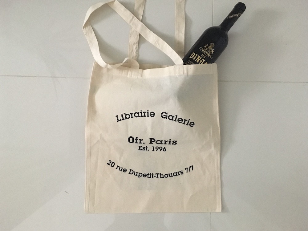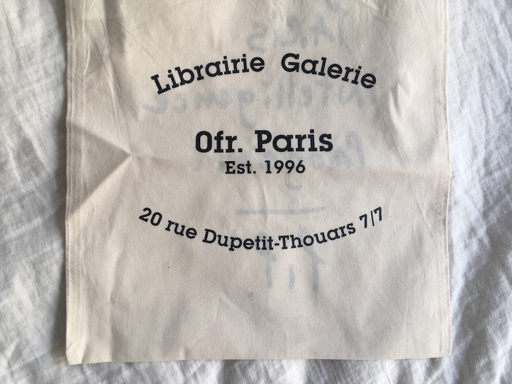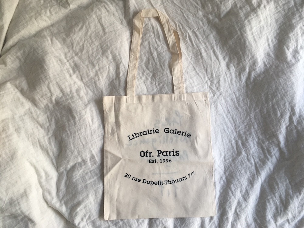 Ofr. Paris의 에크루색, 뒷면 글씨 에코백입니다. 사장님께서 직접 쓰신 글씨가 써진 에코백으로 이 모델이 Ofr의 가장 기본 모델이라고 해요.