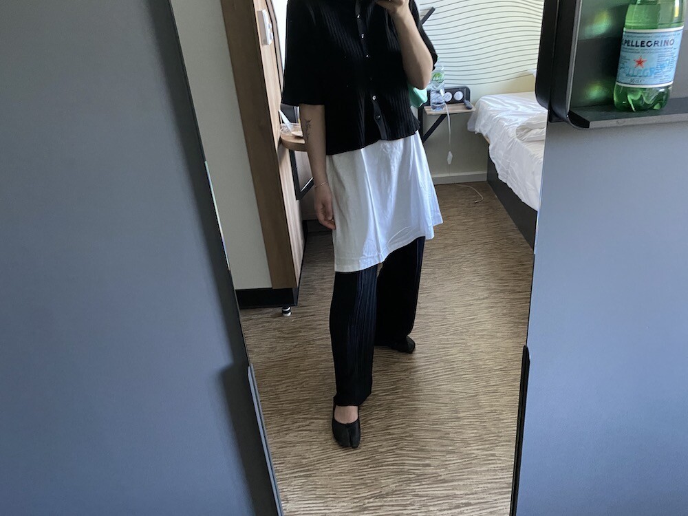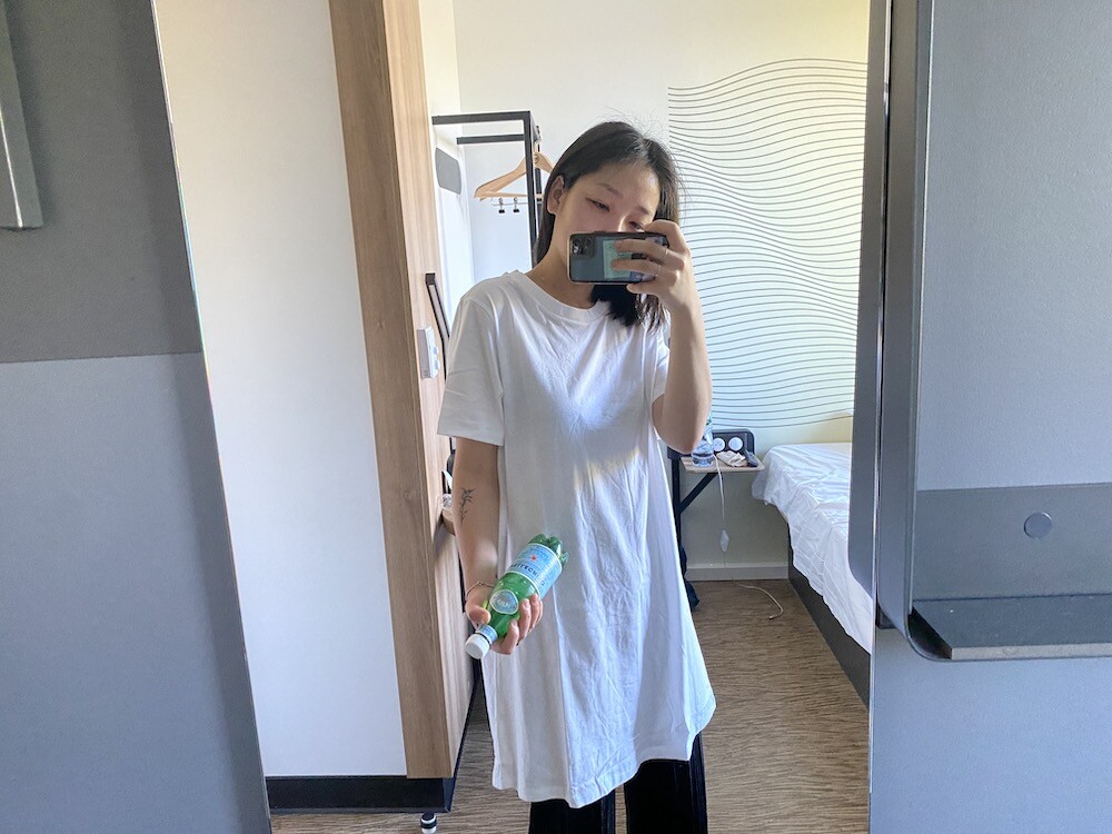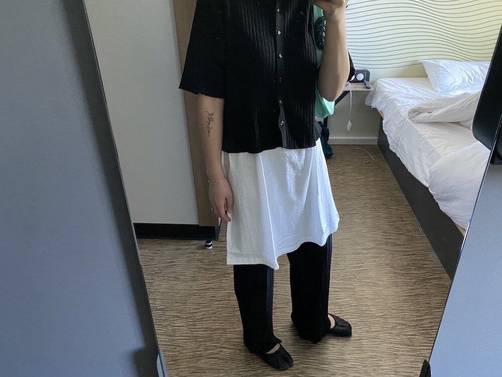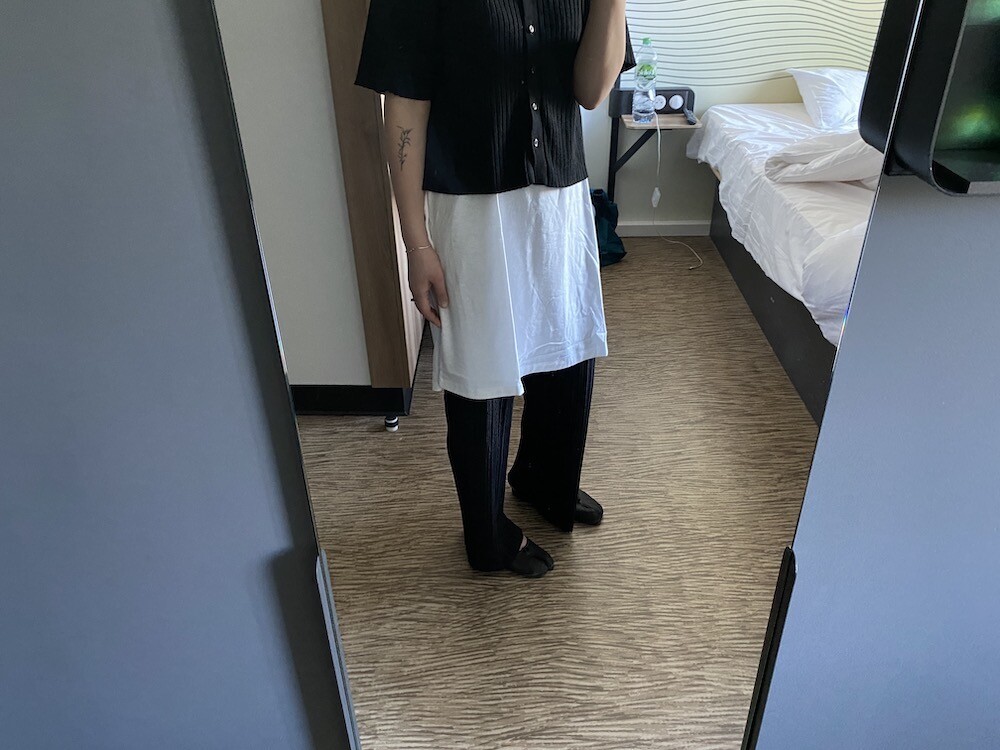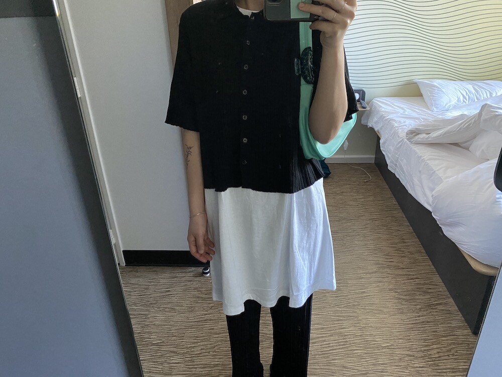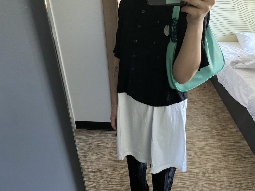 두꺼운 원단이 아니라 비침이 있어요. 저는 속옷이 비쳐도 크게 상관 안 하기 때문에 그냥 입지만, 안에 슬립 같은 것 입으시고 티셔츠를 입으시면 부담 없이 원피스처럼 연출하실 수 있으실 거예요. 레이어드용으로 입으셔도 예뻐요.