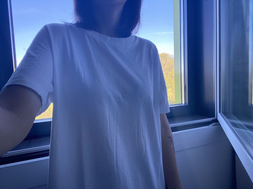 무지 화이트 롱 티셔츠입니다. 이런 티셔츠는 흐물흐물 헐렁해야 예쁘죠! 저는 엉덩이를 가리는 디자인의 옷들을 좋아하는데, 롱 티셔츠는 가슴이나 엉덩이쪽이 조금만 끼어도 엄청 부해 보여요. 그래서 이 제품은 라지 사이즈만 진행을 합니다. 너무 마르신 분들께는 맞지 않을 수 있으니 상세 사이즈를 확인해 주세요.