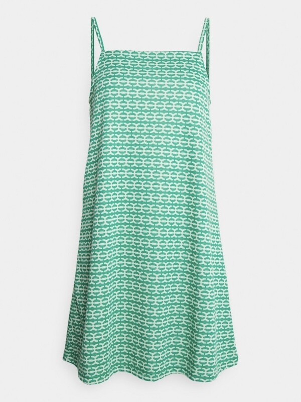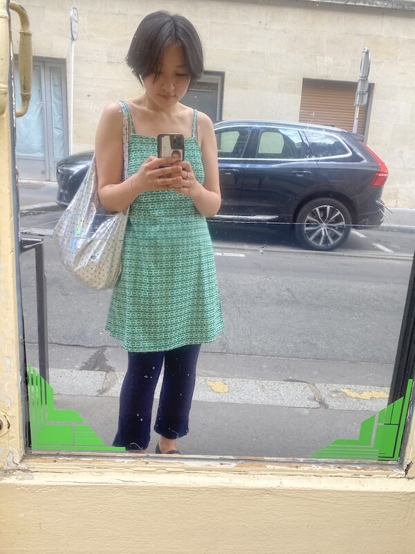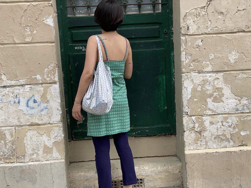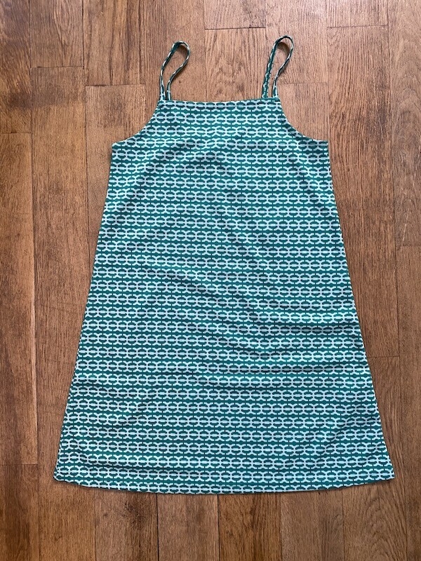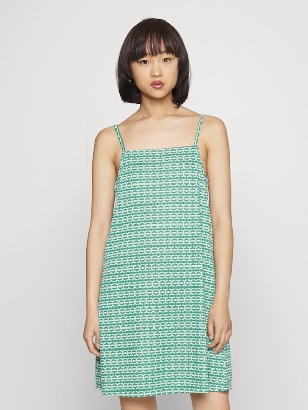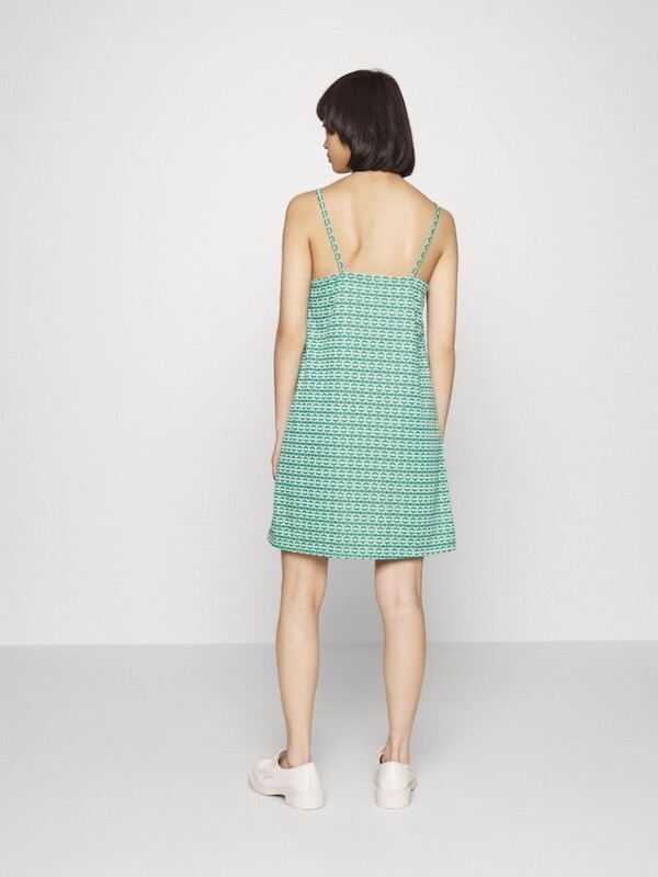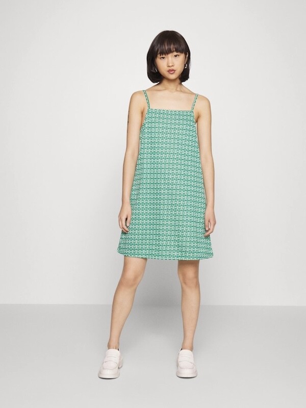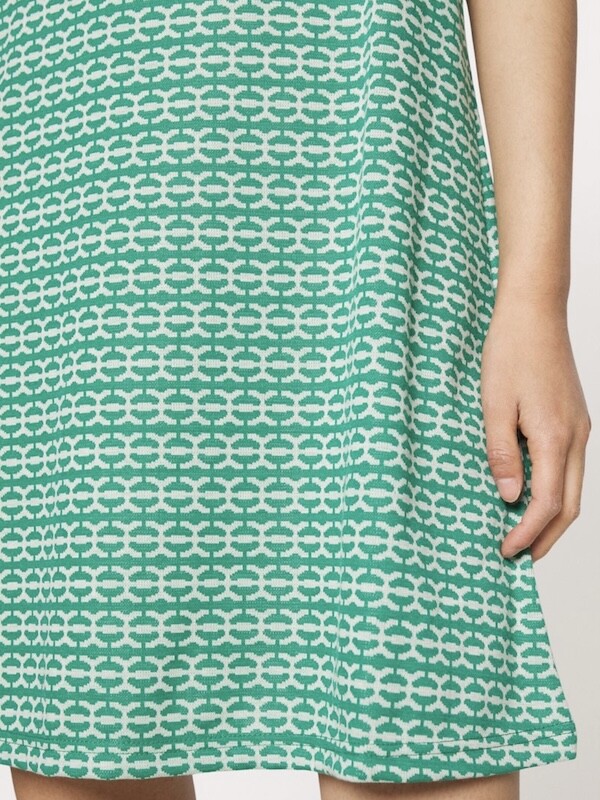 니트처럼 짜여진 에이라인 원피스예요. 초록색과 흰색의 패턴이 예쁘고 A라인이라 귀여운 느낌이 있어요. 특히 개인적으로는 네크라인 부분이 훅 파이지 않아서 마음에 들더라고요. 원피스만 입어도 예쁘지만 상의와 바지를 함께 입어도 예뻐서 사계절 내내 다양하게 입게될 것 같아요.