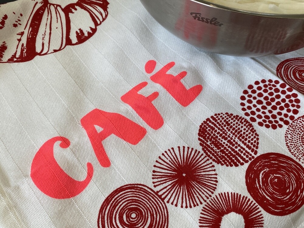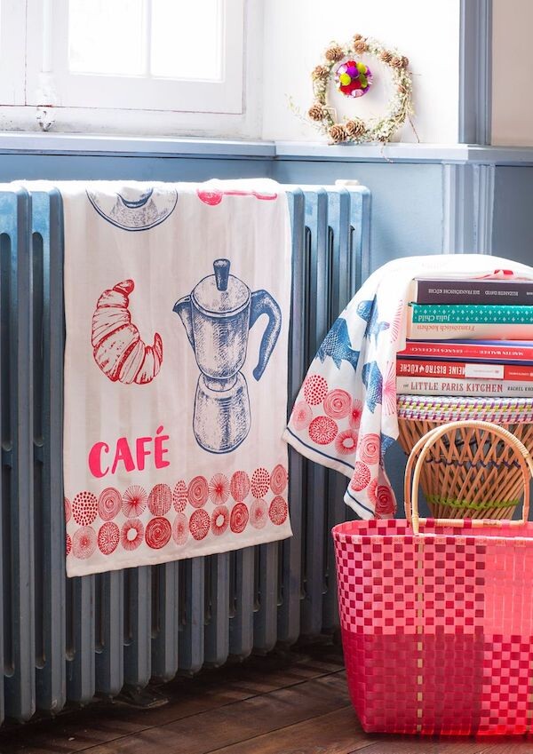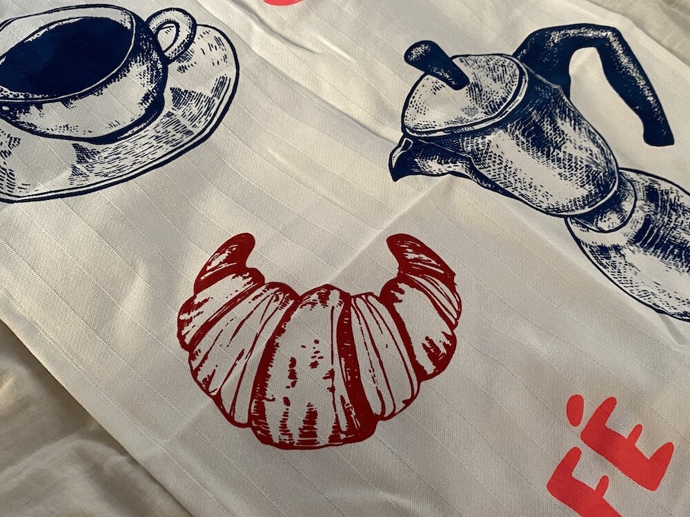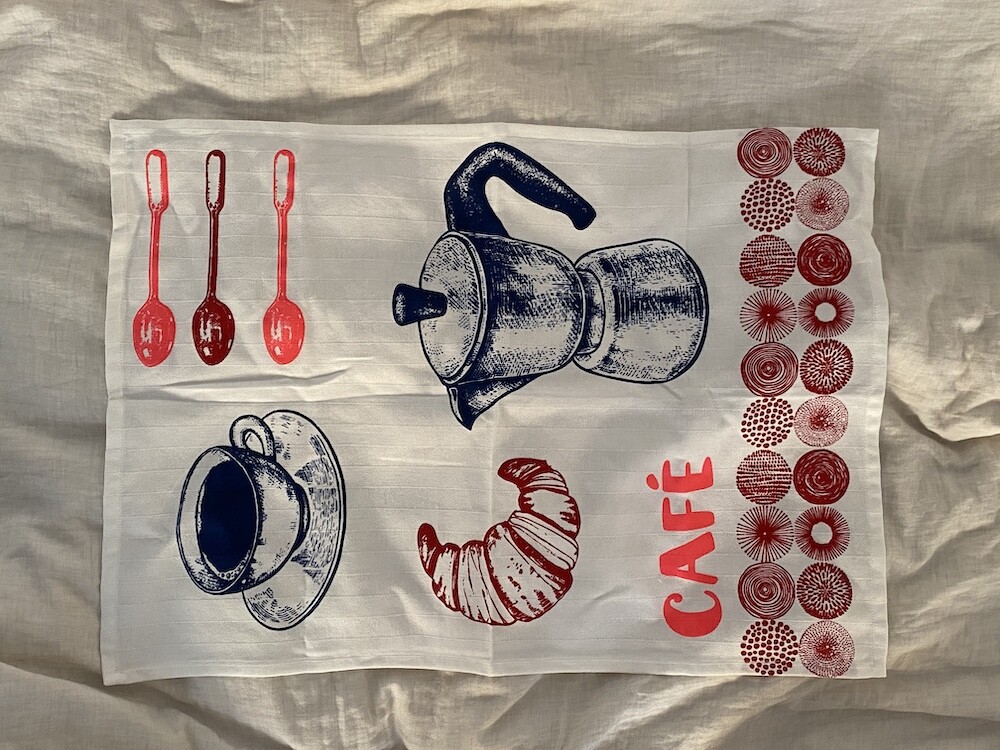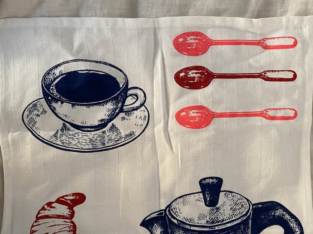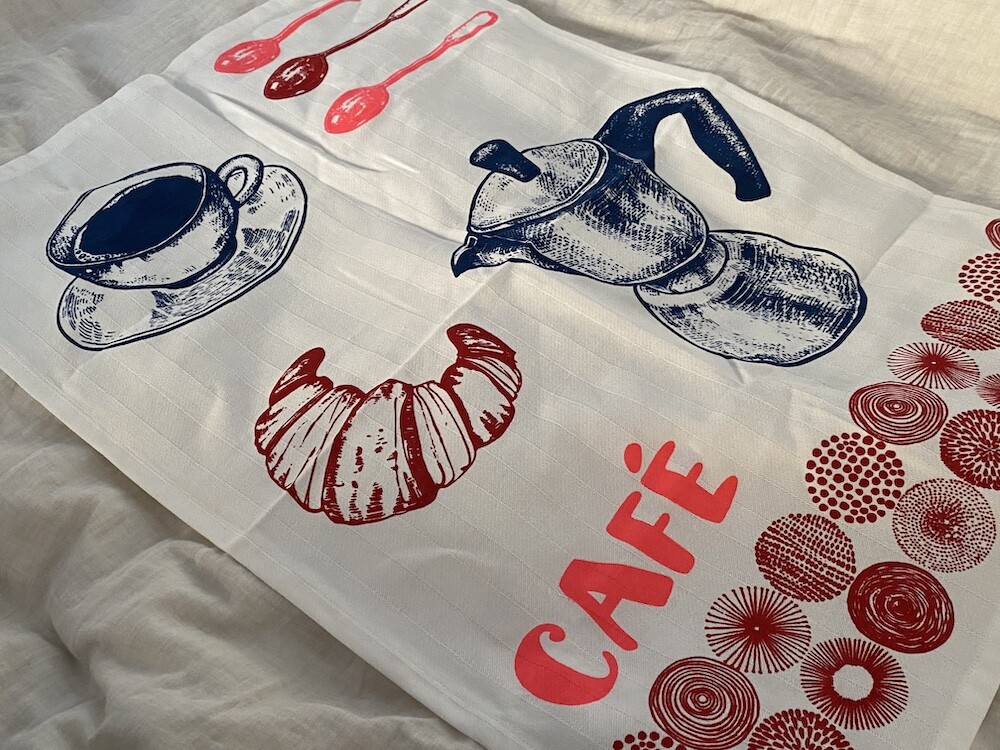 맨 처음 이 똑숑(키친 클로스)을 보았을 때 프랑스어로 CAFÉ라고 써져 있어서 당연히 프랑스 제품일 거라고 생각했어요. 그래서 우선 구매를 한 후 찾아보니 독일 브랜드더라고요. 빨강, 파랑, 분홍색이 주는 경쾌한 컬러감과 커피, 크로와상 같은 그림들이 잘 어우러져 보기만 해도 기분이 좋아요.