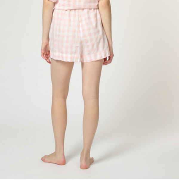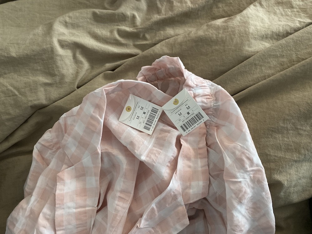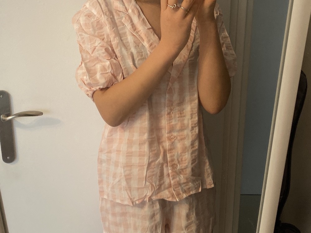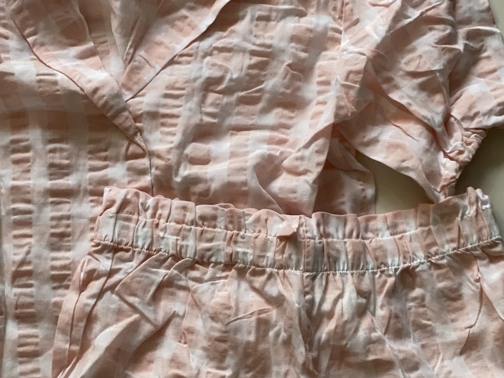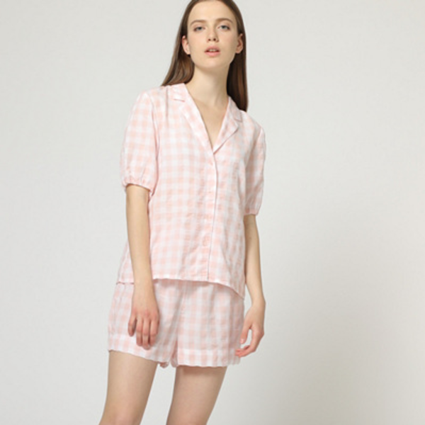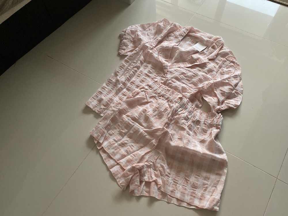 이 핑크 체크무늬 잠옷은 소재로 보면 여름용이에요. 아주 가는 실로 시어서커처럼 체크무늬를 짰는데 너무 부들부들해서 자꾸 손을 대고싶어요. 저는 긴 잠옷을 입고 자면 자는동안 움직일 때마다 원단이 몸을 불편하게 해서 한겨울에도 반바지 아니면 몸에 딱 붙는 레깅스만 입어요. 그래서 그런지 한겨울에도 반팔 파자마가 필요하더라고요. 하지만 한국의 겨울은 너무 추우니까, 초봄까지 참으셨다가 내년에 예쁘게 입어 주세요.
