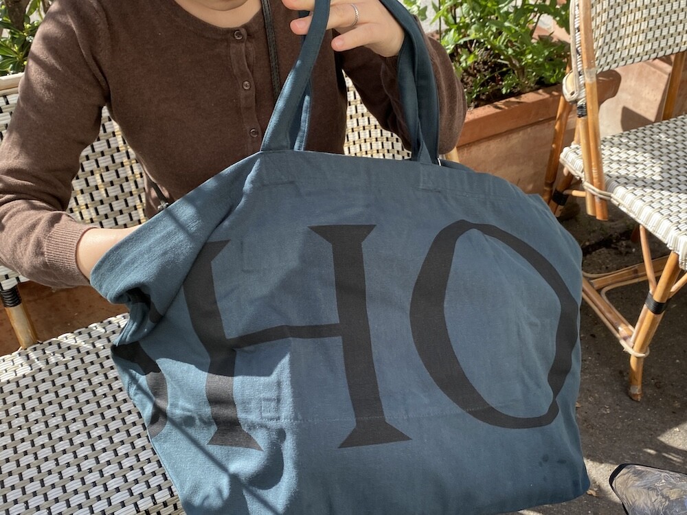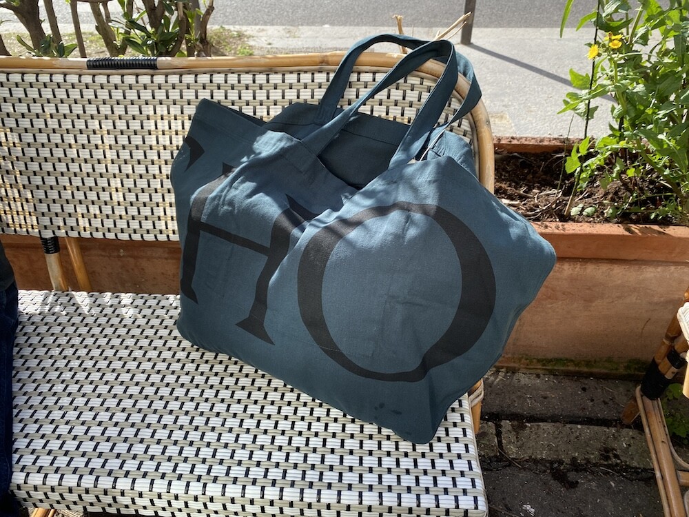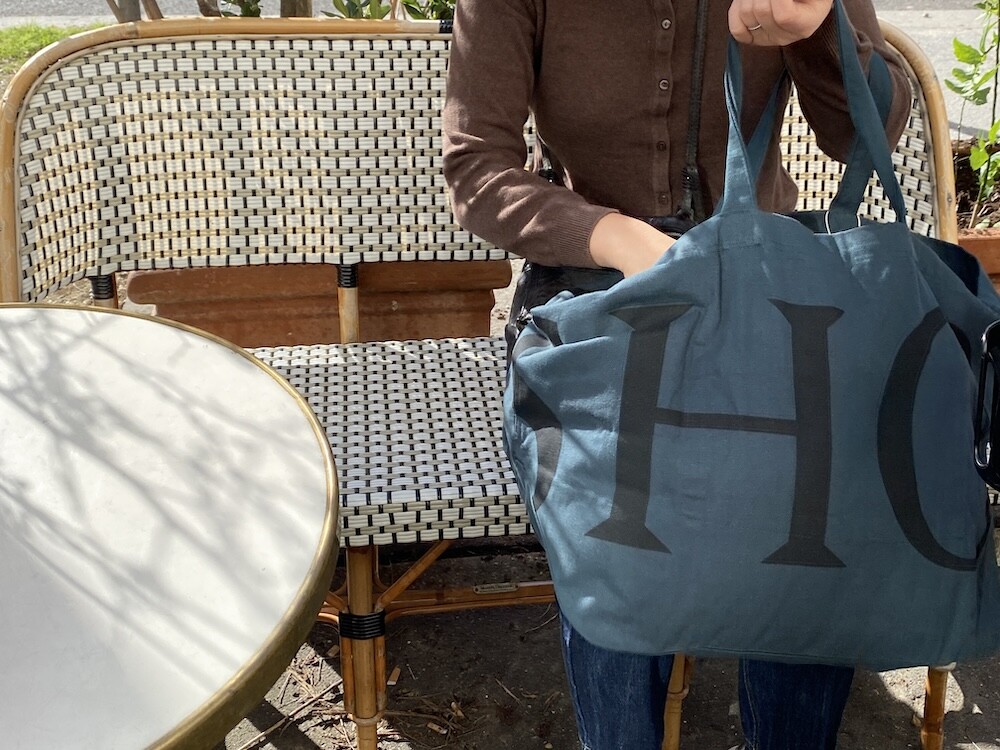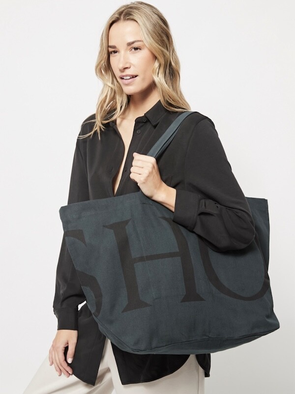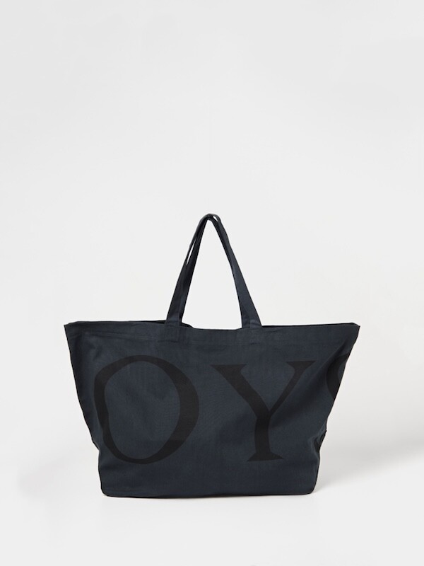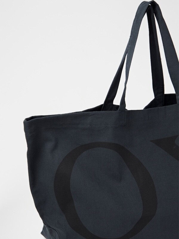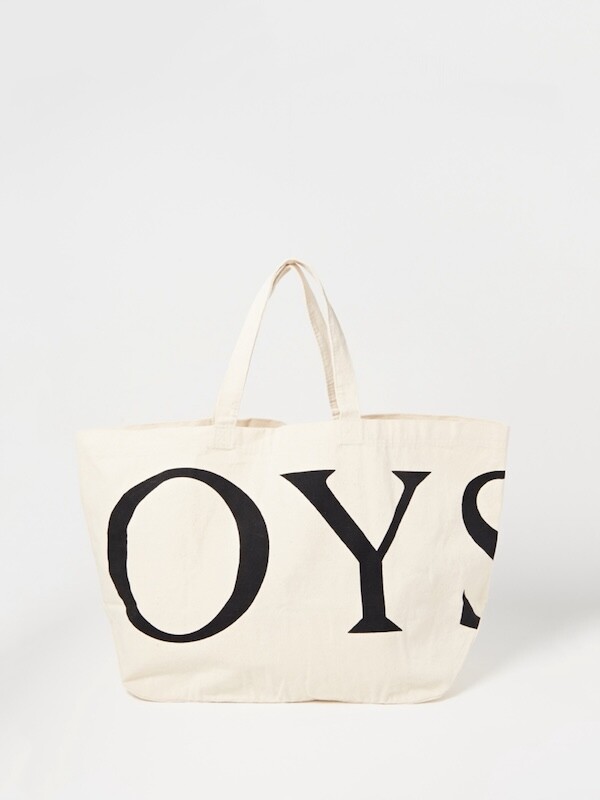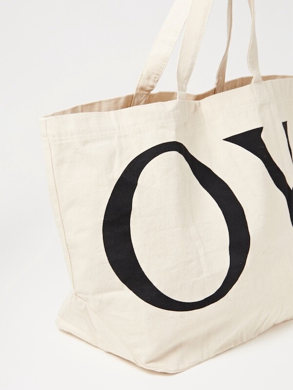 이 가방은 오이쇼 OYSHO 브랜드 이름이 크게 프린트된 에코백으로, 글씨가 아주 커서 앞뒷면에서 보이는 글씨가 다른 게 예뻐요. 크기가 커서 장바구니와 짐가방으로 사용하시기 좋을 거예요.