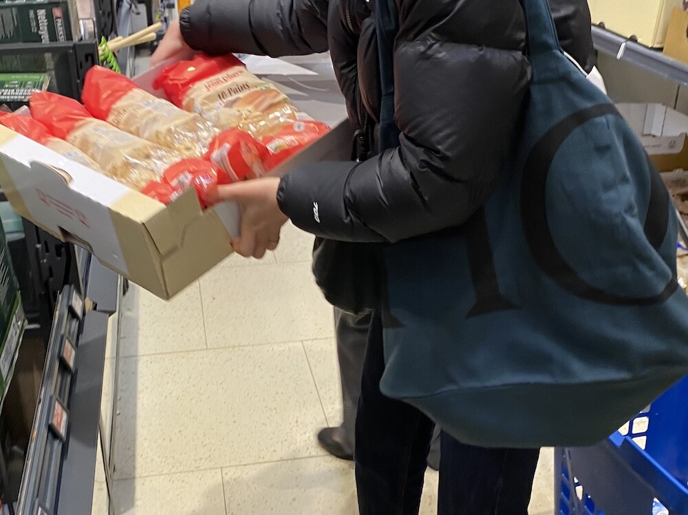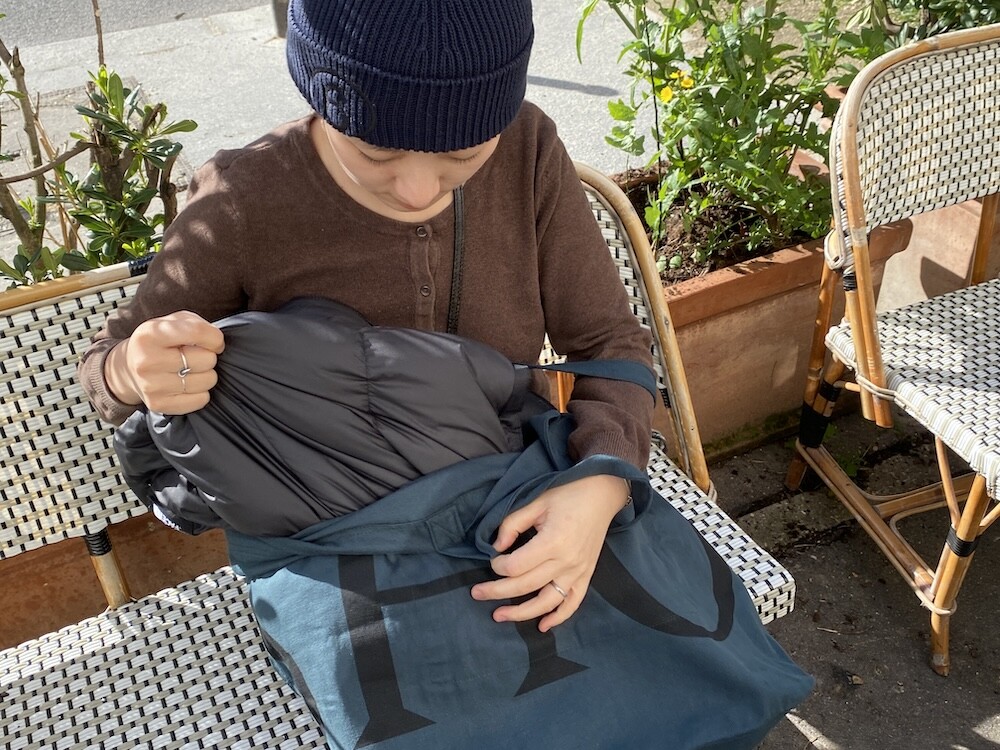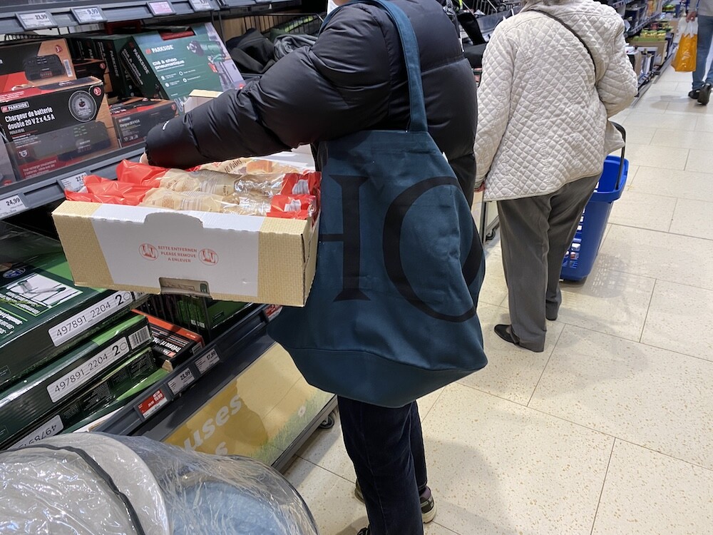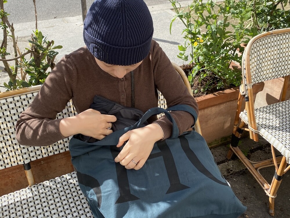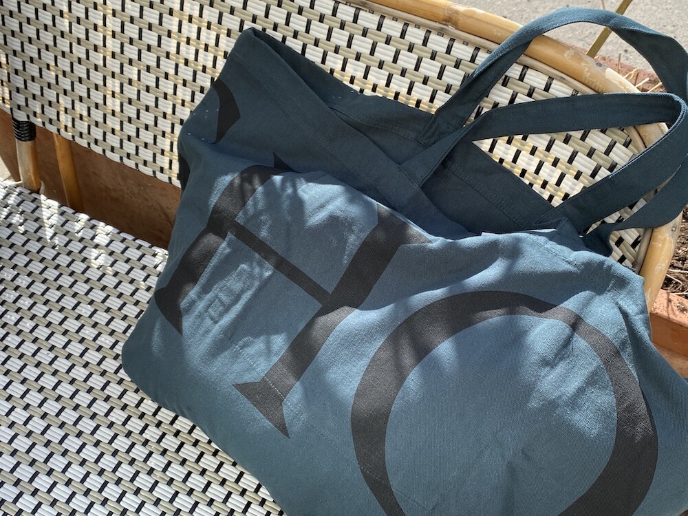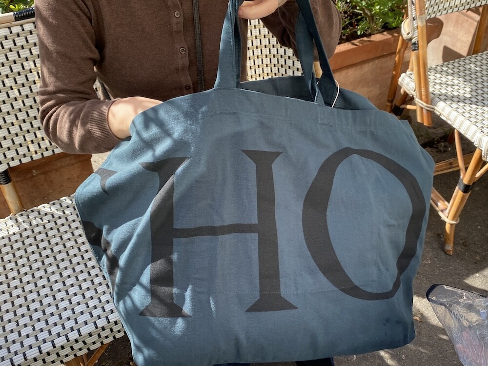 이 가방은 오이쇼 OYSHO 브랜드 이름이 크게 프린트된 에코백으로, 글씨가 아주 커서 앞뒷면에서 보이는 글씨가 다른 게 예뻐요. 크기가 커서 장바구니와 짐가방으로 사용하시기 좋을 거예요.