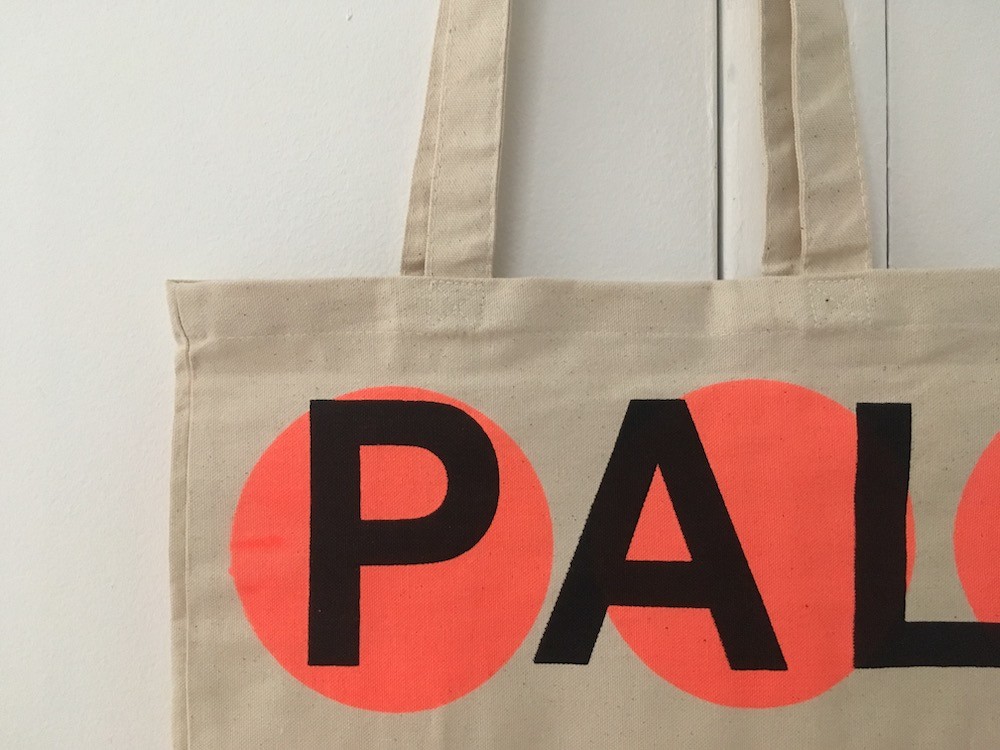 파리의 현대 미술관 팔레 드 도쿄(PALAIS DE TOKYO)의 동그라미 에코백입니다. 형광 주황색의 동그라미와 굵게 써진 팔레 드 도쿄 글씨가 귀여운 에코백이에요.