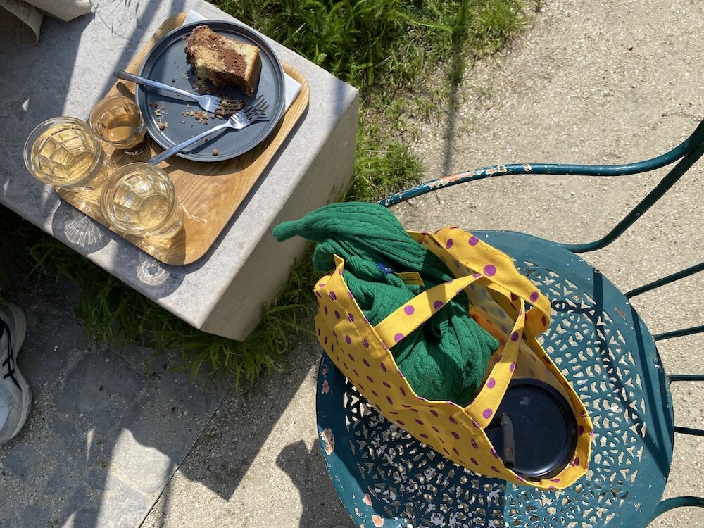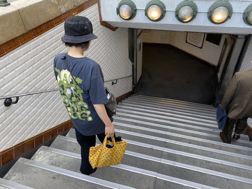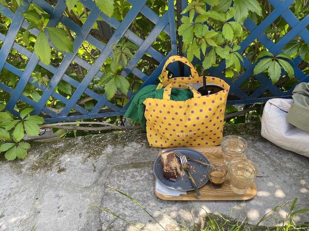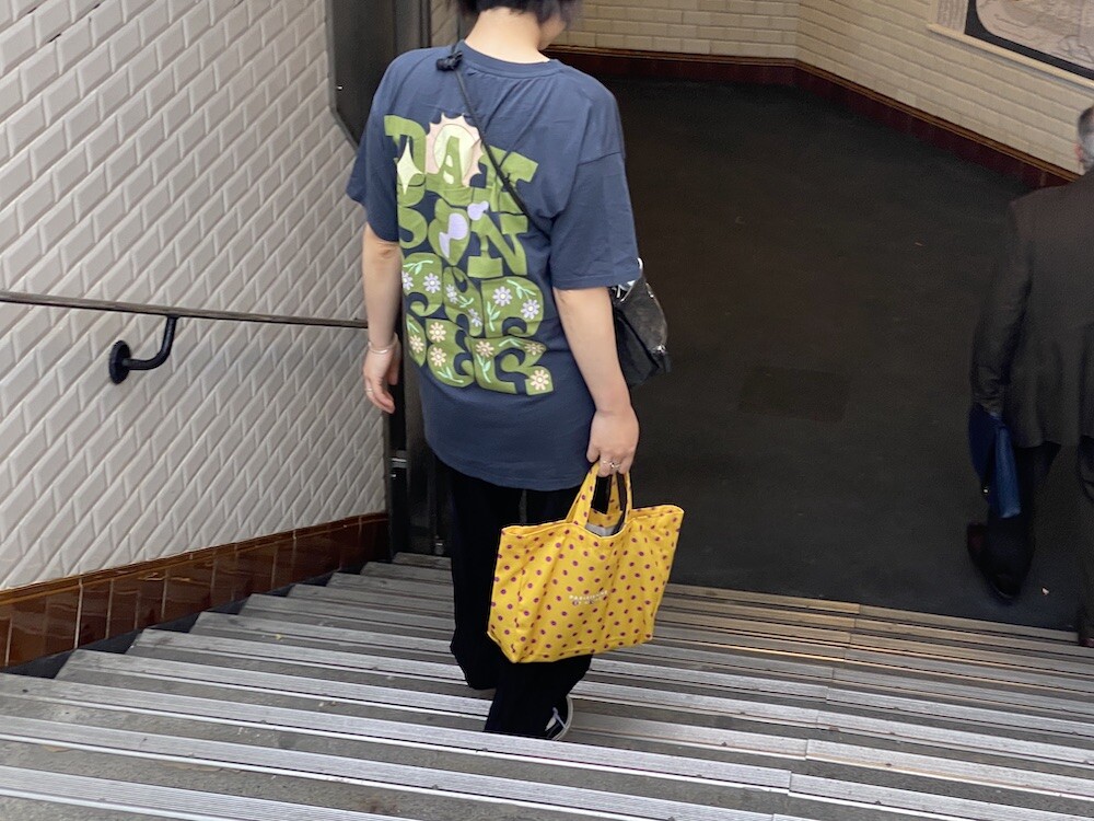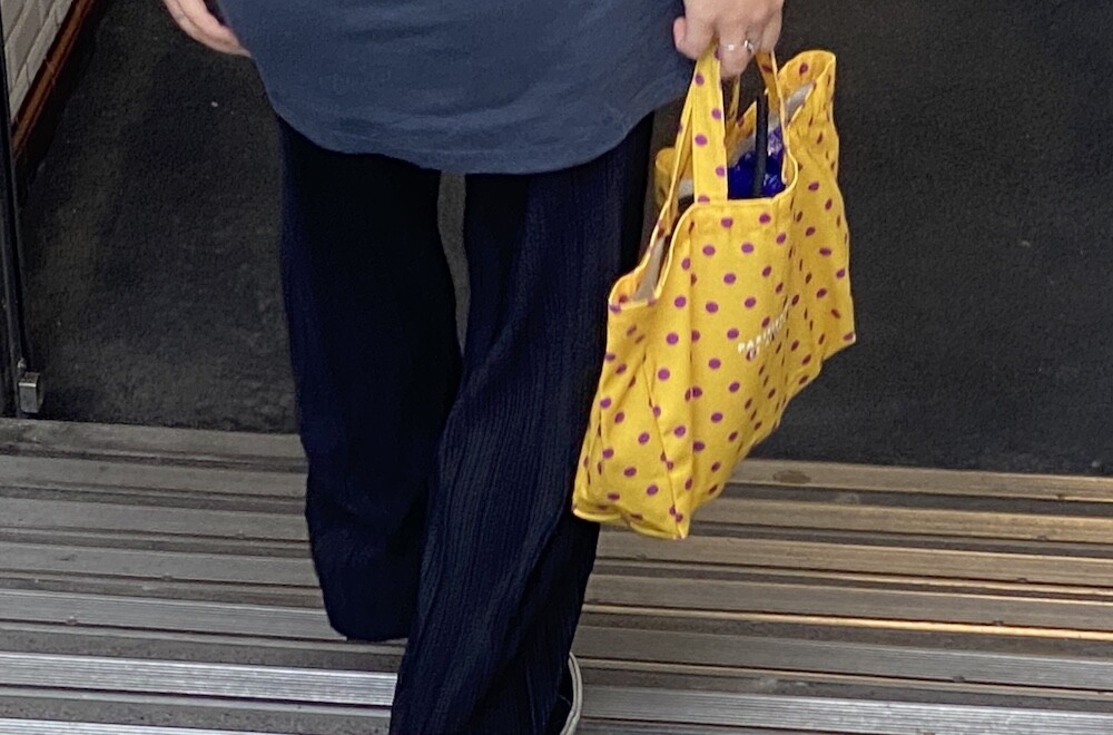 노랑 바탕에 보라색 동그라미 무늬가 귀여운 미니백이에요. 한국 분들께서 좋아하시는 작은 사이즈의 가방에 딱 팔에 걸기 좋은 길이의 손잡이가 달려 있어요. 소재가 탄탄한데다가 밑면과 옆면이 있는 박스 형태의 가방이라 흐물거리는 느낌이 없어, 하루 종일 텀블러와 니트를 넣어 들고 다녔는데 음료가 하나도 새지 않았더라고요.