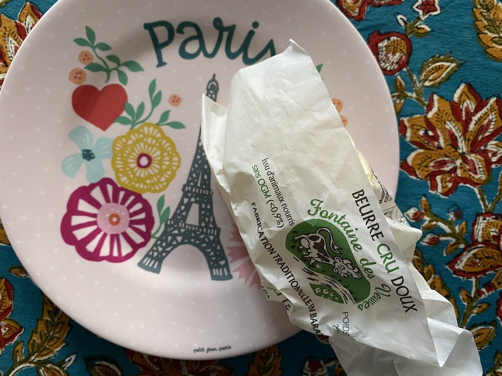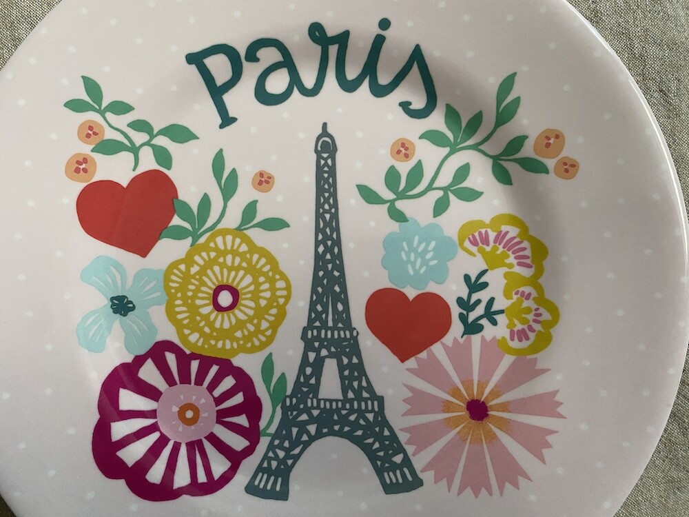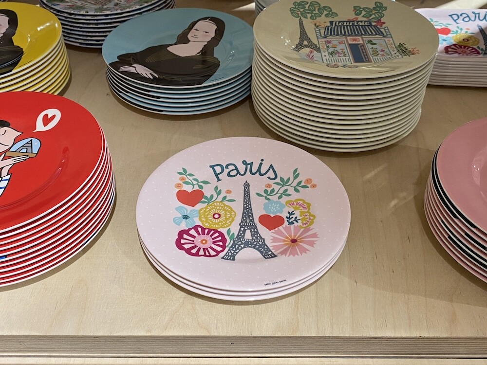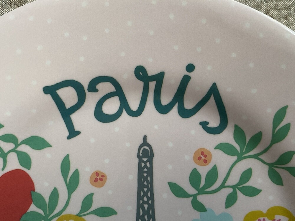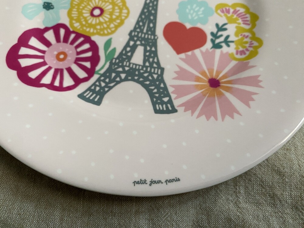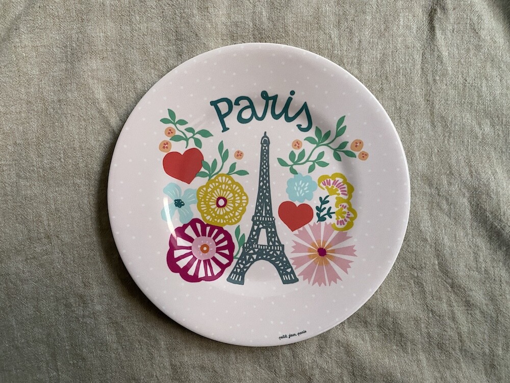 에펠탑과 꽃, 식물들의 모습을 귀엽게 그린 이 접시예요. 손글씨같은 파리 paris라는 글씨도 예쁘고 귀퉁이에 써진 브랜드 이름 쁘띠 주흐 파리(petit jour paris)도 깜찍해요.