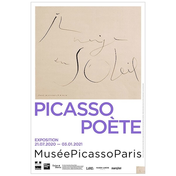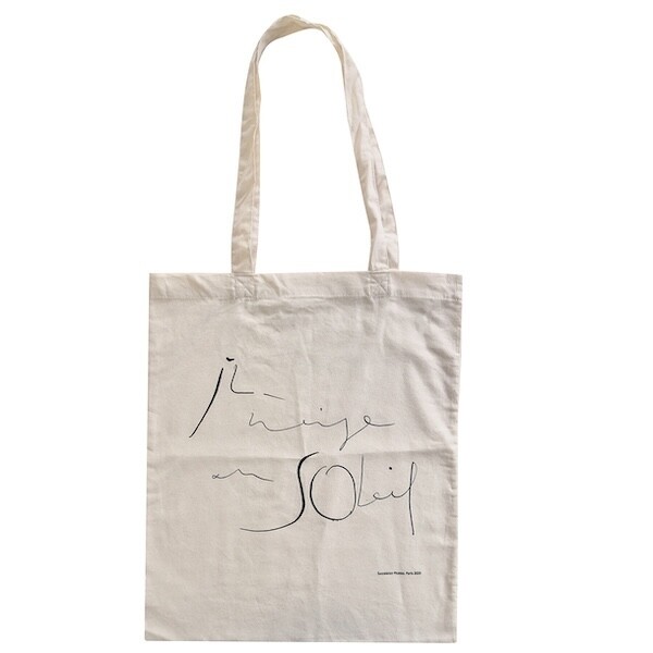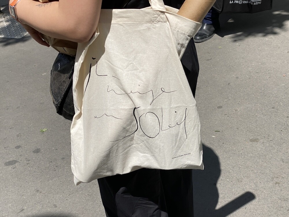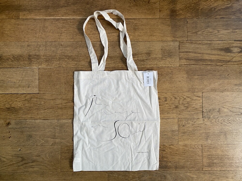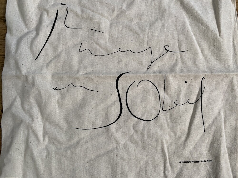 피카소는 화가이지만 시도 썼었다고 해요. 그가 썼던 여러 글들 중 한 부분이 이 가방에 프린트된 "Il neige au Soleil"인데, 이건 직역하면 "햇볕 아래 눈이 내린다"예요. 이 글씨는 전시의 메인 포스터에 사용되기도 했어요. 전 이 글의 뜻도 좋지만 글씨에서도 그림 같은 느낌이 느껴져서 더 좋더라고요.