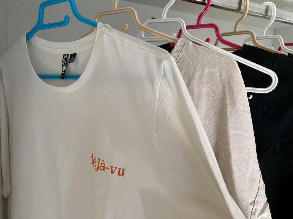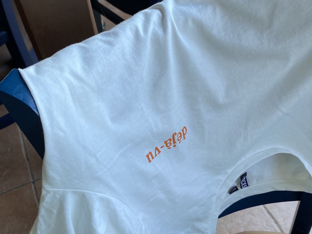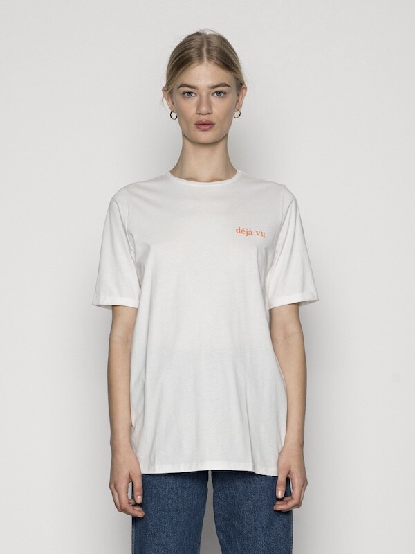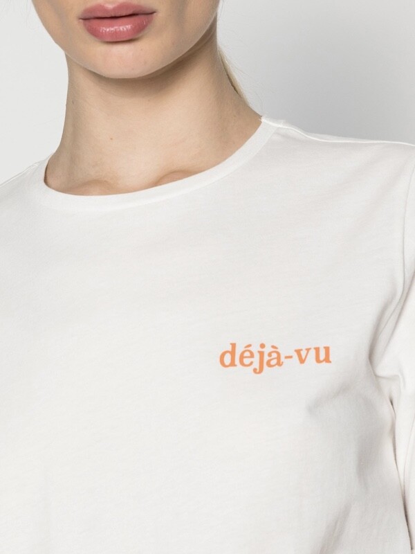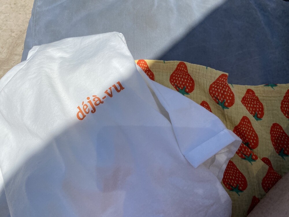 데자뷰(déjà-vu)라는 프랑스어가 써진 티셔츠예요. 'déjà-vu'는 처음 접한 상황에서 이미 체험한 것처럼 느끼는 현상을 말하는 프랑스어 단어죠. 오렌지색의 폰트가 여름과 잘 어울리는 티셔츠로, 소매 부분이 심심하지 않게 롤업 후 박음질되어 있어서 예뻐요. 이런 티셔츠는 넉넉하게 입는 게 예쁘기 때문에 M사이즈만 진행합니다.