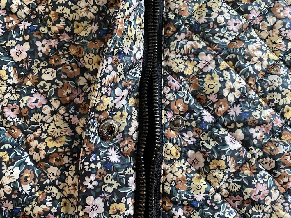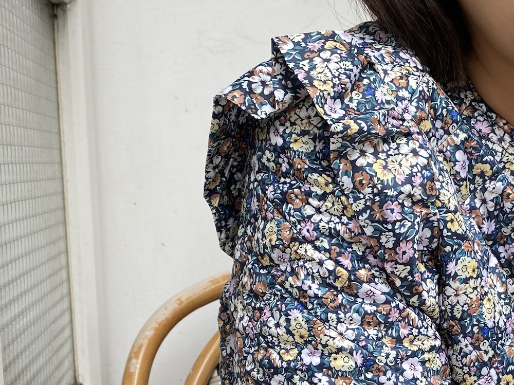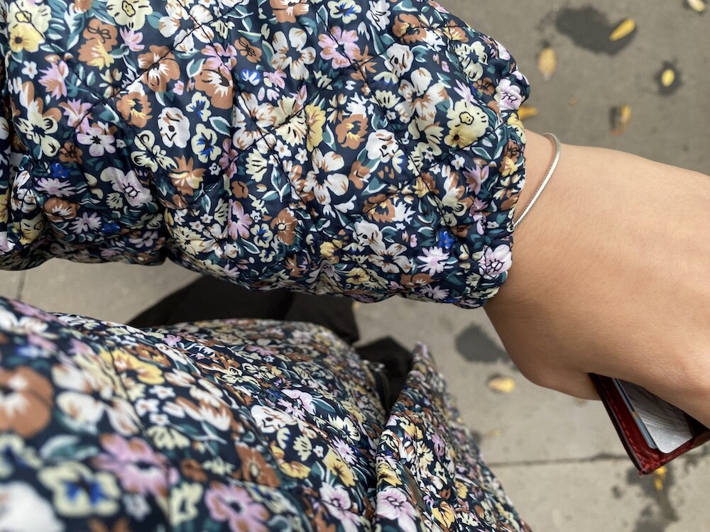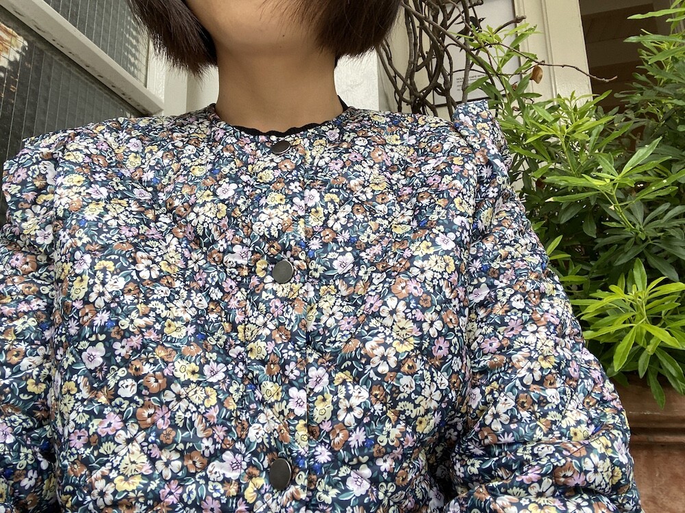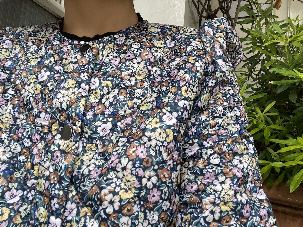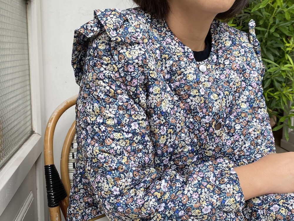 자잘한 꽃무늬가 예쁜 누빔 재킷이에요. 반들반들한 느낌의 폴리 소재 사이에 도톰한 솜을 넣고 박음질한 원단을 사용한 제품으로, 어깨 부분의 날개 프릴과 소매 끝을 모아 퍼프처럼 만든 디자인이 정말 사랑스러워요. 특히 두껍지 않은 누빔 소재라 우락부락한 느낌이 들지 않아요. 앞 여밈은 지퍼를 올린 후 똑딱이로 한 번 더 잠그게 되어 있어 바람을 잘 막아줘요. 그래서인지 얇은 이너를 입고 이 재킷만 입었는데도 따뜻한 느낌이 들더라고요.