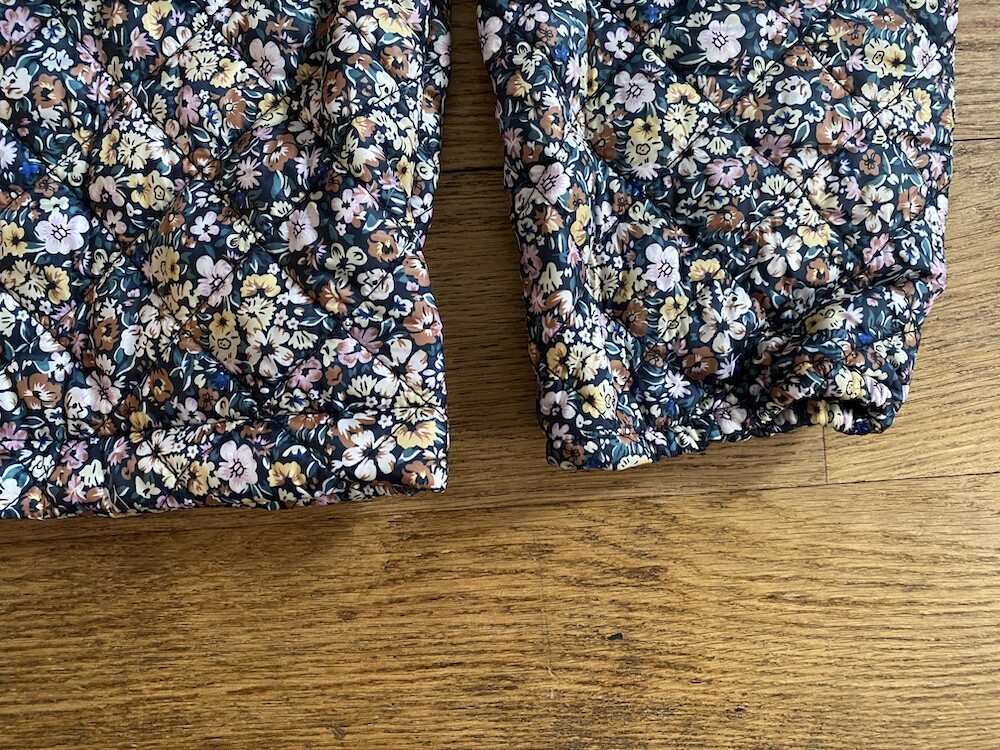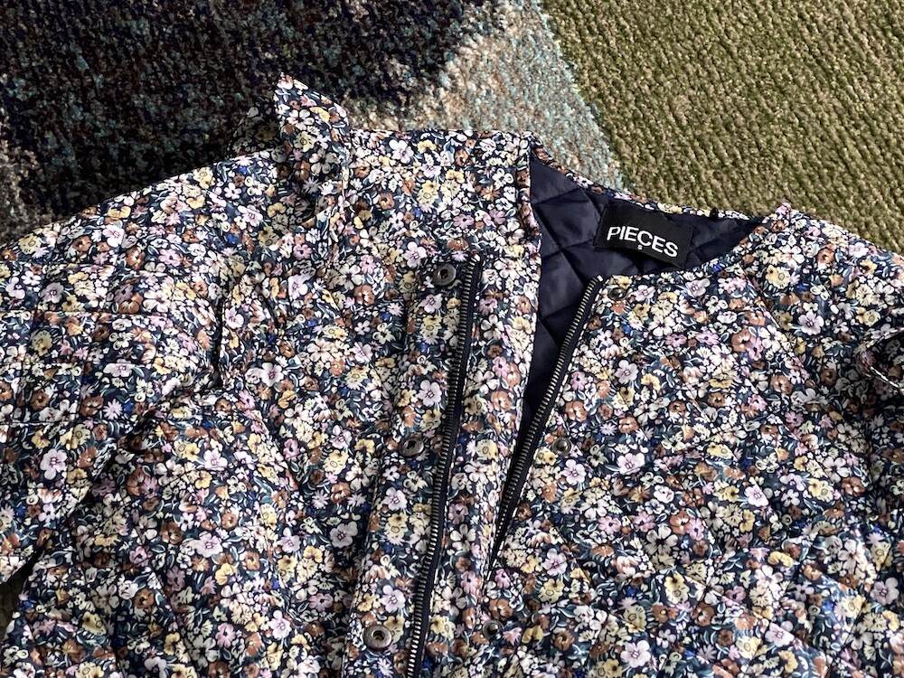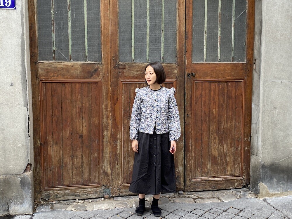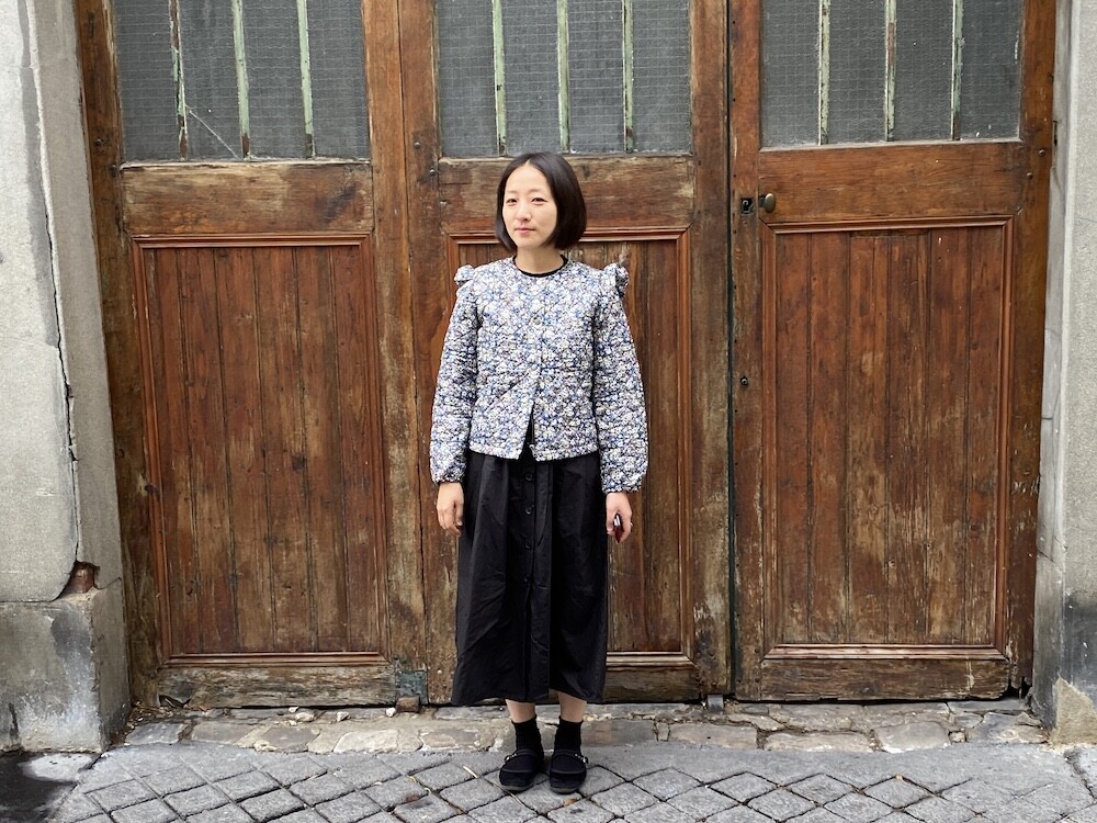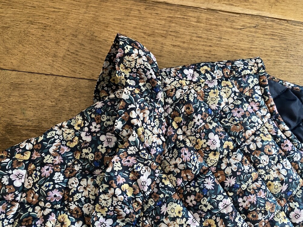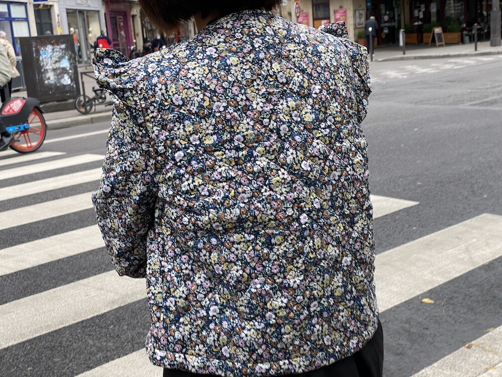 자잘한 꽃무늬가 예쁜 누빔 재킷이에요. 반들반들한 느낌의 폴리 소재 사이에 도톰한 솜을 넣고 박음질한 원단을 사용한 제품으로, 어깨 부분의 날개 프릴과 소매 끝을 모아 퍼프처럼 만든 디자인이 정말 사랑스러워요. 특히 두껍지 않은 누빔 소재라 우락부락한 느낌이 들지 않아요. 앞 여밈은 지퍼를 올린 후 똑딱이로 한 번 더 잠그게 되어 있어 바람을 잘 막아줘요. 그래서인지 얇은 이너를 입고 이 재킷만 입었는데도 따뜻한 느낌이 들더라고요.