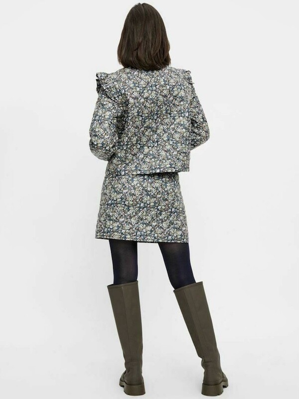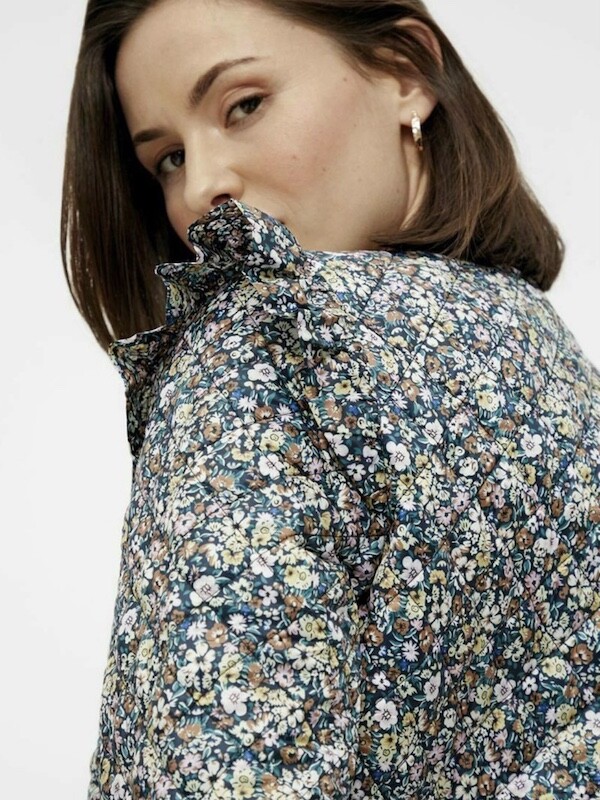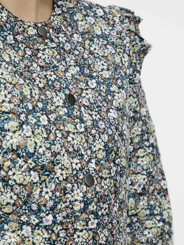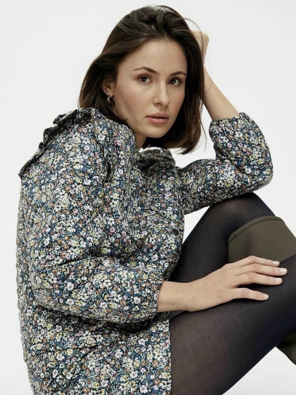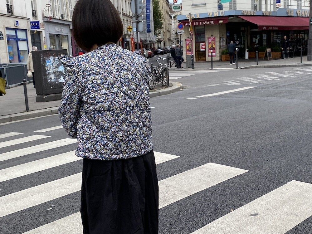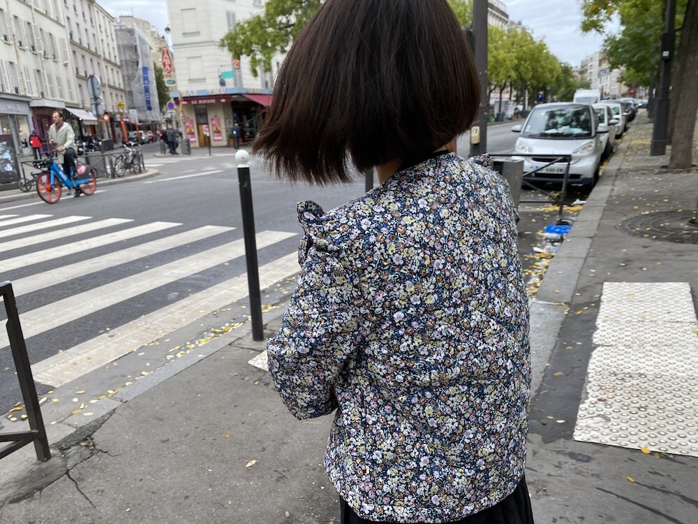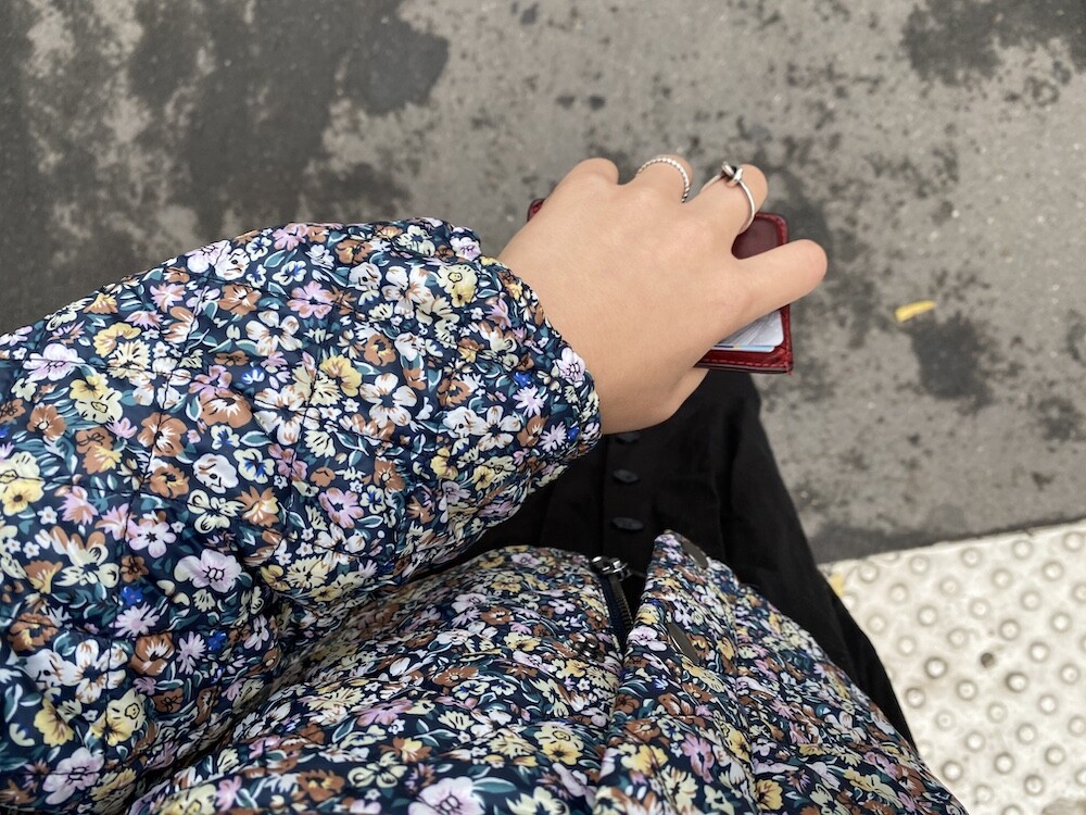 자잘한 꽃무늬가 예쁜 누빔 재킷이에요. 반들반들한 느낌의 폴리 소재 사이에 도톰한 솜을 넣고 박음질한 원단을 사용한 제품으로, 어깨 부분의 날개 프릴과 소매 끝을 모아 퍼프처럼 만든 디자인이 정말 사랑스러워요. 특히 두껍지 않은 누빔 소재라 우락부락한 느낌이 들지 않아요. 앞 여밈은 지퍼를 올린 후 똑딱이로 한 번 더 잠그게 되어 있어 바람을 잘 막아줘요. 그래서인지 얇은 이너를 입고 이 재킷만 입었는데도 따뜻한 느낌이 들더라고요.