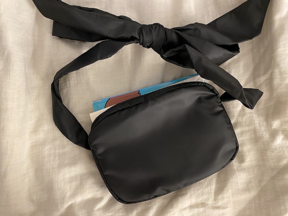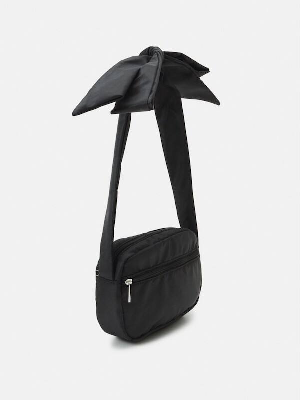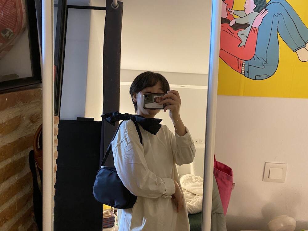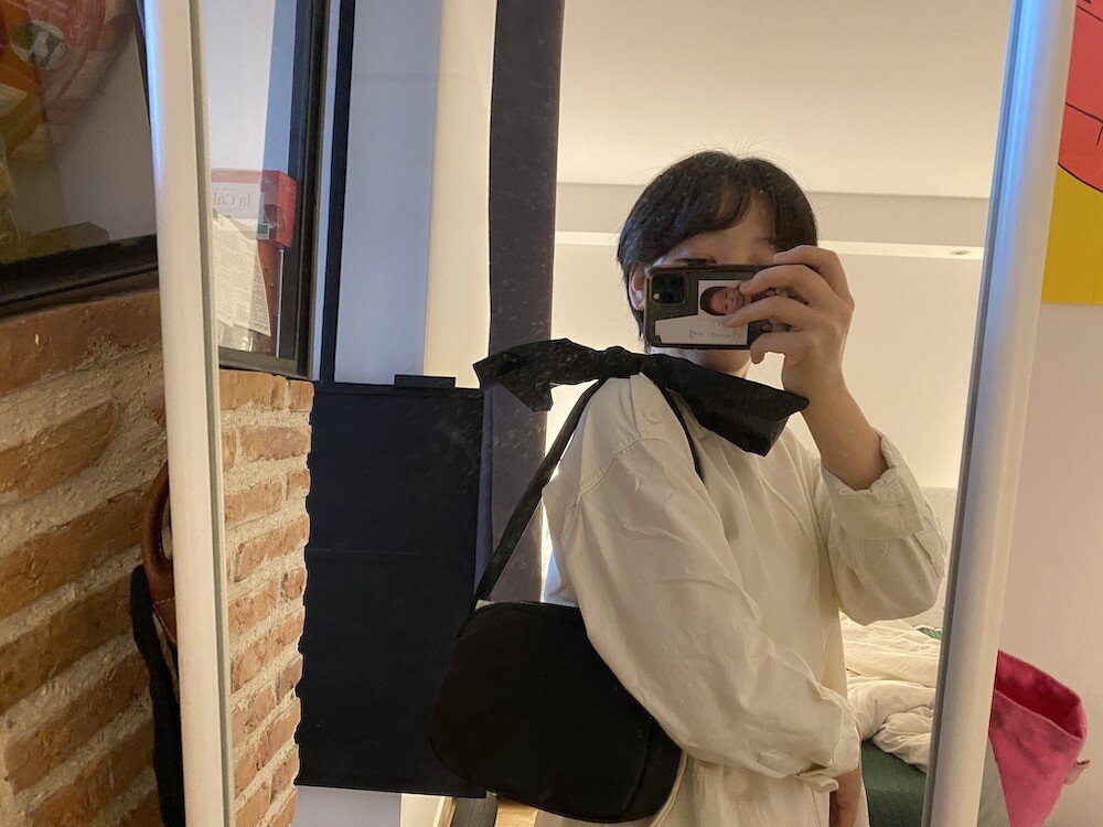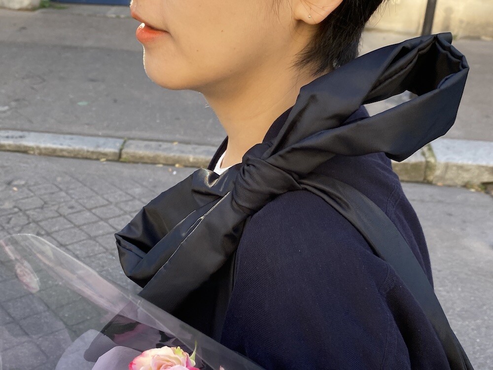 어깨에 리본을 얹은 듯한 디테일이 예쁜 가방이에요. 이 리본은 양쪽의 가방끈을 묶어 만든 거라 풀어서 길이 조절을 할 수 있어서, 저처럼 숄더백으로 메셔도 예쁘고 풀어서 끈을 길게 만들면 크로스백으로도 활용하실 수 있어요. 원단에 전반적으로 약간의 심지가 들어가서 패딩처럼 두툼하진 않지만 완전 납작하지도 않은 느낌이라 리본의 느낌도 잘 살고 가방도 전반적으로 더 동글한 느낌이 들어서 귀엽네요.