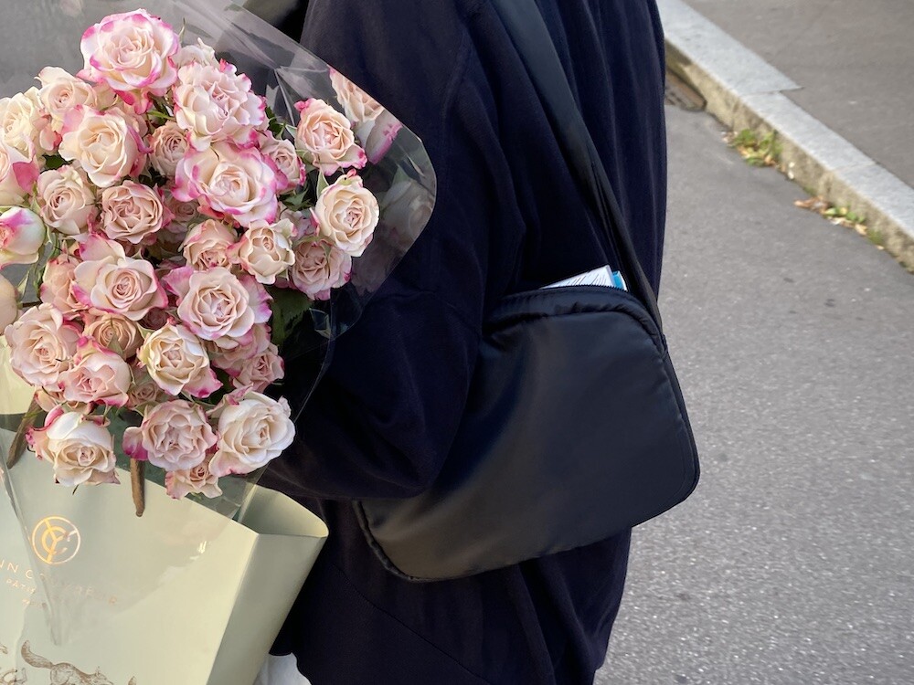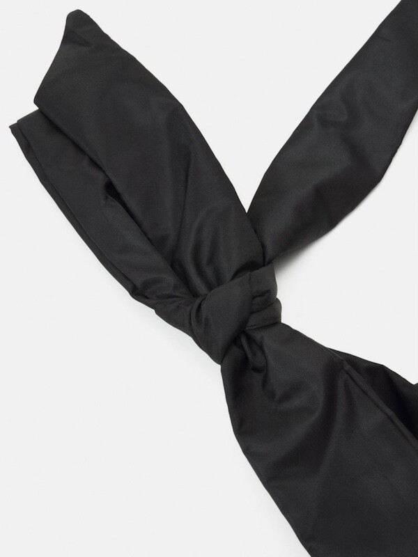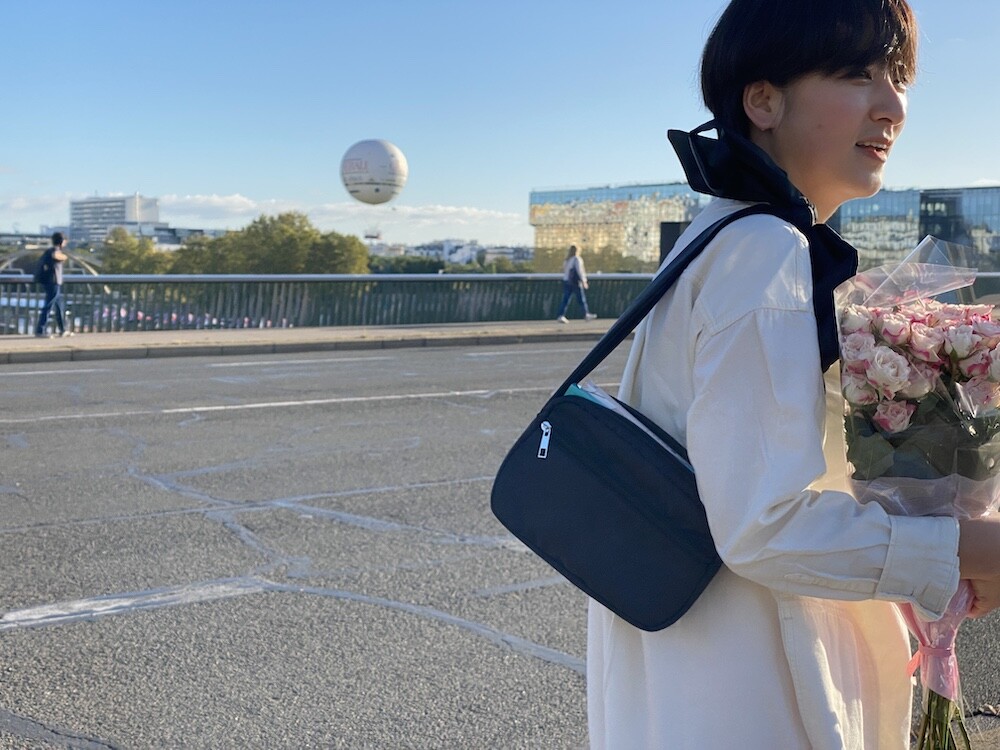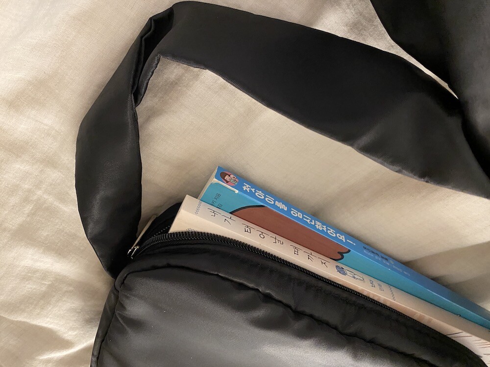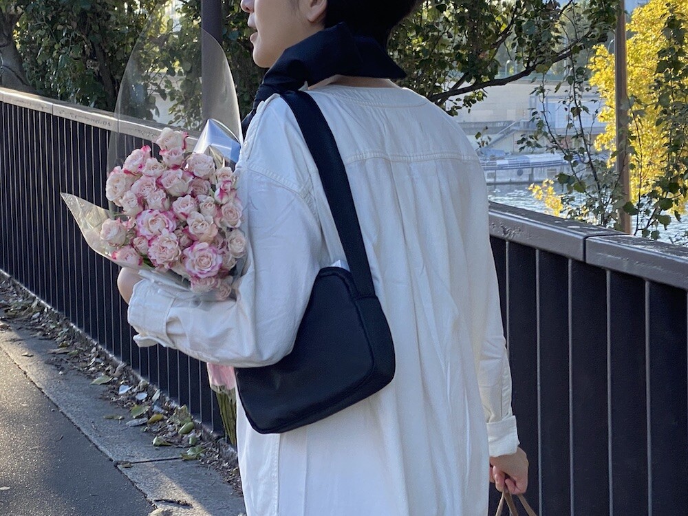 어깨에 리본을 얹은 듯한 디테일이 예쁜 가방이에요. 이 리본은 양쪽의 가방끈을 묶어 만든 거라 풀어서 길이 조절을 할 수 있어서, 저처럼 숄더백으로 메셔도 예쁘고 풀어서 끈을 길게 만들면 크로스백으로도 활용하실 수 있어요. 원단에 전반적으로 약간의 심지가 들어가서 패딩처럼 두툼하진 않지만 완전 납작하지도 않은 느낌이라 리본의 느낌도 잘 살고 가방도 전반적으로 더 동글한 느낌이 들어서 귀엽네요.