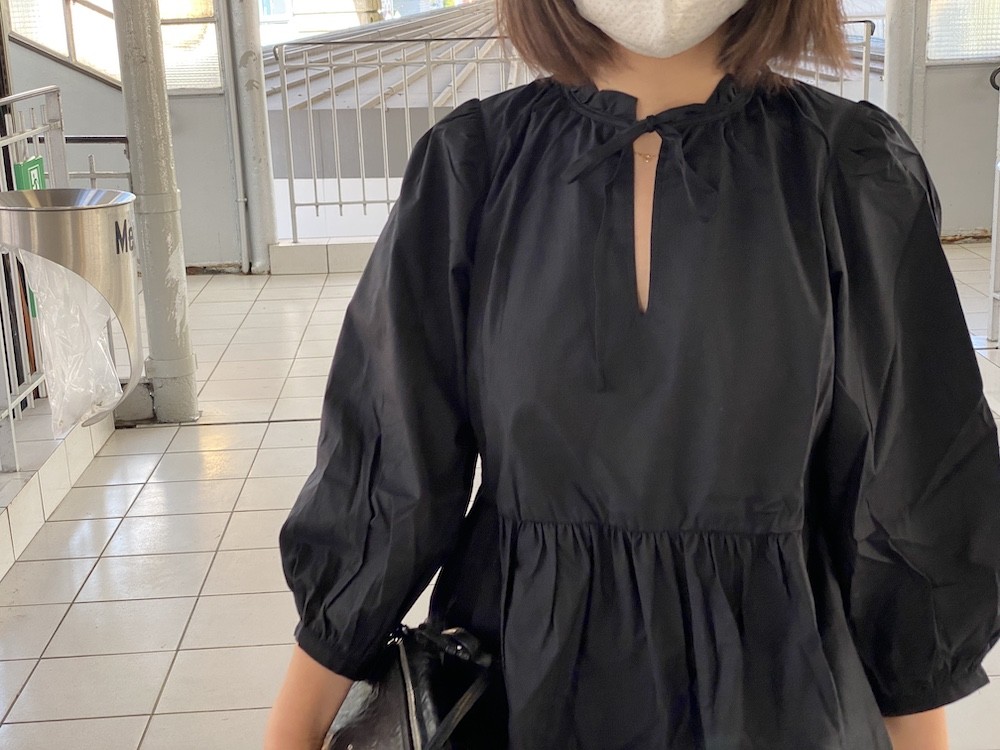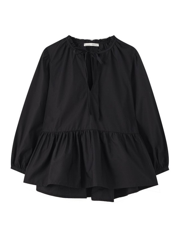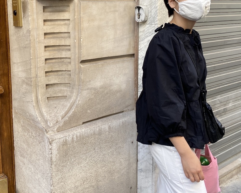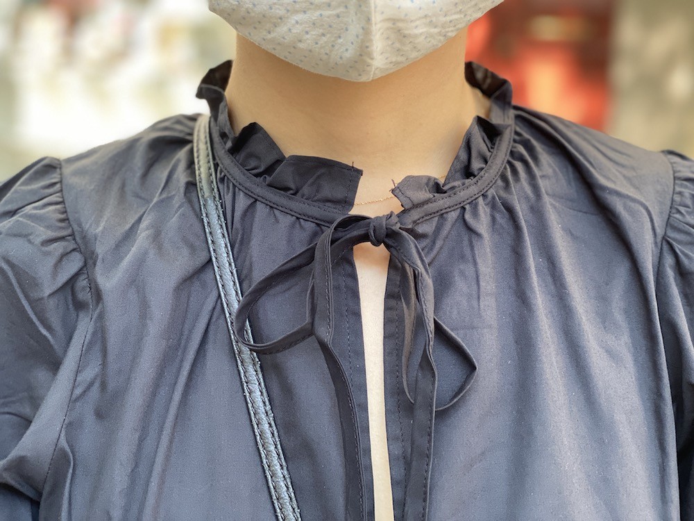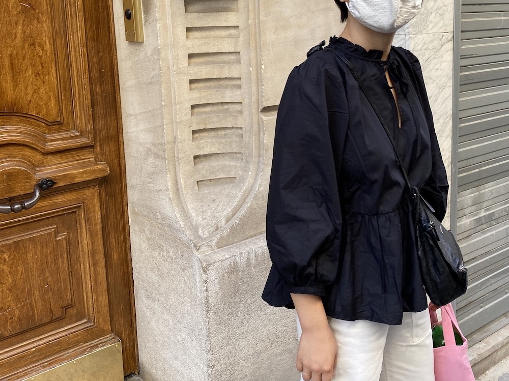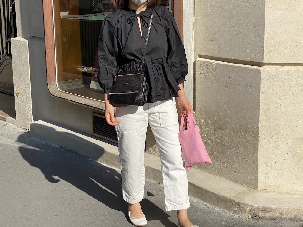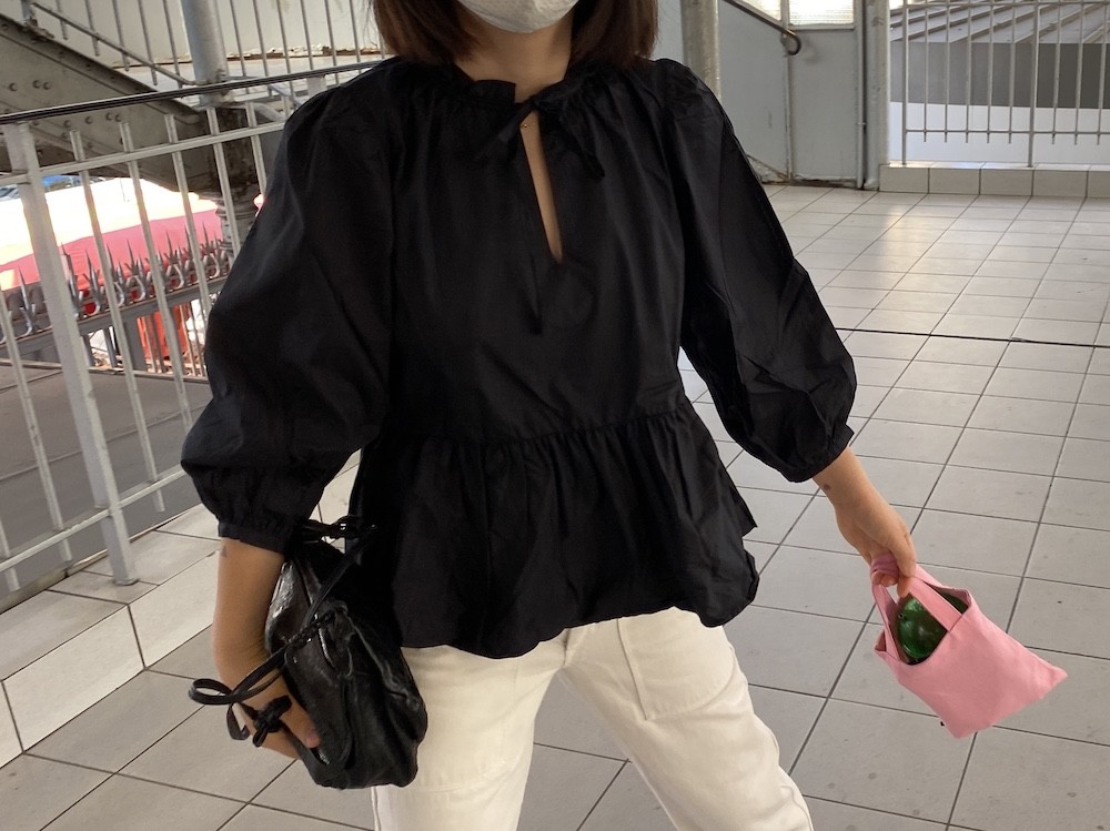 이 블라우스는 다양한 디테일들이 잘 살아 있어요. 목 부분과 허리 부분의 셔링, 퍼프 소매, 소매 끝단 처리 등 자랑할 만한 부분이 한두 가지가 아니에요. 목선이 깊게 파여 있지만 목 부분의 끈을 묶는 디자인이라 민망할 정도로 가슴 라인이 보이지 않는 것도 참 좋더라고요.