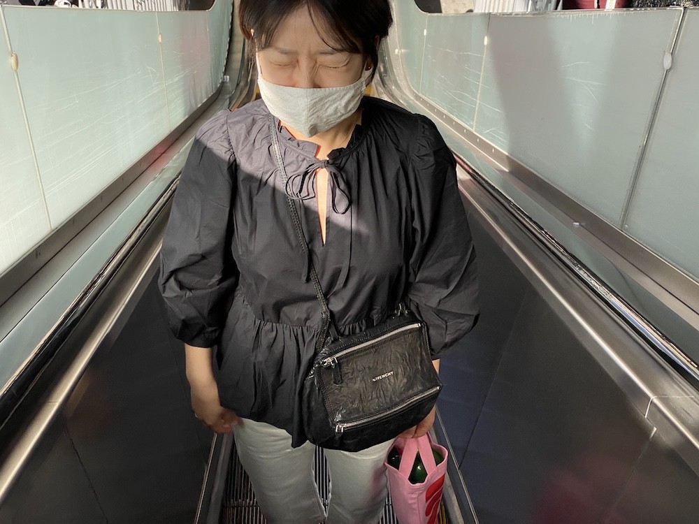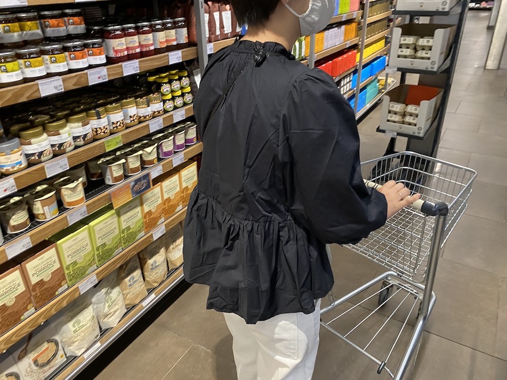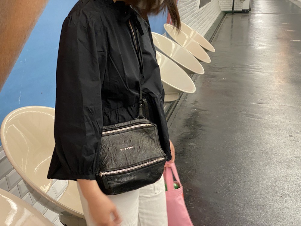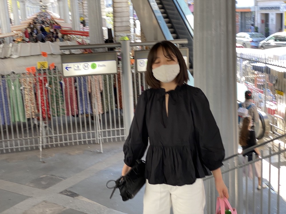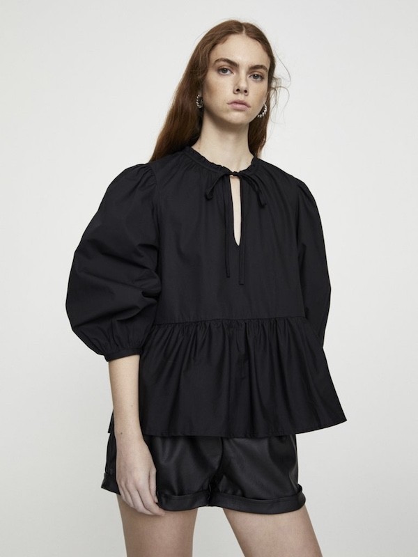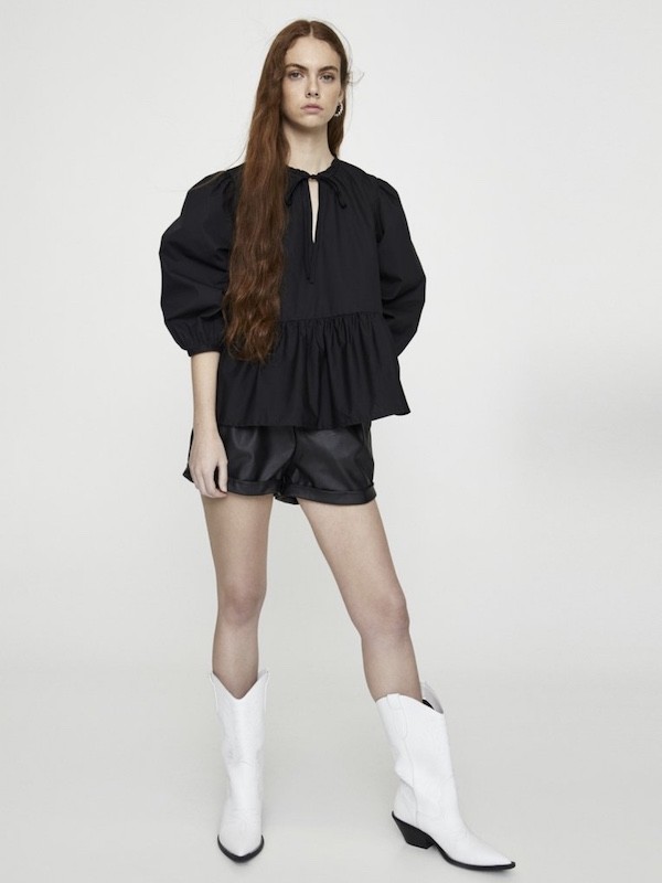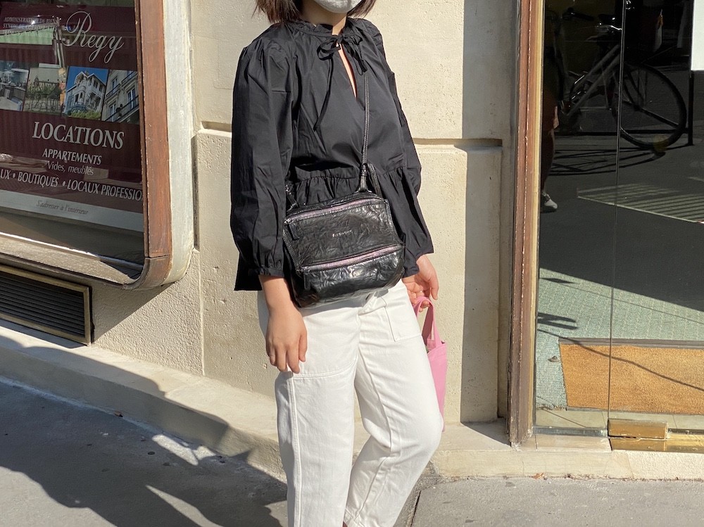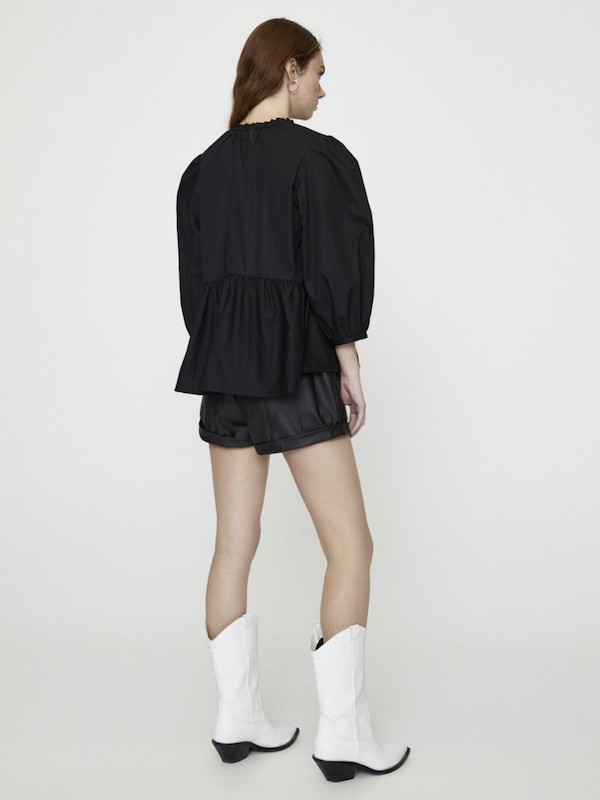 이 블라우스는 다양한 디테일들이 잘 살아 있어요. 목 부분과 허리 부분의 셔링, 퍼프 소매, 소매 끝단 처리 등 자랑할 만한 부분이 한두 가지가 아니에요. 목선이 깊게 파여 있지만 목 부분의 끈을 묶는 디자인이라 민망할 정도로 가슴 라인이 보이지 않는 것도 참 좋더라고요.