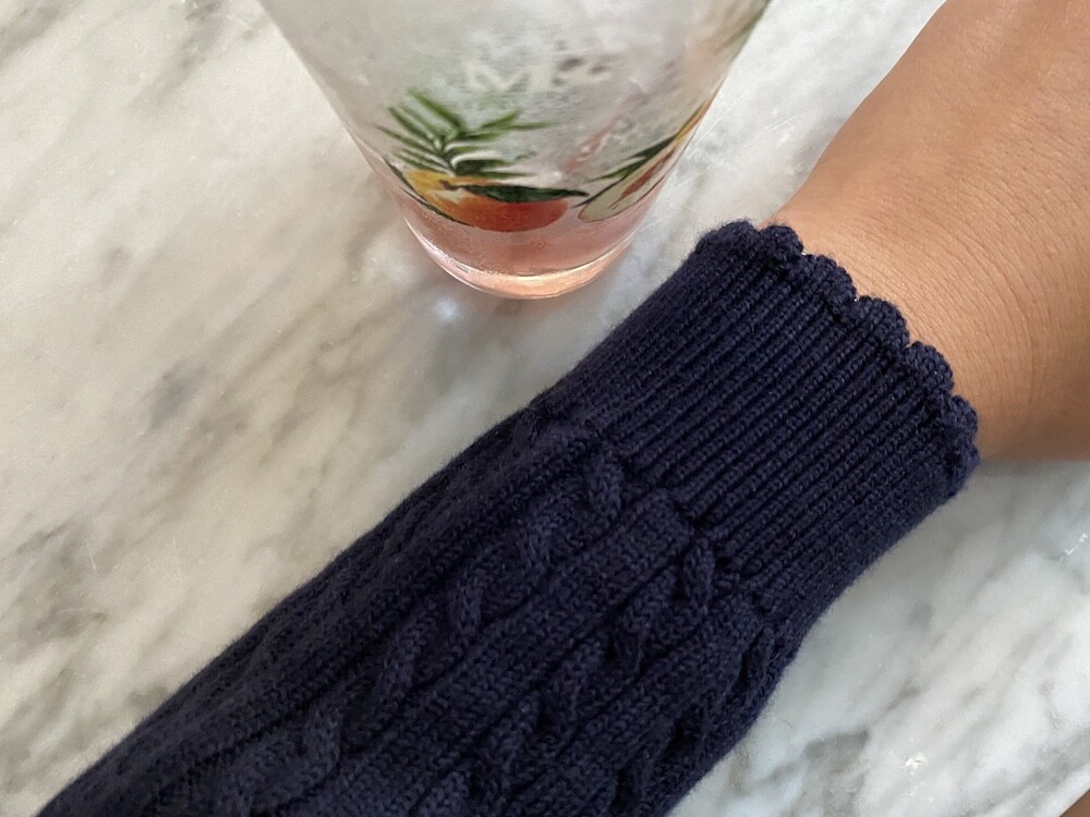이 제품은 꽈배기 케이블 니트 본판에 분홍색 말 자수가 놓여 있는 제품으로 특히 소매 끝, 밑단, 목 부분이 크로쉐처럼 물결 무늬로 짜여져 있는 게 포인트예요. 이 물결 무늬는 성인용엔 없고 키즈용에만 있는 디테일인데, 전 이 작은 디테일이 이 가디건에서 귀여움을 풍기도록 만든다고 생각해서 가장 마음에 들어요.