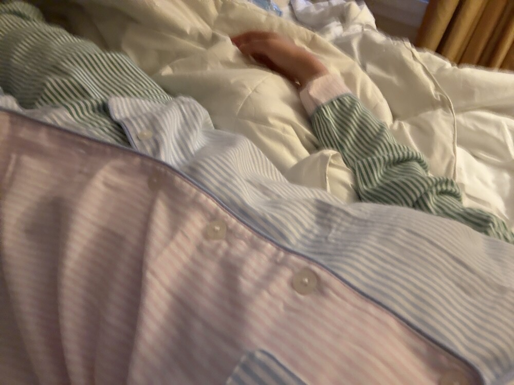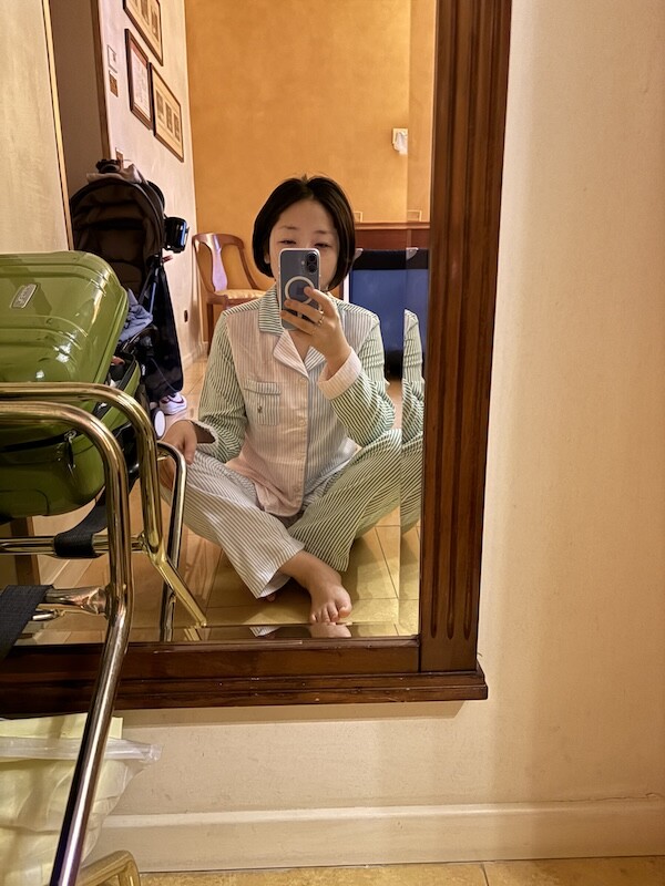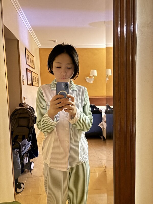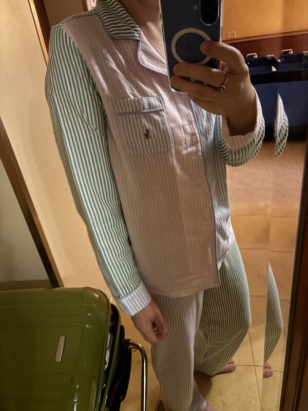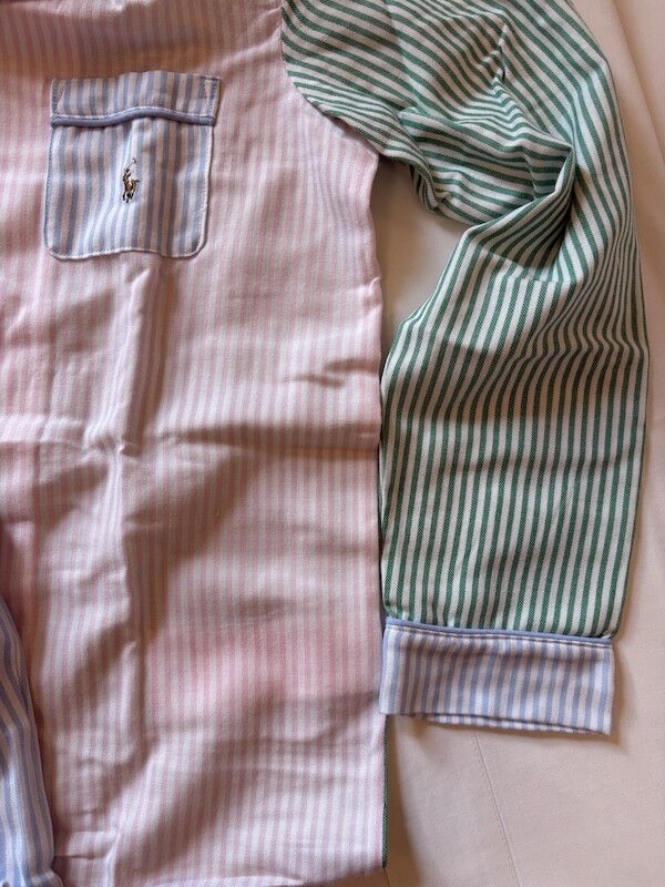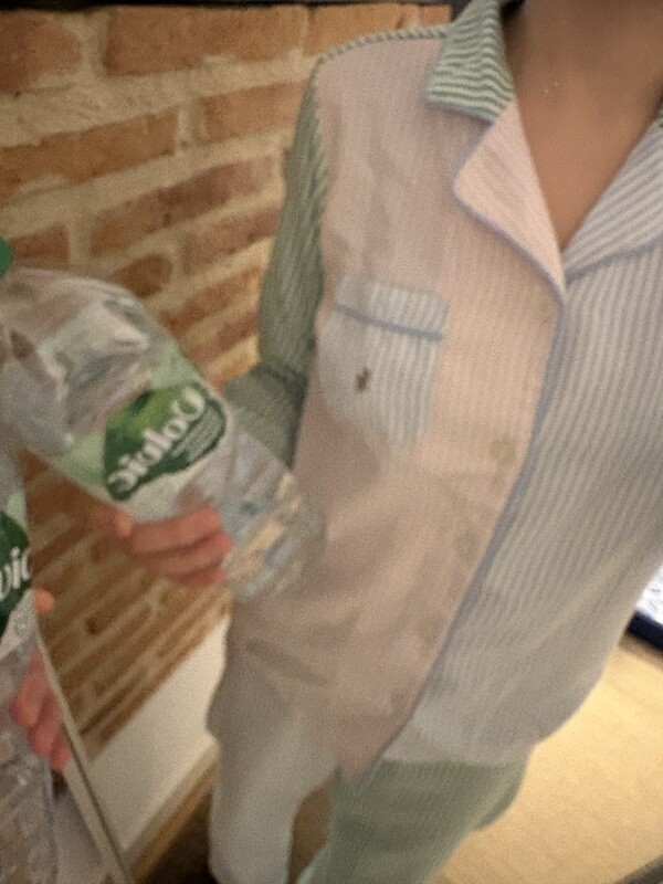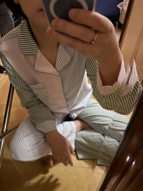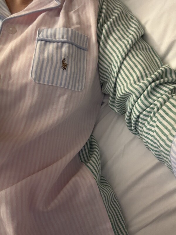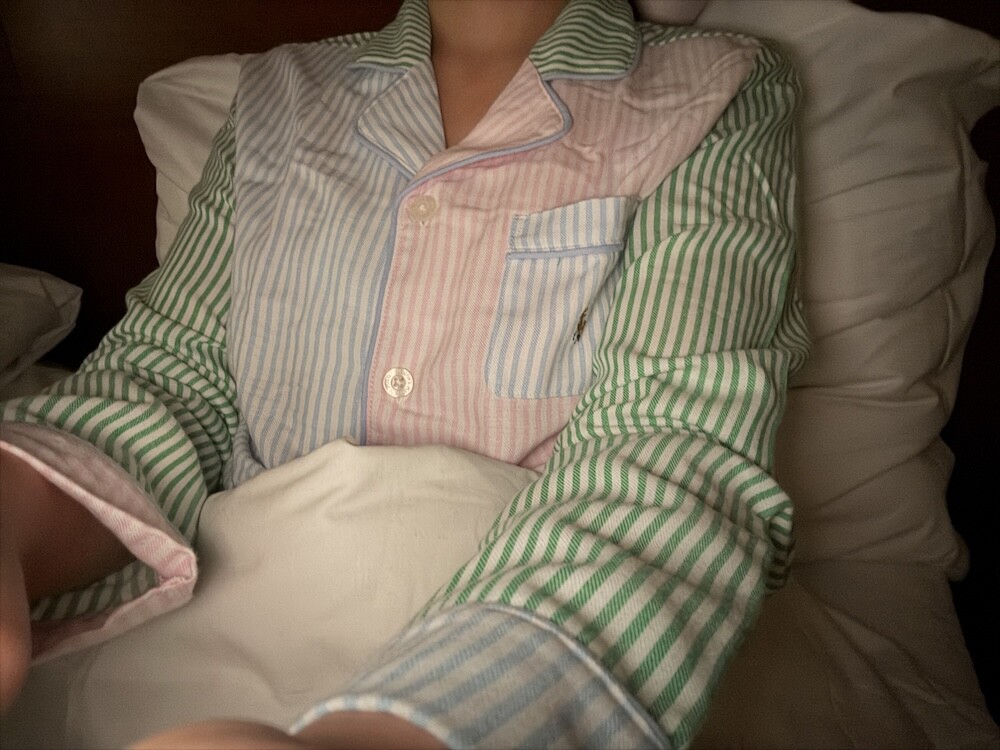 셔츠와 바지로 구성된 잠옷 세트입니다. 폴로에서 나오는 디자인 중에 이런 컬러 블록 셔츠나 티셔츠가 많은데, 잠옷까지 나왔네요! 은은한 컬러의 줄무늬들이 꼭 솜사탕을 보는 것 같아서 입기만 해도 기분이 좋더라고요. 셔츠 디자인인데도 목 부분이 거슬리거나 불편하지 않아서 편안히 잠자리에 들었어요.