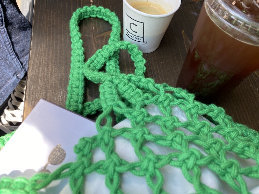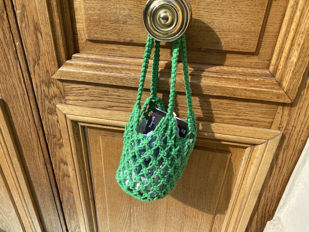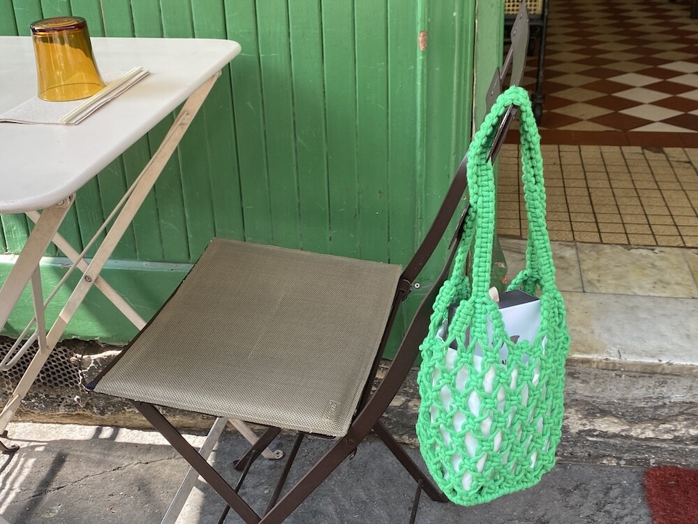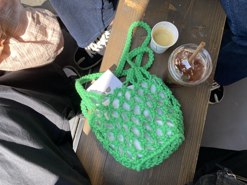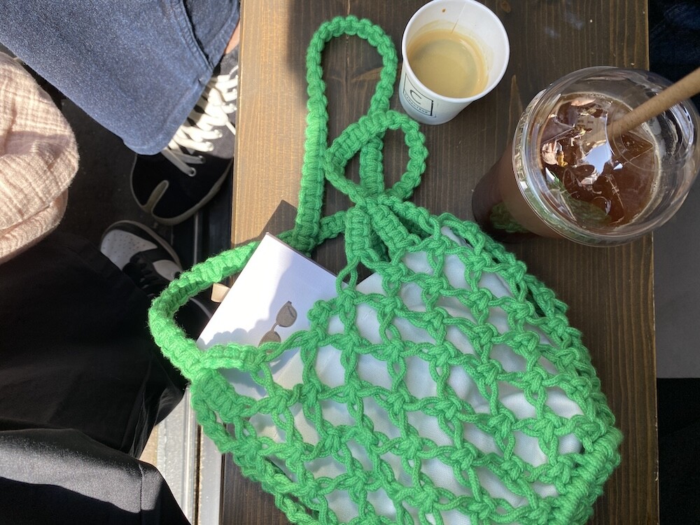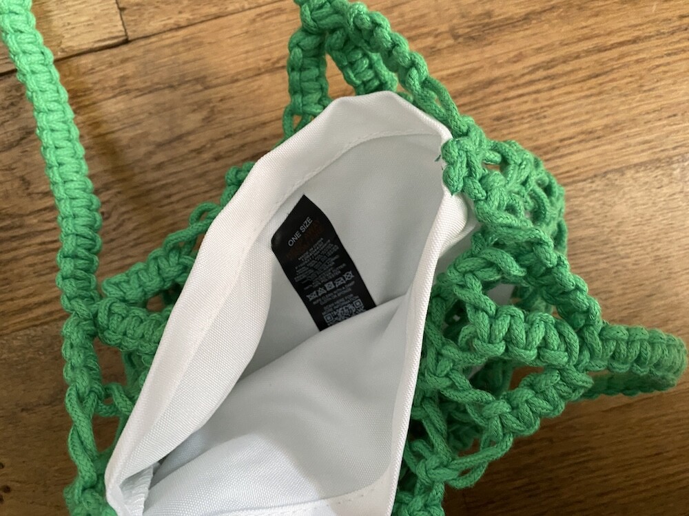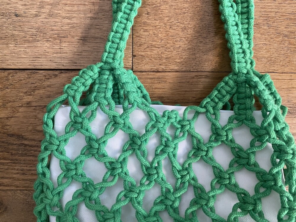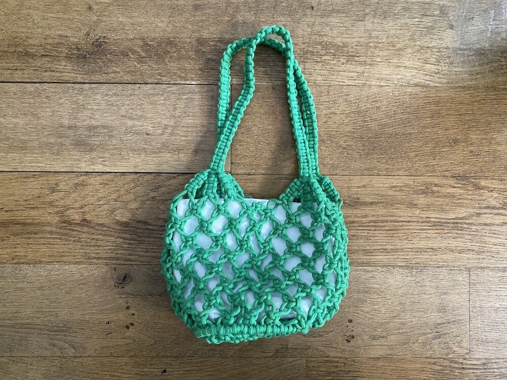 작은 사이즈의 네트백이에요. 제가 좋아하는 초록색이라 날씨가 좋아지니 자꾸만 들고 나가고 싶어지는 가방이에요. 작은 사이즈이지만 어깨에 딱 걸리는 크기라 편해요. 특히 좋은 점은 보통의 네트백은 구멍이 뚫려 있어서 안쪽에 가방이나 파우치를 더 넣고 다녀야 하는 불편함이 있는데 이건 안쪽에 흰색 천이 덧대어져 있어서 따로 파우치에 물건들을 담지 않아도 돼요. 일반 가방처럼 사용하면 되는 게 참 편하더라고요. 혹시나 안쪽의 흰색 천이 없었으면 좋겠다 싶으신 분들께서는 박음질을 뜯어 안쪽 천을 뜯고 사용하실 수도 있습니다.