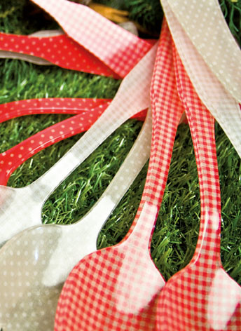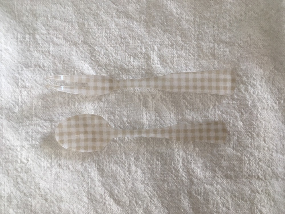 사브르만의 아크릴 가공 기법으로 만들어진 스푼과 포크예요. 아크릴 사이에 아주 얇게 천을 집어넣어 가공한 것으로, 모양이 까지거나 벗겨질 염려 없이 오래 사용하실 수 있어요.