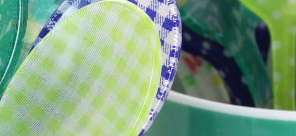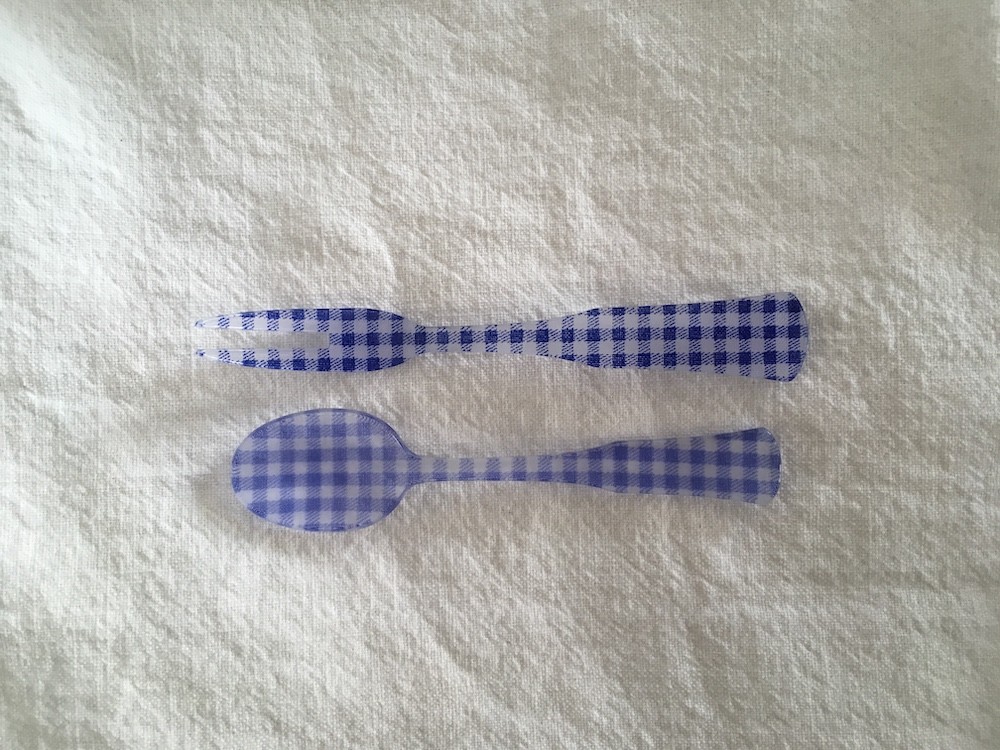 사브르만의 아크릴 가공 기법으로 만들어진 스푼과 포크예요. 아크릴 사이에 아주 얇게 천을 집어넣어 가공한 것으로, 모양이 까지거나 벗겨질 염려 없이 오래 사용하실 수 있어요.