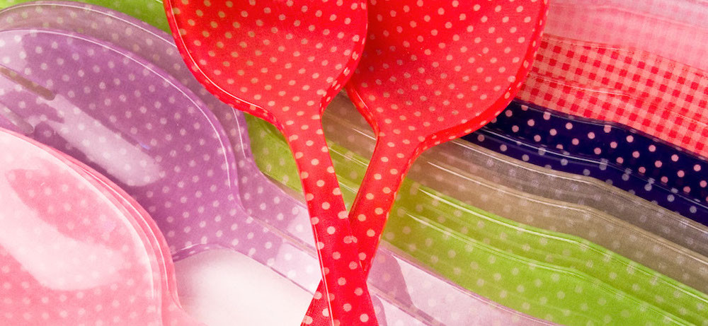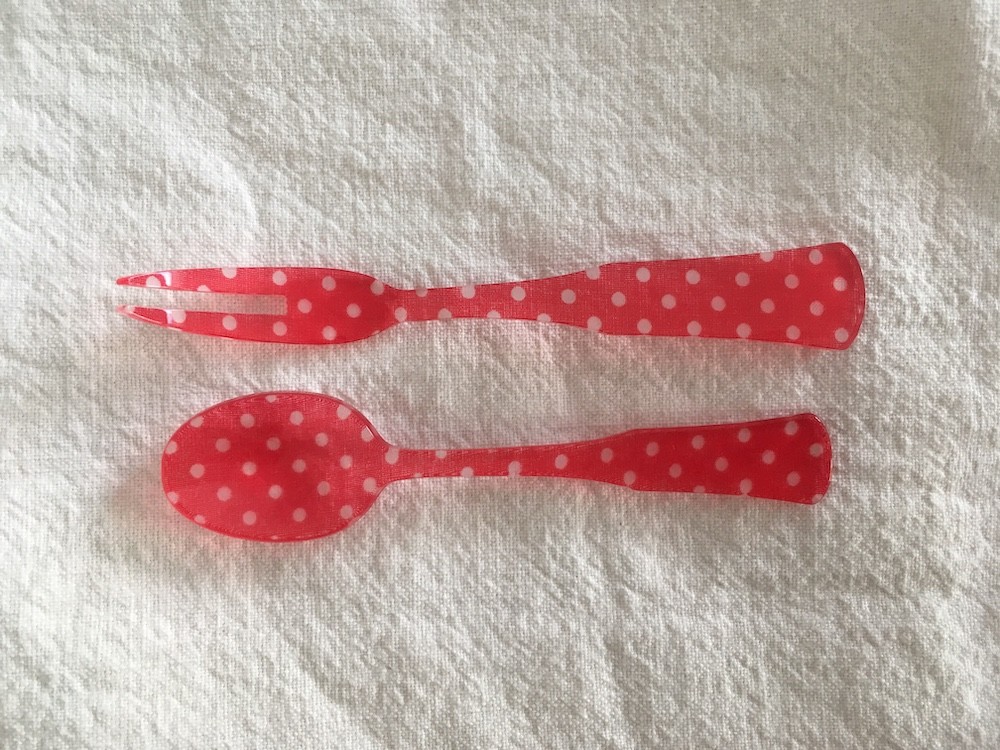 사브르만의 아크릴 가공 기법으로 만들어진 스푼과 포크예요. 아크릴 사이에 아주 얇게 천을 집어넣어 가공한 것으로, 모양이 까지거나 벗겨질 염려 없이 오래 사용하실 수 있어요.
