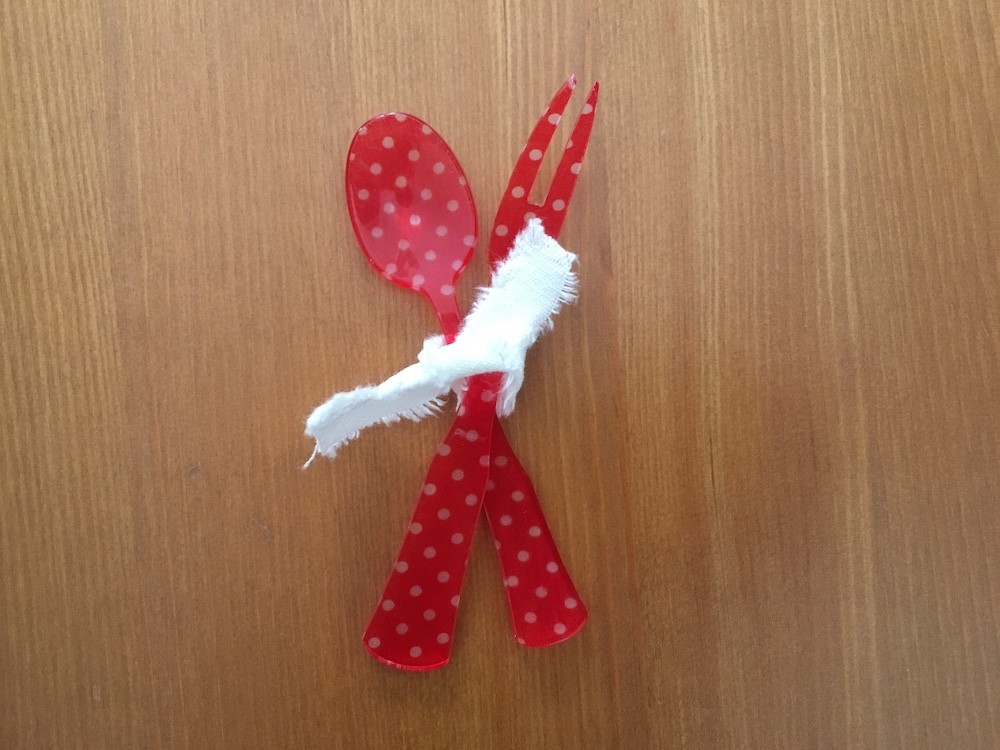 프렌치 커트러리 브랜드 사브르 파리(SABRE PARIS)의 티스푼과 포크 세트 중 빨강 도트입니다.