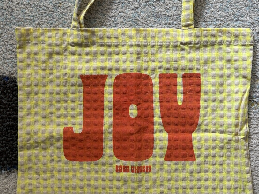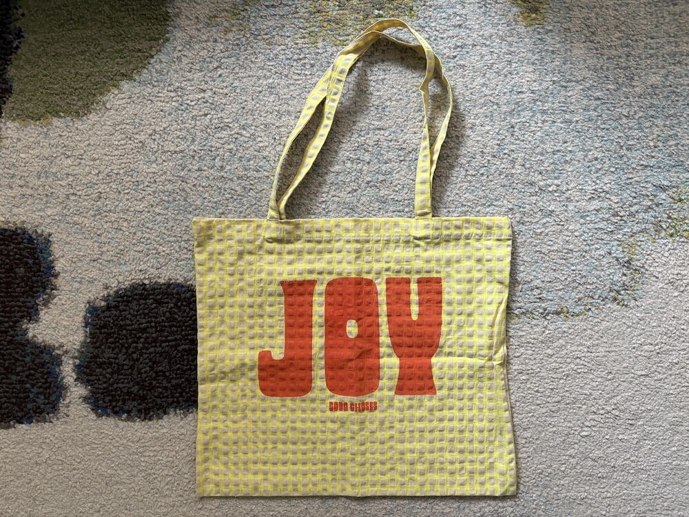 깅엄체크 소재에 조이라는 글씨가 프린트된 제품입니다.