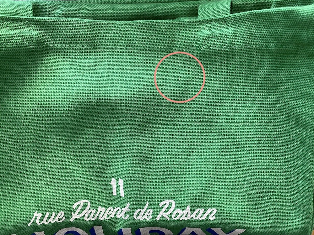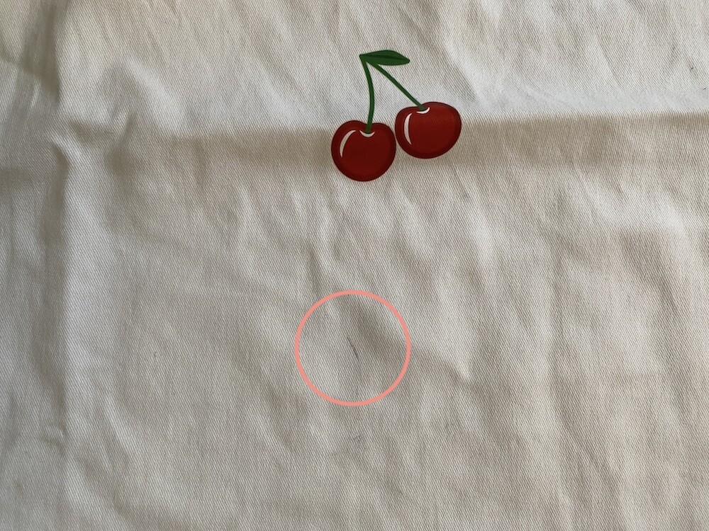 원단에 전반적으로 토마토 프린트에서 묻은 이염이 은은하게 있습니다.