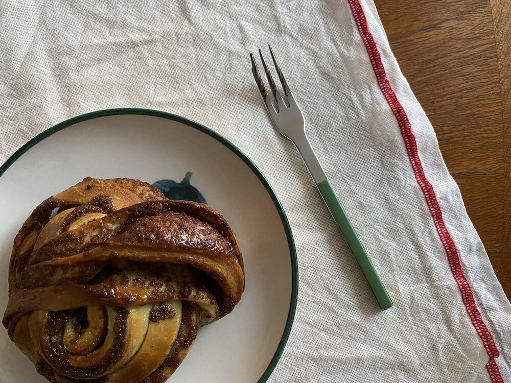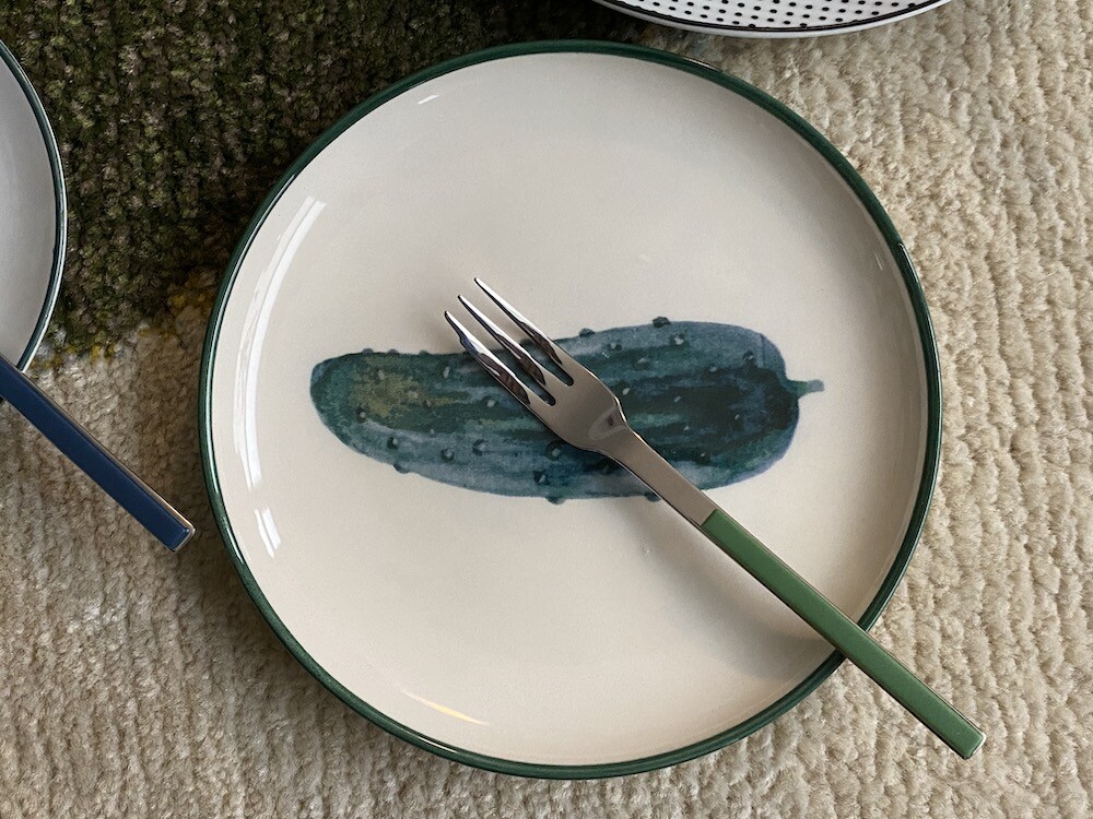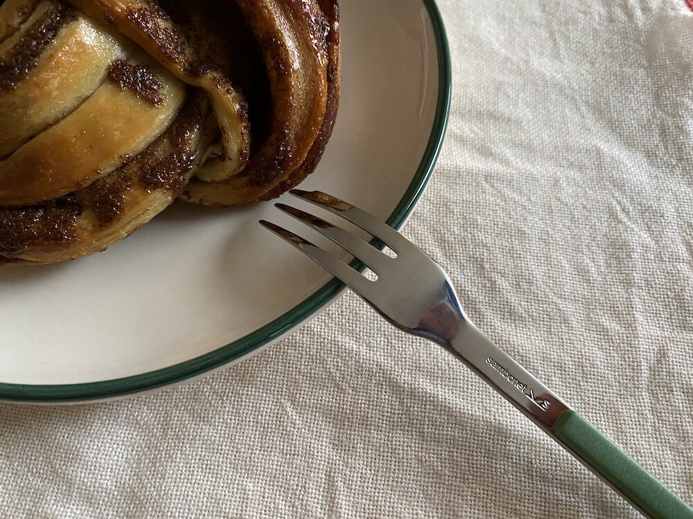 스테인리스와 색깔 있는 손잡이의 조화가 예쁜 포크예요. 손잡이 부분은 색이 쨍한 게 아니라 조금 흐릿한 느낌이 들어서 어떤 디저트와 함께 놓아도 다 잘 어울리더라고요.