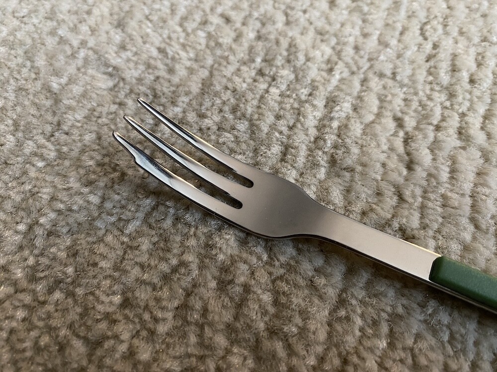 특히 이 포크는 케이크 전용으로 나온 제품이라 포크의 창 부분이 특이한데요. 자세히 보시면 맨 왼쪽 창은 모양이 한 번 꺾어져 있어요. 이런 디자인은 케이크를 먹을 때 칼 없이 케이크를 자를 수 있도록 케이크 포크에만 나오는 디자인이라고 해요.