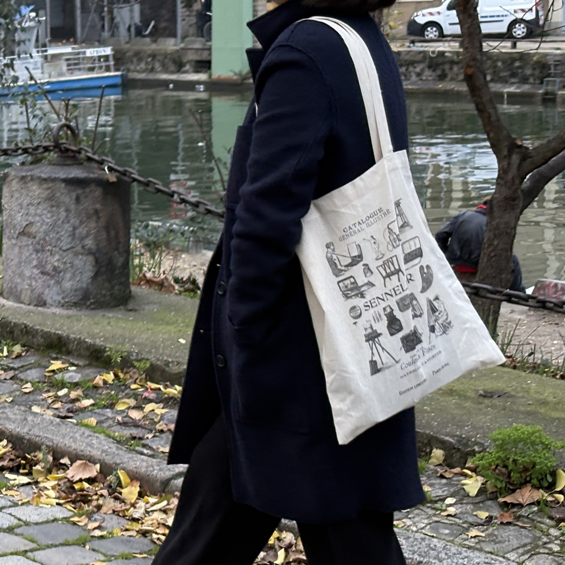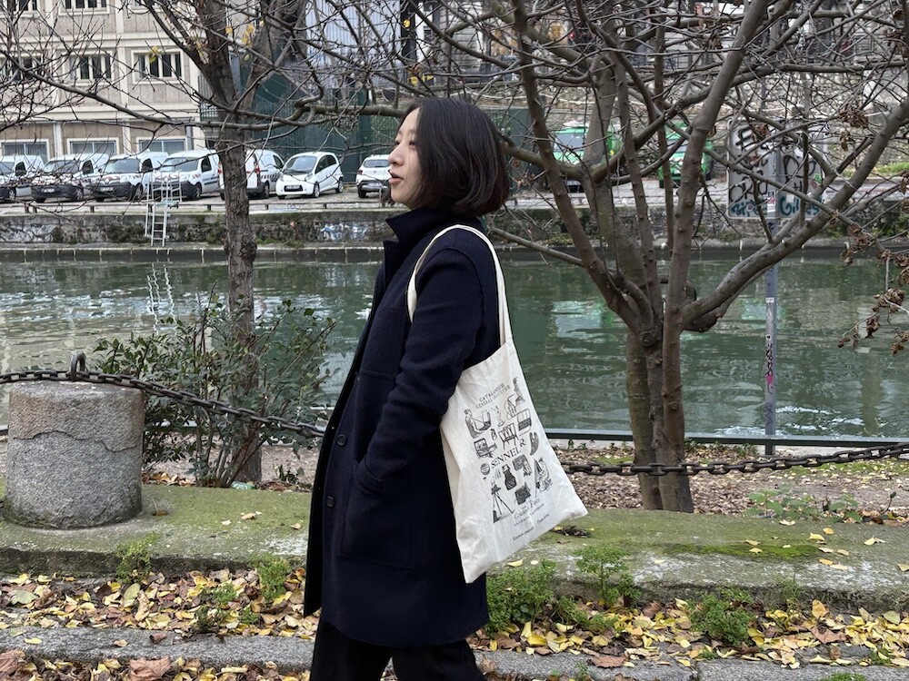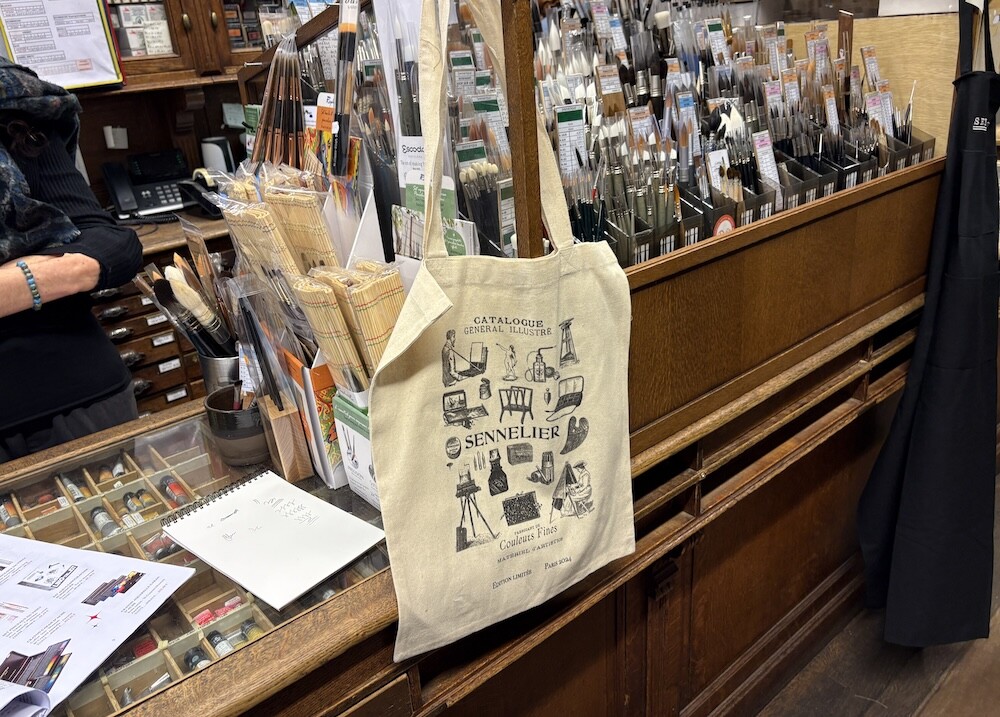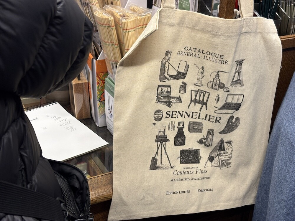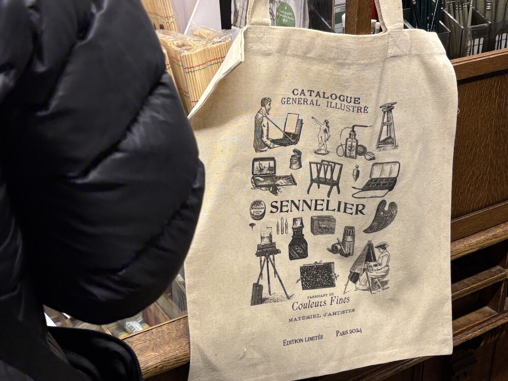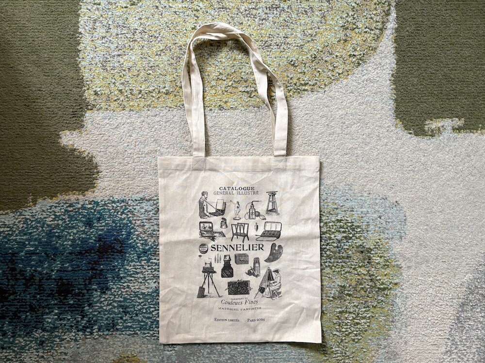 다양한 미술 관련 도구들이 그려진 에코백이에요. 한쪽 면에는 그림으로 그려진 카탈로그가, 다른 한쪽 면에는 세늘리에 화방의 이름과 주소들이 써져 있는데요. 파리 느낌이 물씬 나는 그림체가 너무 예뻐요. 이 에코백은 2024년에 나온 제품인데, 저는 며칠 전에 화방에 들렀다가 이제서야 발견을 해서 진행하게 되었어요.