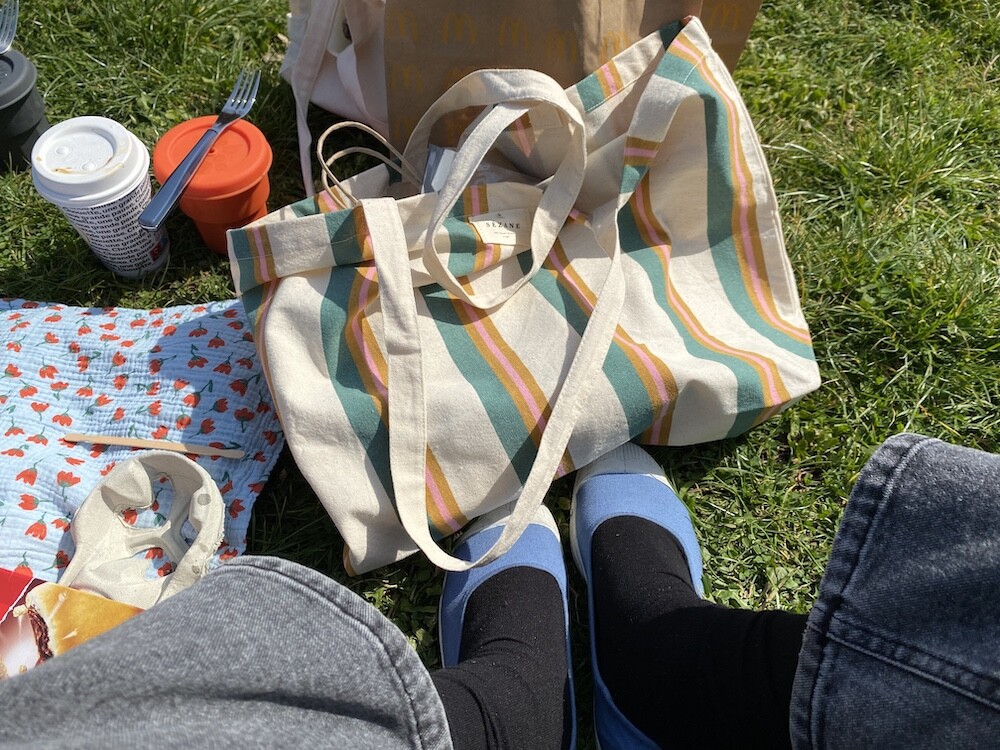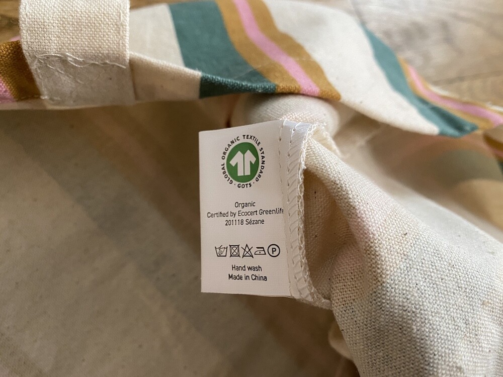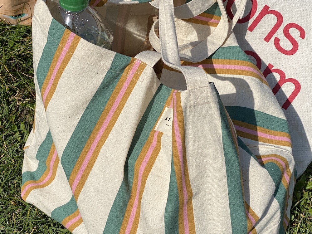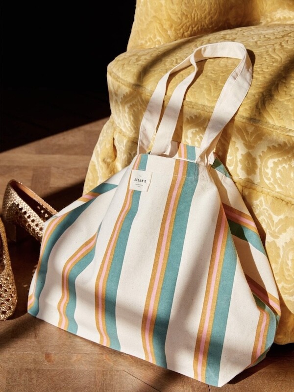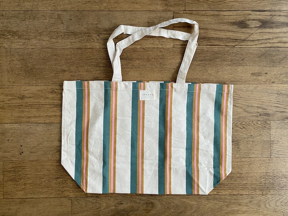 이 에코백은 세잔의 대표 에코백 디자인 중 하나로, 매 시즌 같은 사이즈에 원단만 다르게 하여 나오는 제품이에요. 매 시즌 한정 수량만 나오기 때문에 수량이 많지 않고, 시즌이 끝나고 나면 같은 제품은 나오지 않기 때문에 희소성이 있어요. 은은한 민트, 겨자, 분홍색의 줄무늬가 조화롭게 프린트된 원단과 무심한 듯 박음질 된 세잔 로고 택이 정말 예뻐요.