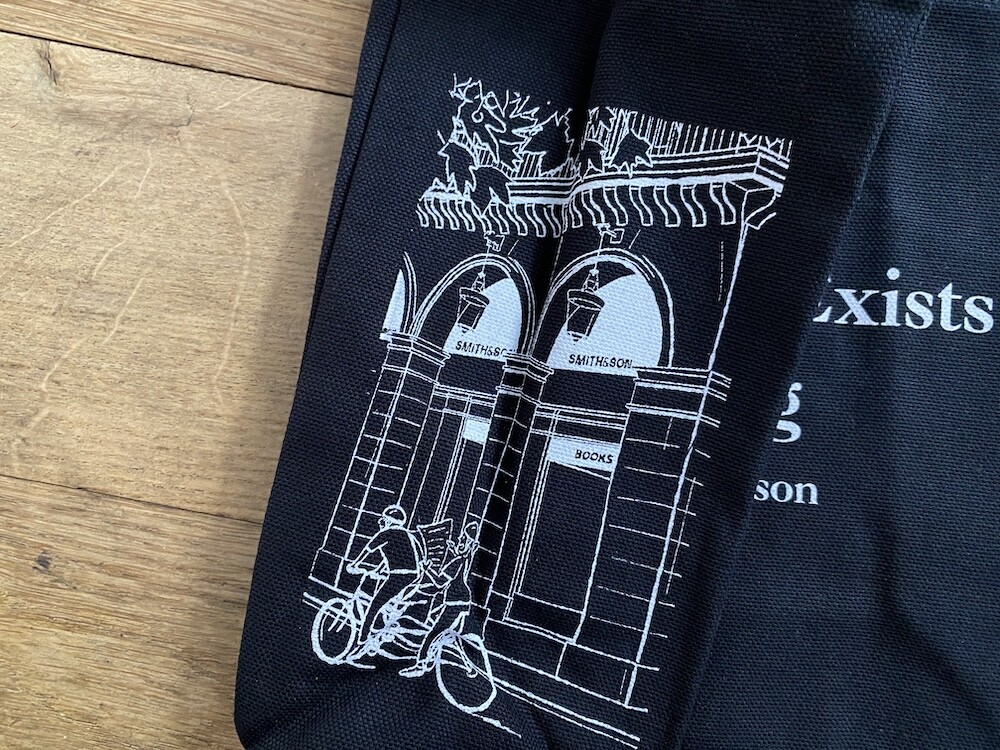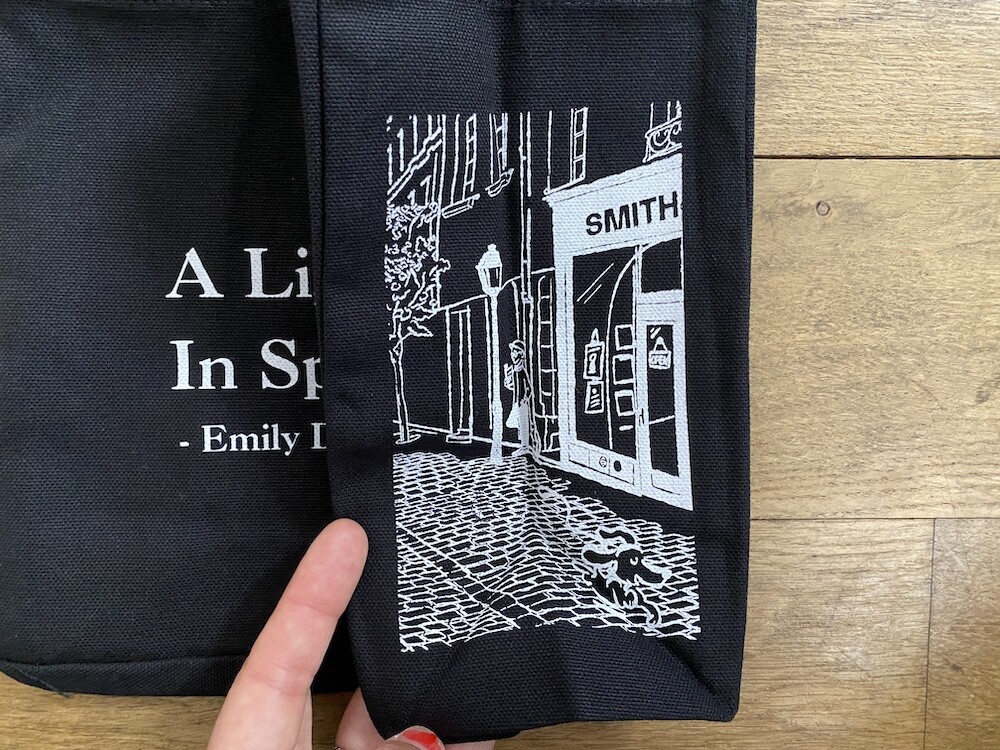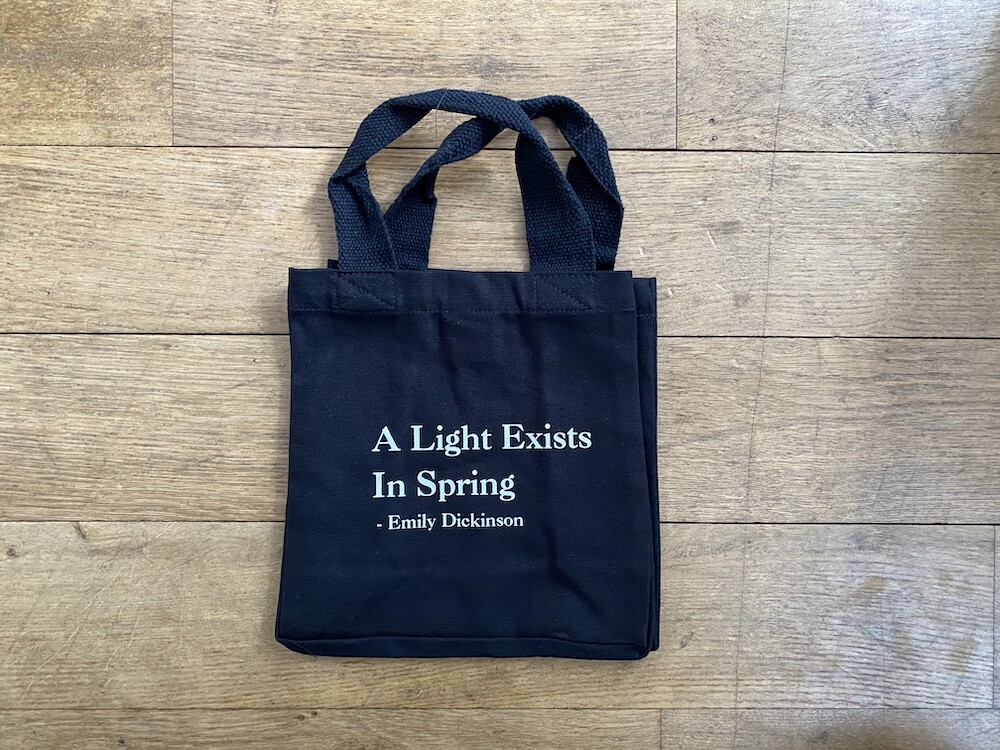 여러 권의 책을 넣기에 좋은 사이즈의 북 백입니다. 한쪽 면에는 책방의 이름이, 한쪽 면에는 시인 에밀리 디킨슨(Emily Dickinson)의 유명한 시 중 하나라는 'A Light exists in Spring(봄에는 빛이 있다)'라는 문장이 프린트되어 있어요. 이 시는 '봄에는 다른 계절에는 존재하지 않은 특유의 빛이 있다.'는 이야기를 하고 있다고 해요. 특히 이 가방은 특이하게 서점 그림이 옆면에 그려져 있어요. 그래서 가방의 앞에서는 보이지 않고 옆에서 봐야만 그림이 보여서 독특하더라고요.