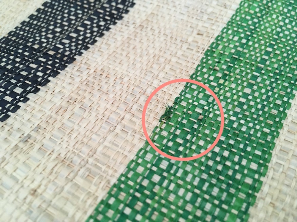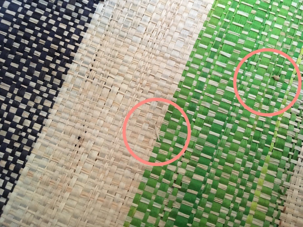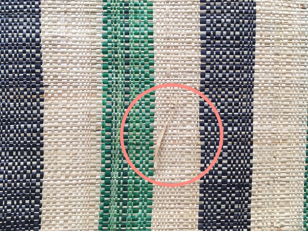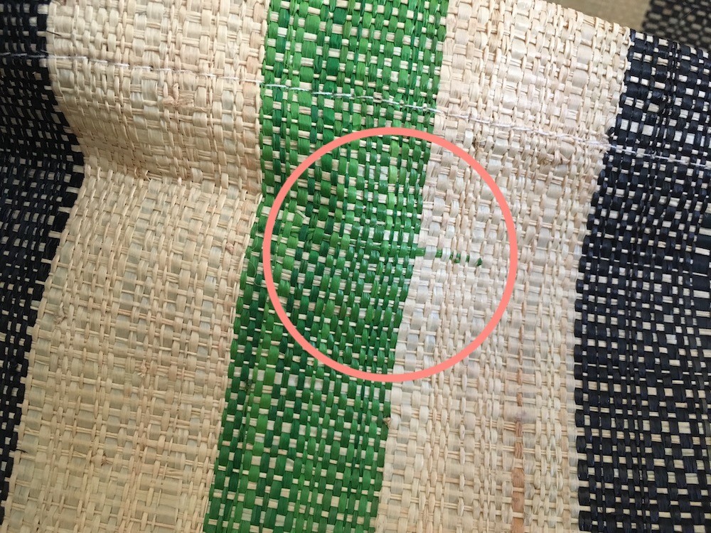 소재의 특성상 라피아 섬유가 튀어나오거나 줄무늬가 엇갈린 부분들이 있어요. 이 부분은 자연스러운 현상으로 불량 사유가 아니며, 이로 인한 교환 및 환불은 불가합니다.